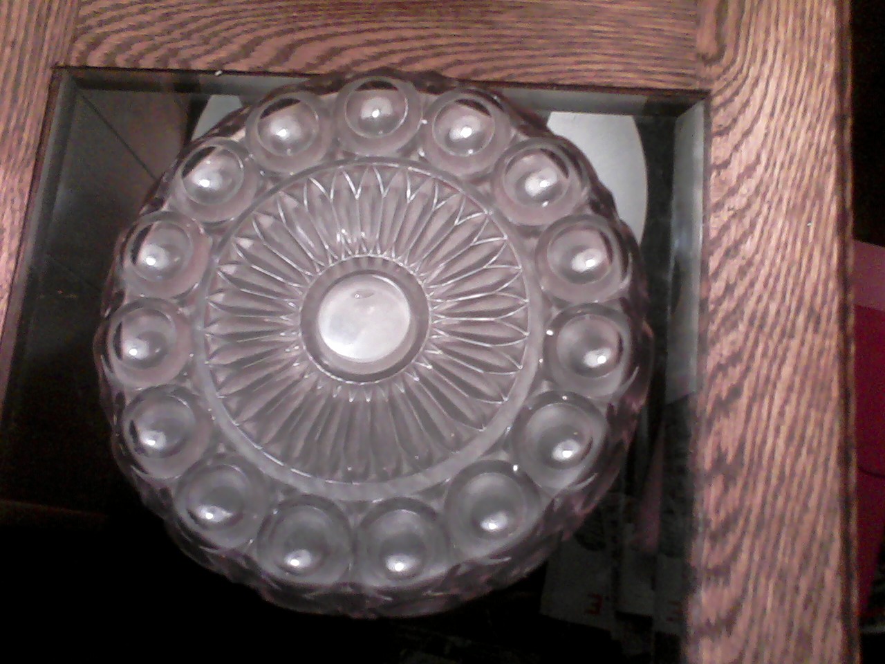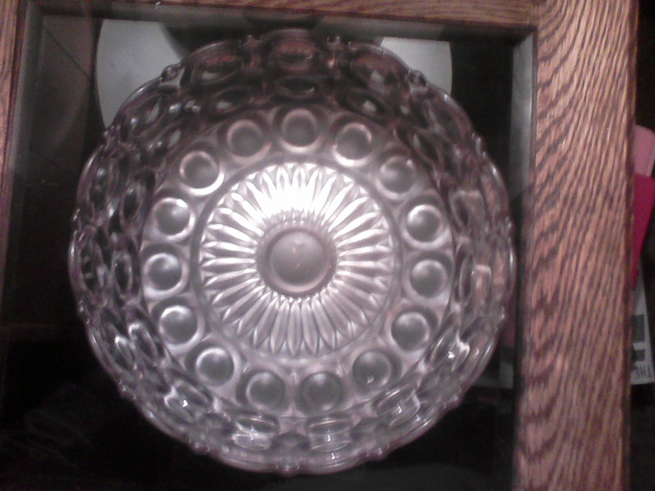 My mom recieved this bowl from a friend in 1936. The woman who gave it to her was almost 100 yrs. old at the time. She had had the bowl most of her adult life. Whyen the bowl is set in sun light, it turns a lavender color. I had it looked at once by an appraiser and was told it was pre-civil war. There are no manufacture marks on it at all.