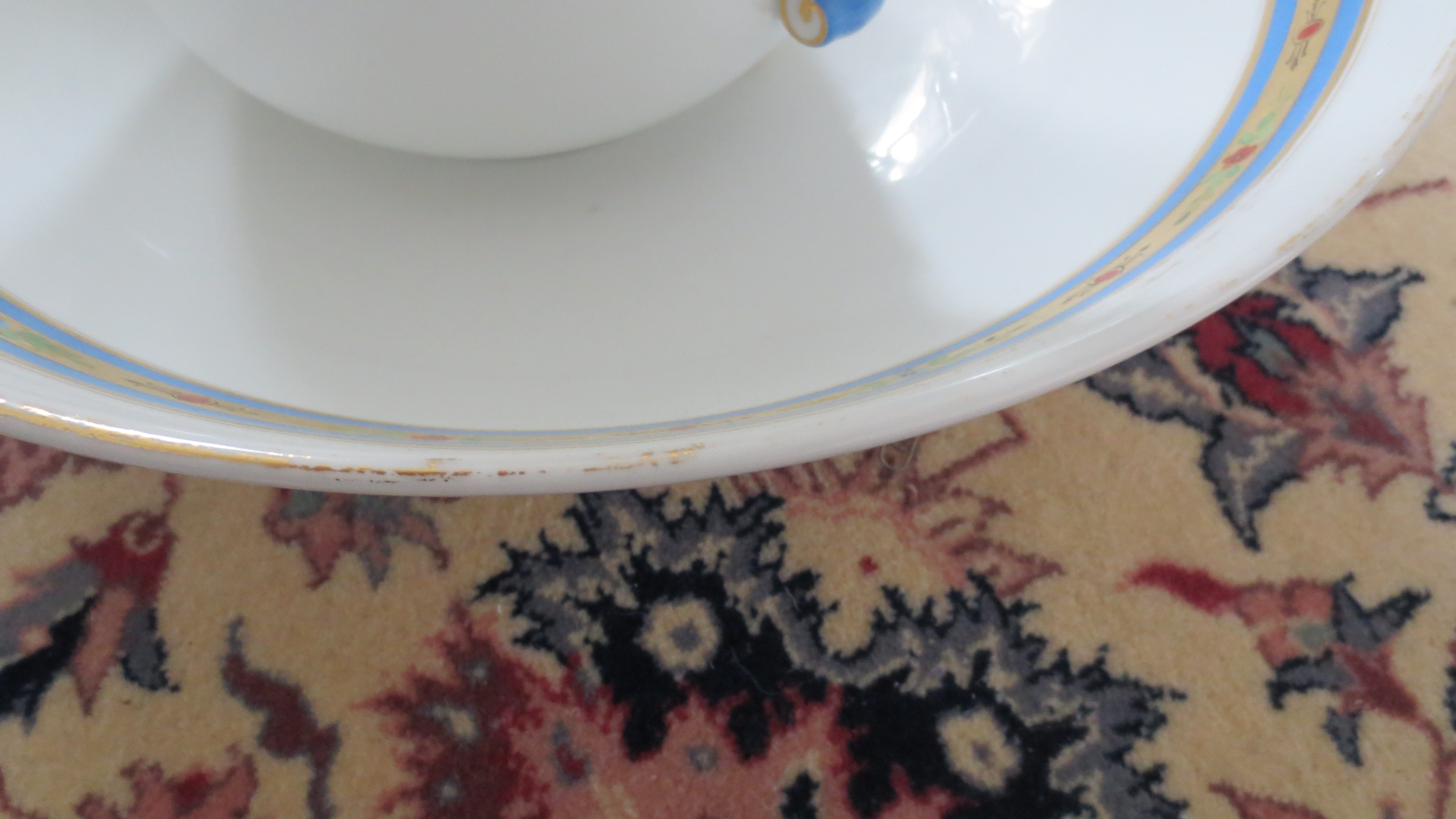 I tried to photograph the marking on the bottom looks like a DT. It has gold trim, I don't know if it is real gold or just paint. I tried to photograph wear marks. Has a Greek style to it, at least the colors.