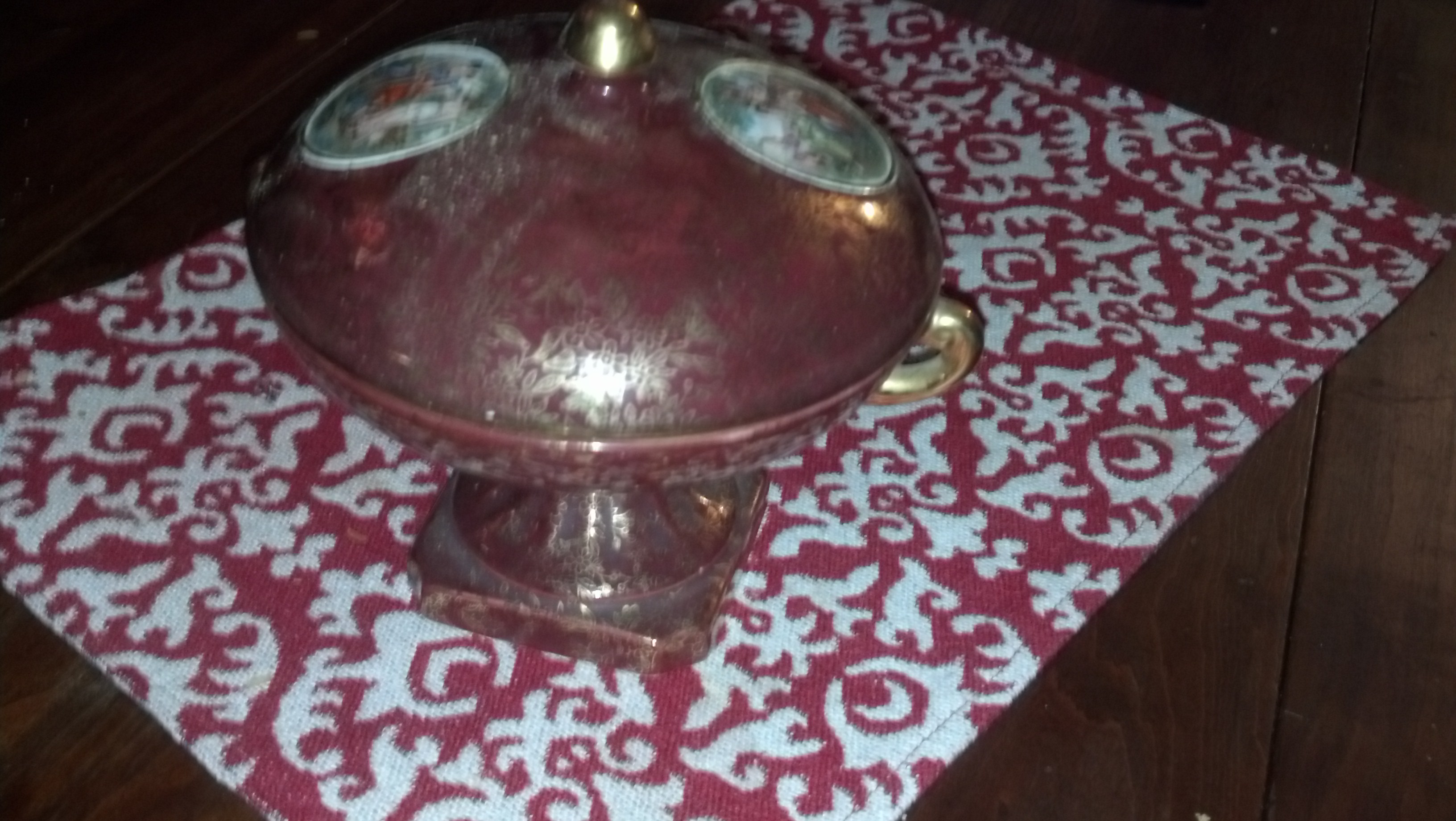 This appears to be a compote. Can you add the dimensions and additional photos? It doesn't appear to be transluscent, so maybe ironstone. How much does it weigh? What is pictured in the inserts? Does in look like someone painted over the design?