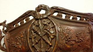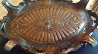 This bowl is with a matching mirrored tray. It appears to be bronze, but I am unsure. There are grapes and what looks like acorns on both the bowl and tray. A lion's head is in the middle of the edge of the tray.