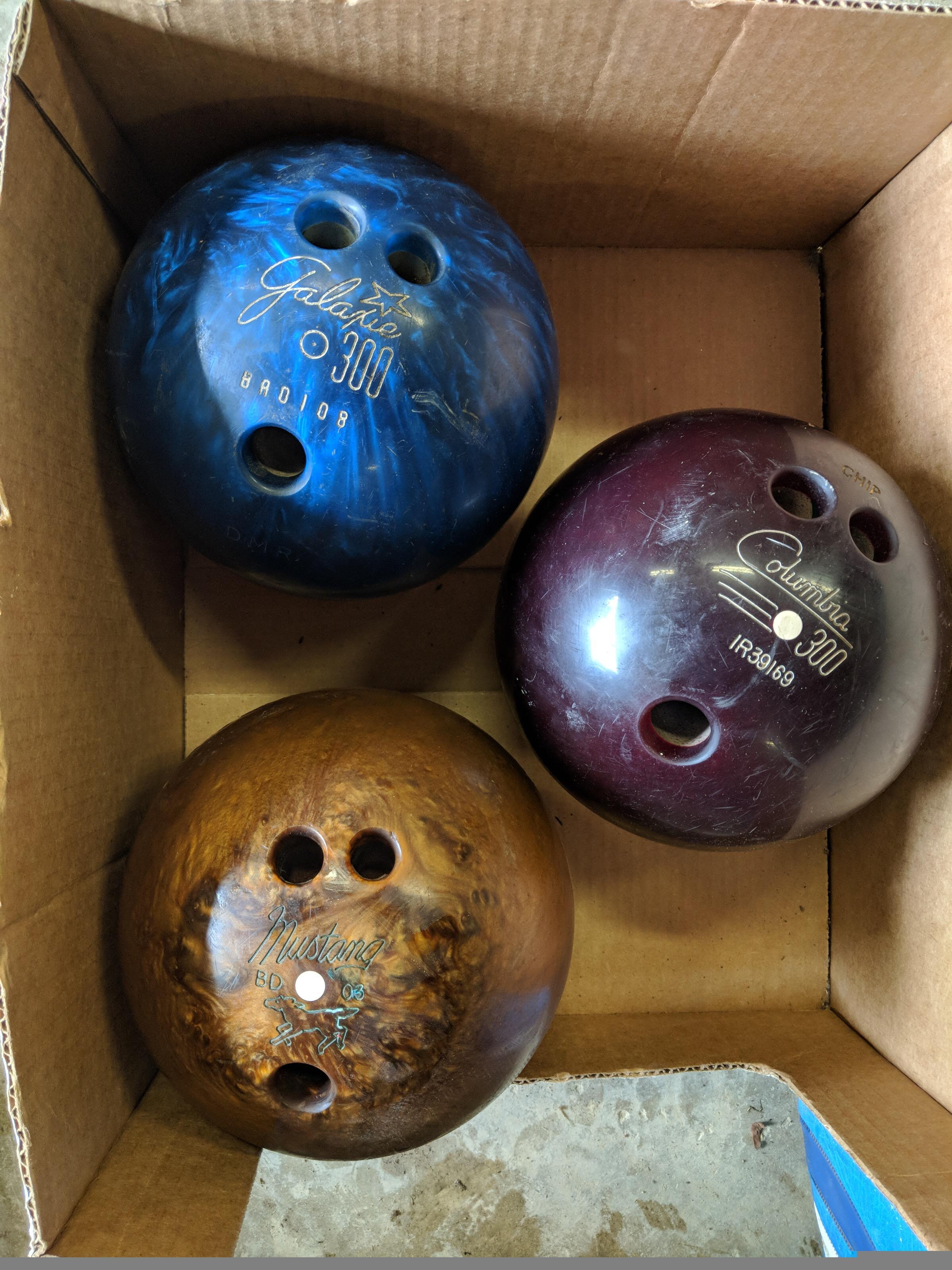 These were my parents bowling balls. They used them in the 80’s. Unsure of the weights and finger hole sizes. Decent condition