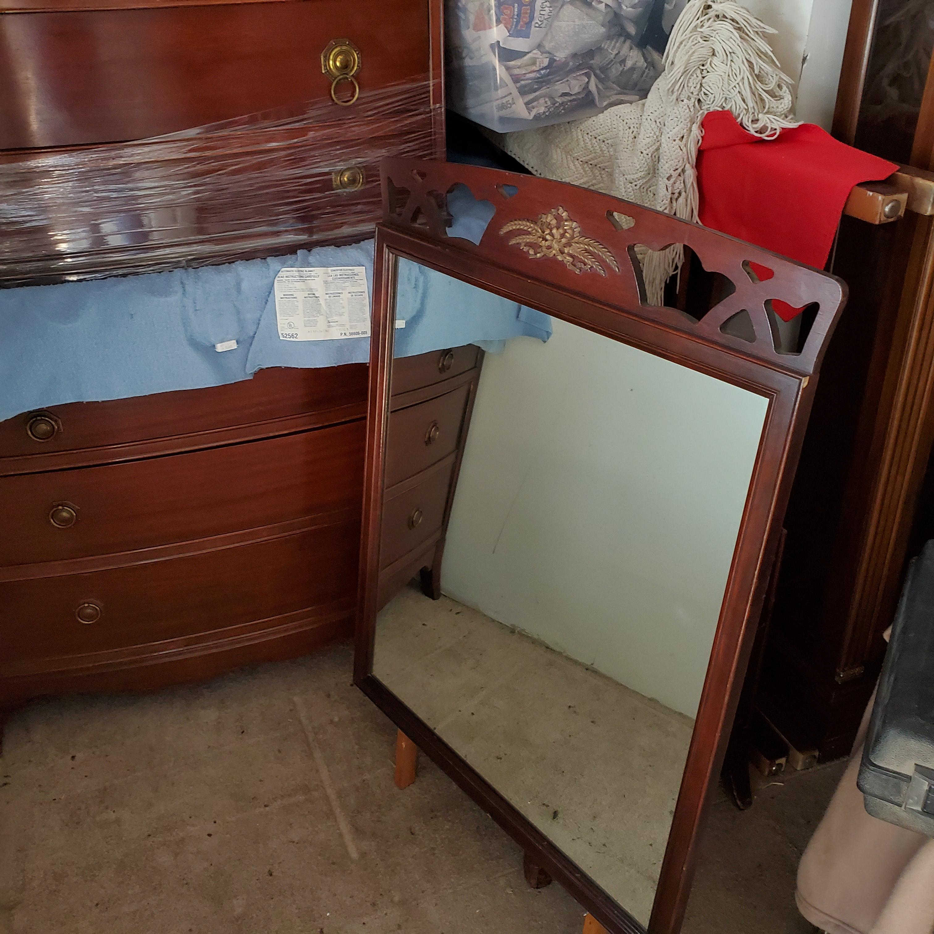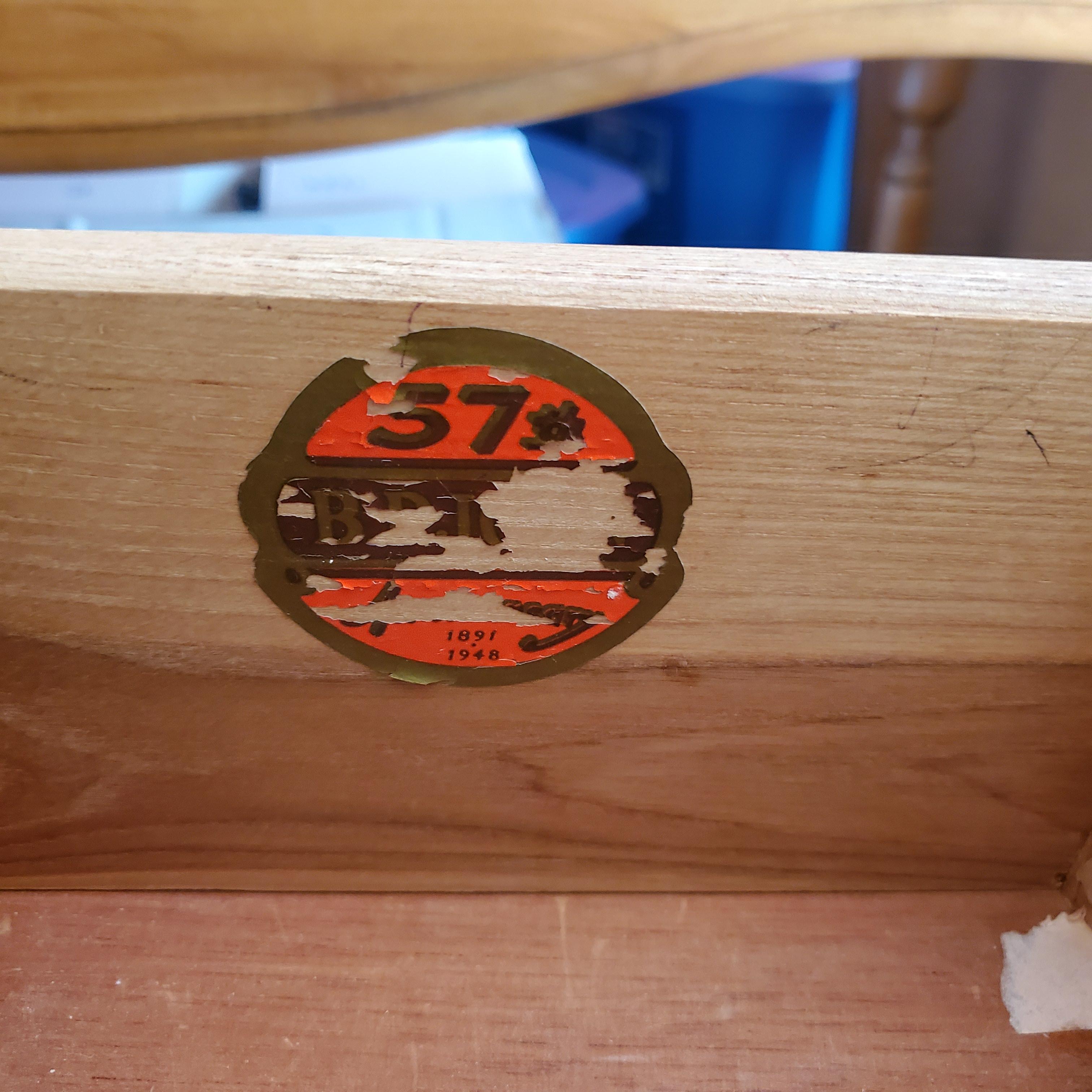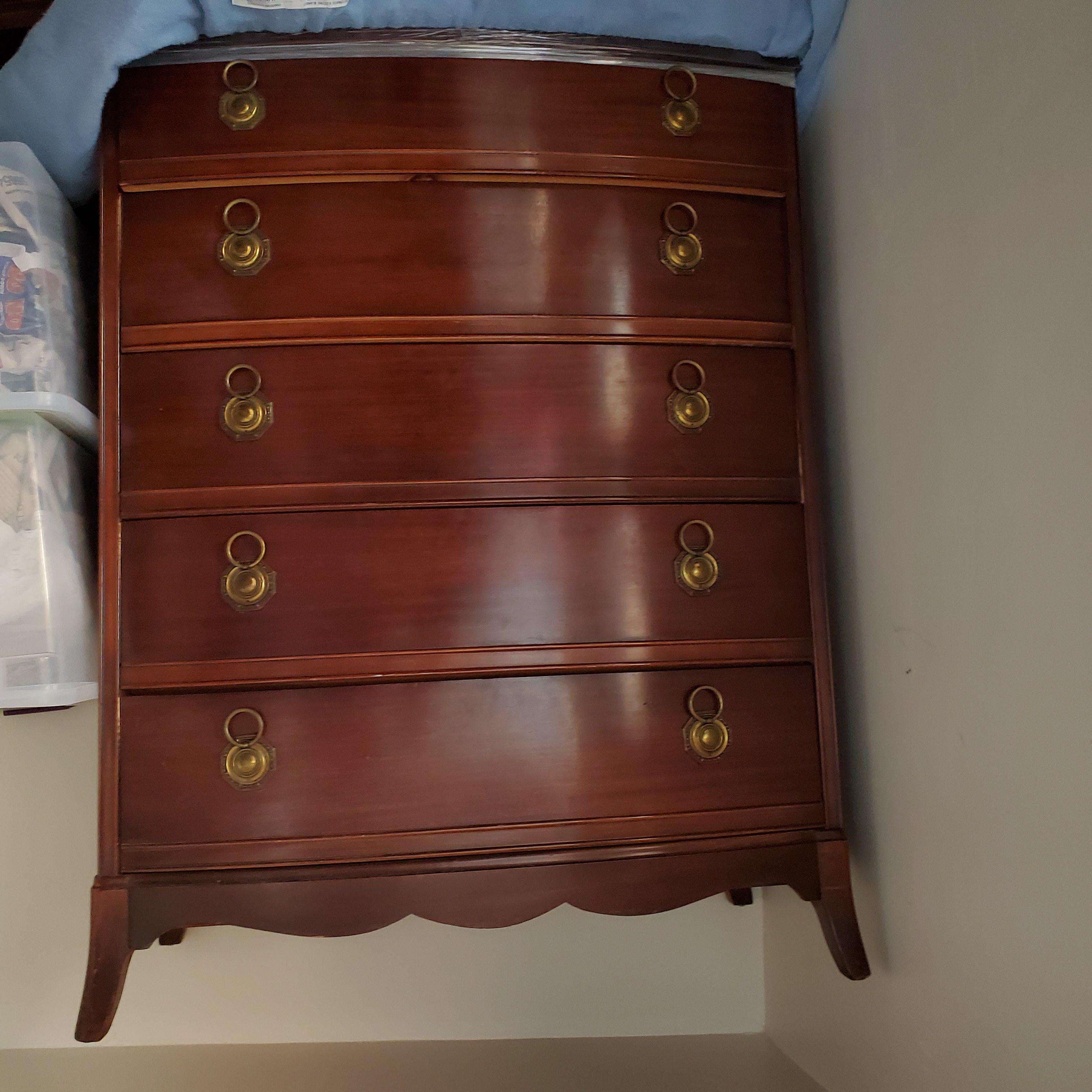 Bp john bedroom set. One long dresser 47" wide by 35" tall 4 drawer. Tall dresser 47" tall 36 wide 5 drawer. Night stand and vanity mirror. Two bedframes for twin bed. Stickers in drawer say 57th anniversary 1891-1948