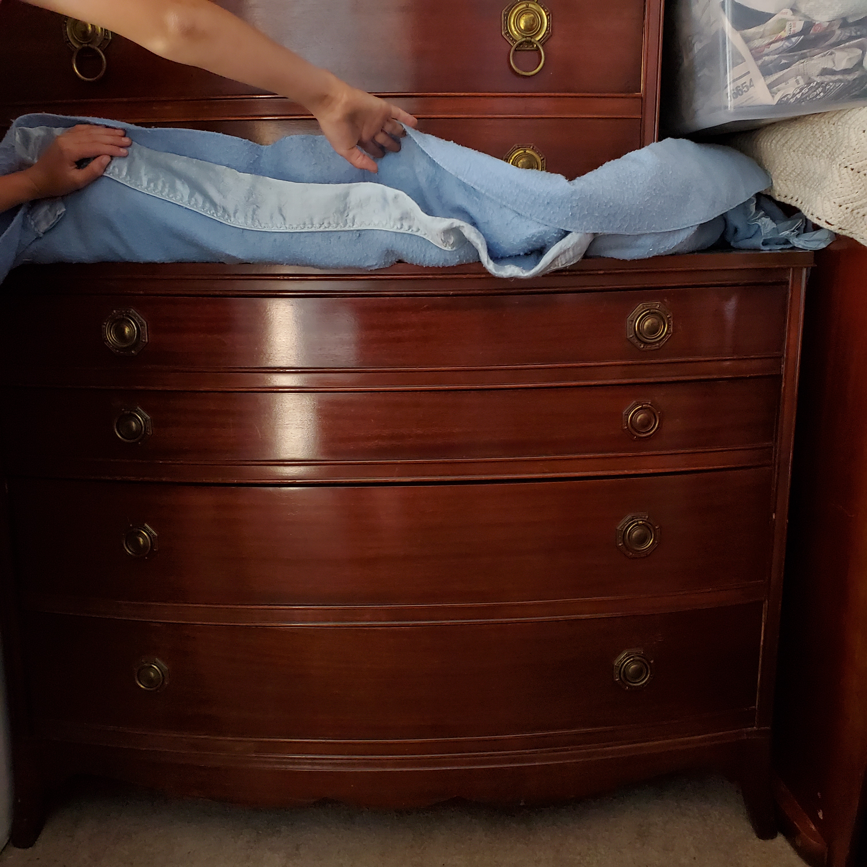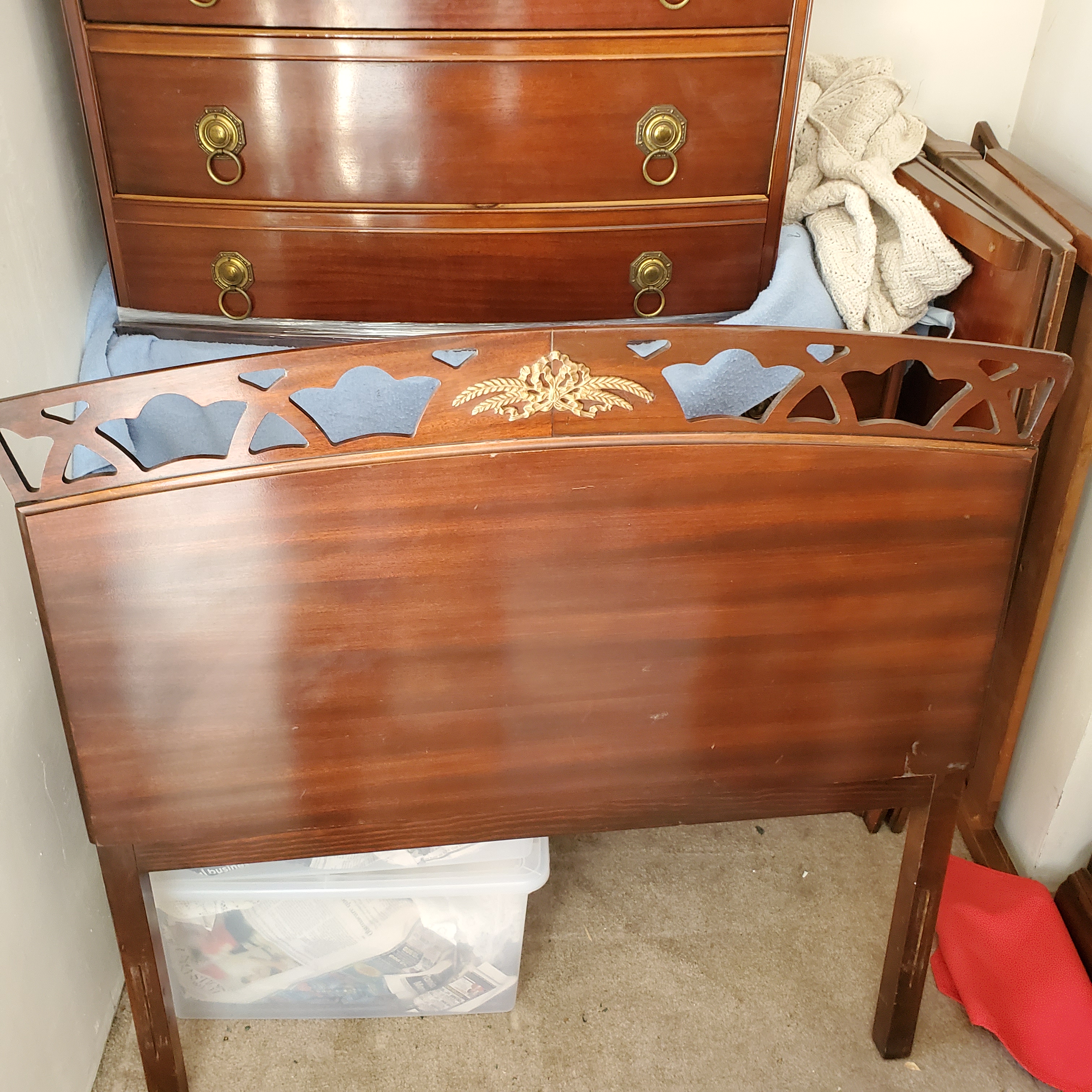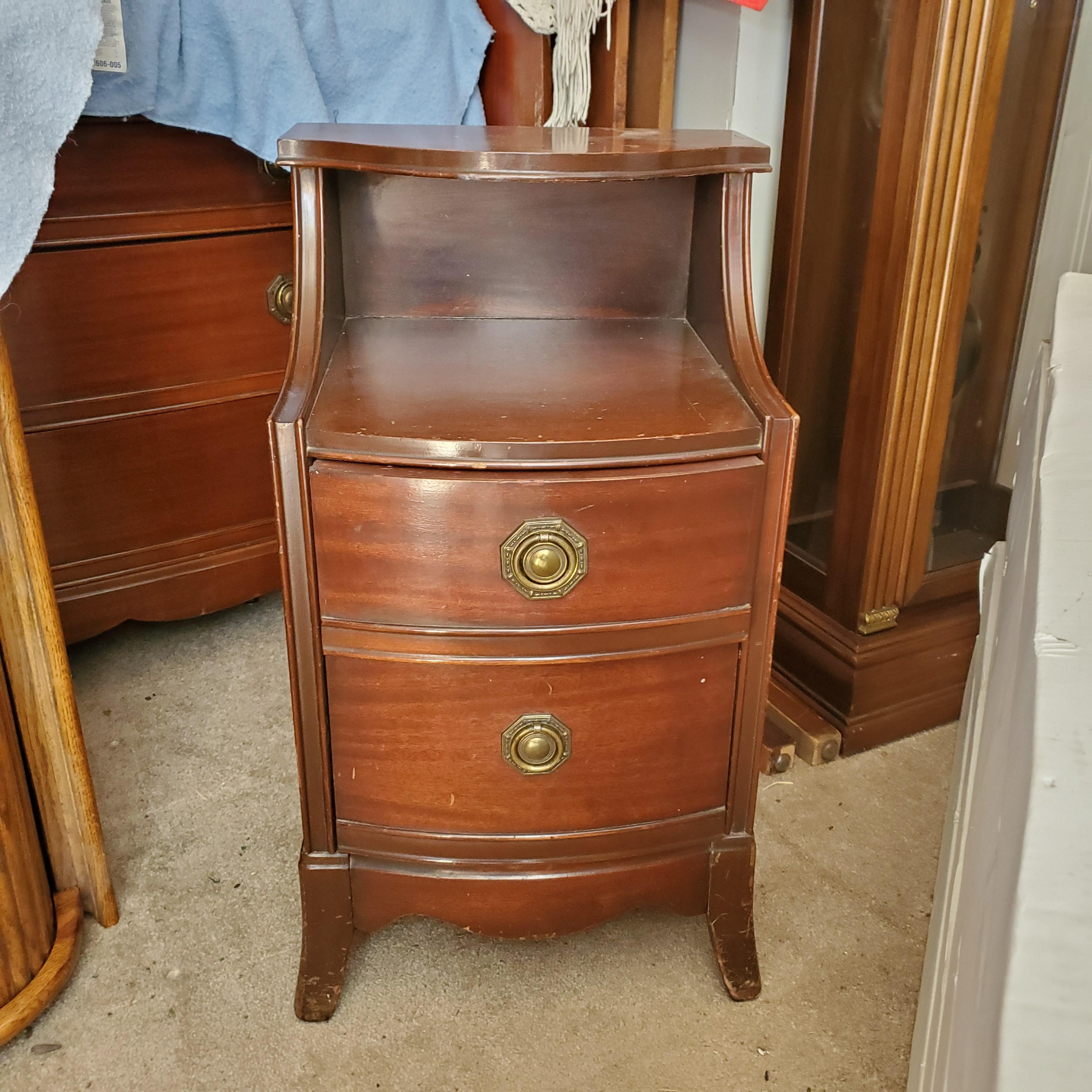 Bp john bedroom set. One long dresser 47" wide by 35" tall 4 drawer. Tall dresser 47" tall 36 wide 5 drawer. Night stand and vanity mirror. Two bedframes for twin bed. Stickers in drawer say 57th anniversary 1891-1948