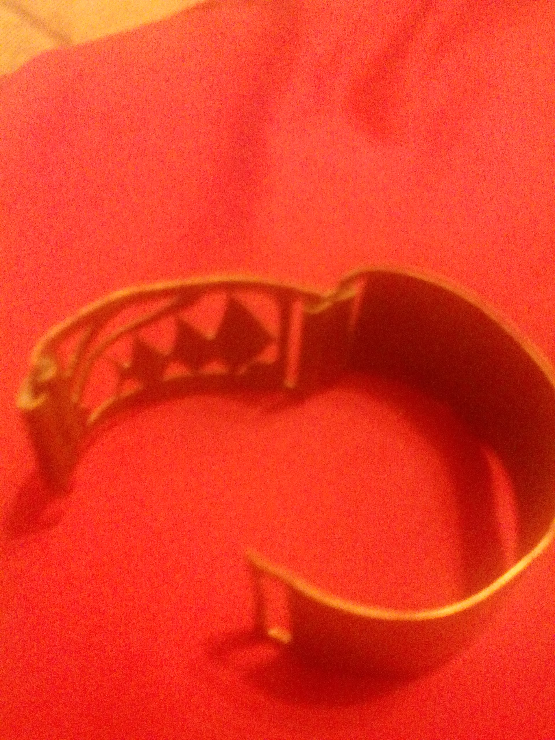 Where do i begin i found what looks to be hand made bracelet under a very early 1800s farm house.While digging out dirt from under house to lay plastic im not sure what type of metal it is a sort of copperish but has a goldish tinge it looks hand made clasp is just bent to c shape connected to one side goes through a slot on the other it has a designe on one side i small almost child size but im a small person on it will fit on my rist idont know what else to say its very plain and simple