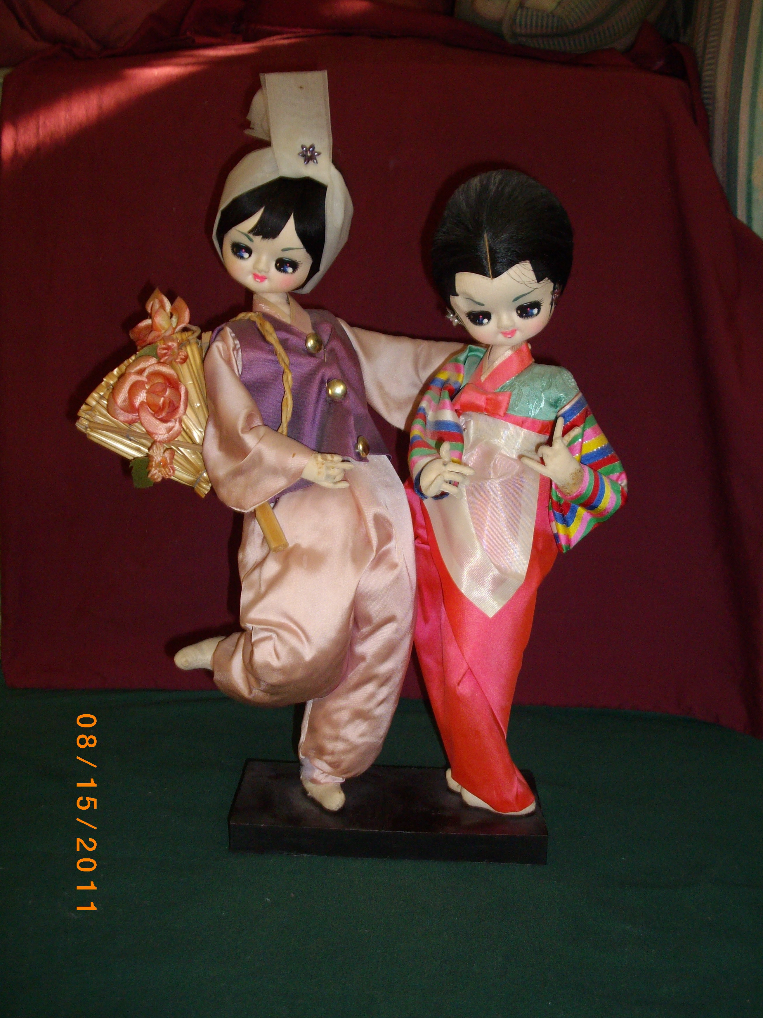 Do not really know much about these dolls, got them at a flea market, the person selling was selling their doll collection. There are no tags or marking on these dolls. These are very similar to the Bradley big eyed dolls so I am assuming these are Bradley dolls. The body is covered in stockinette. The materials looks like silk. The standing dolls are 12', the sitting dolls are 9" and the musical doll is 10".