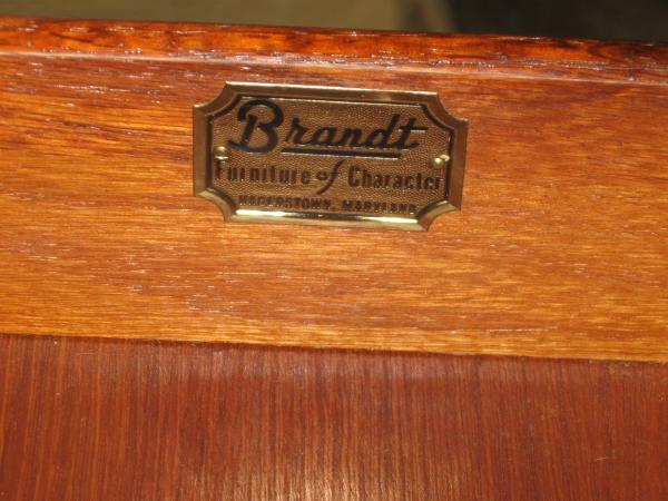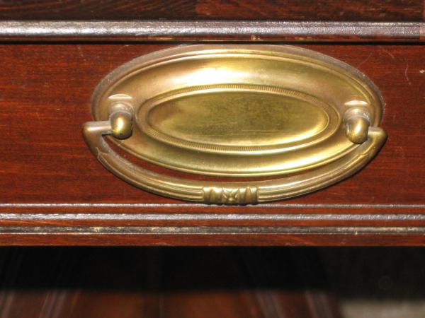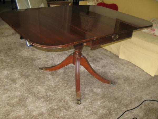 Mahogany drop leaf table. Oval drawer pull, brass feet