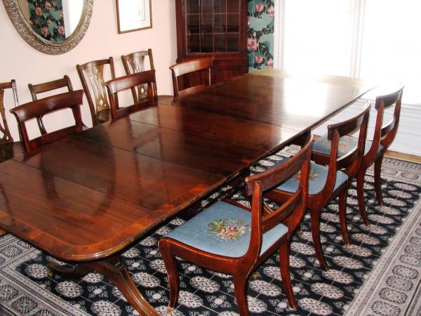 Brandt mahogany drop-leaf dining table with 4 additional center leaves. Outer edge of table has an approximately 2" burl walnut veneer inlay. Brass tips at the ends of all four legs. One drop-leaf is exceptionally sun-bleached and finish on that piece is very checked. Unknown if chairs are part of the original set.