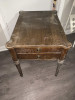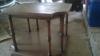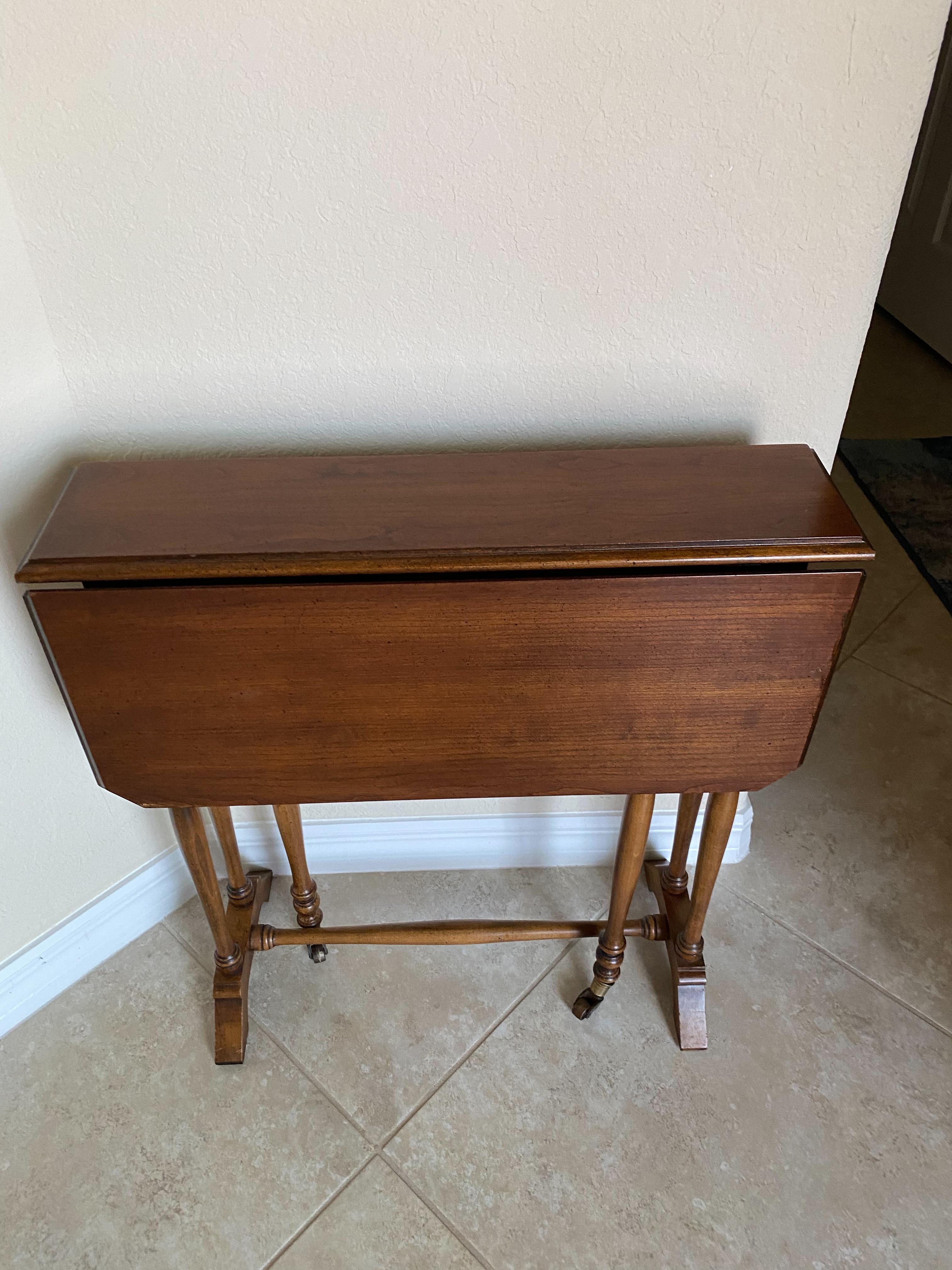 Brandt side table with pull out legs for leaves. Looks like oak?? 25" tall with brass wheels on pull outs. 5" wide with pullouts down 25" X 24" with everything out. Has 7240 written on bottom with Brandt metal logo attached.