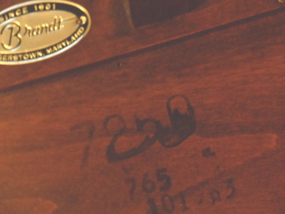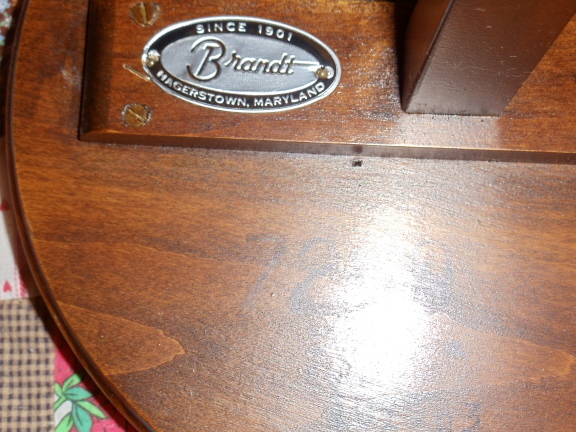 I have a table/plant stand that has label at the underside indicating Brandt Furniture, Hagerstown, Maryland and also has some numbers written on the wood itself on the underside also. It's a little metal tag with the furniture co. on it. It looks like the type of leather on the top of desks, that are on each round top of each little top. There are metal tips on the bottom of each leg. there are only 3 legs.The wood looks to be a mahogany finish. It's kind of light in weight. I am attaching a couple photos. I would appreciate anything you could tell me about it. I puchased it at a church rummage sale, very reasonable.