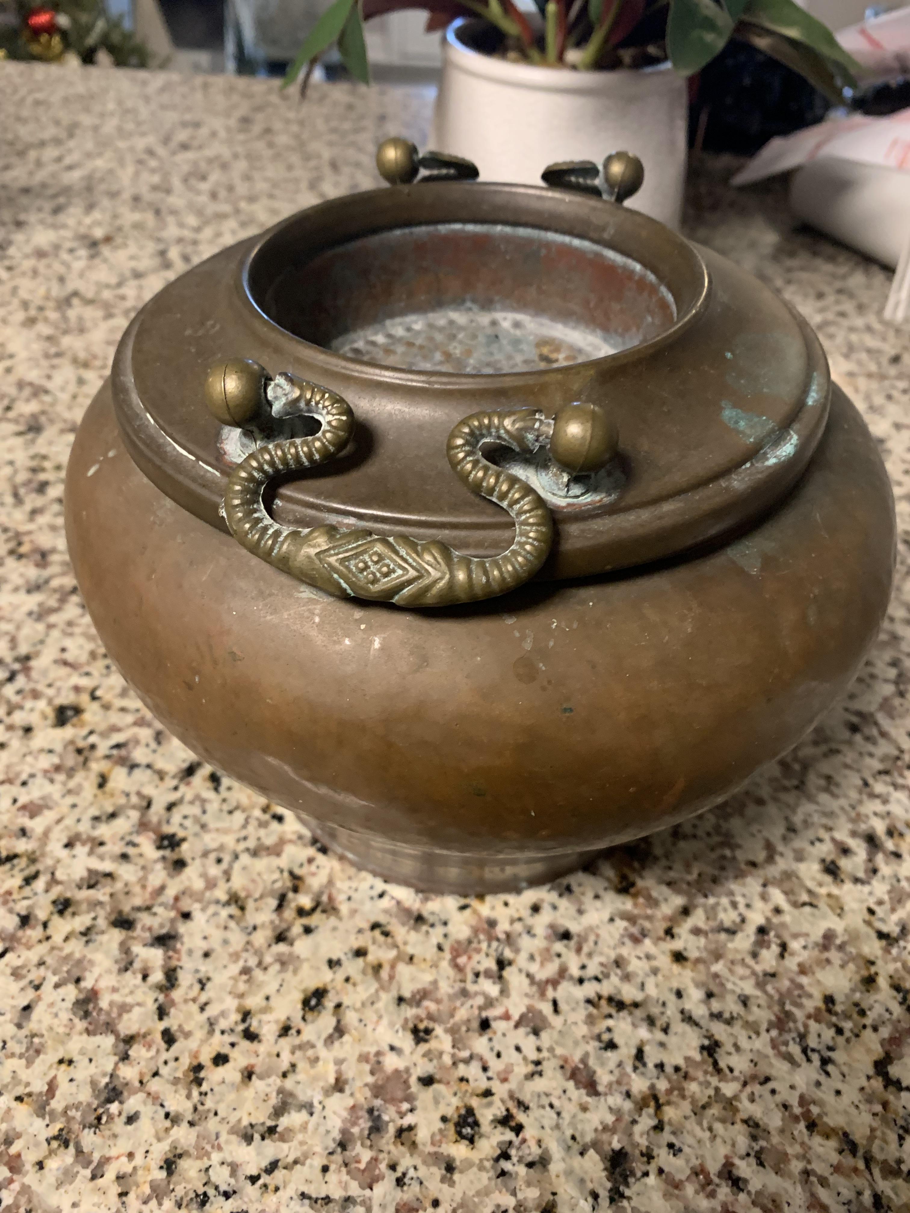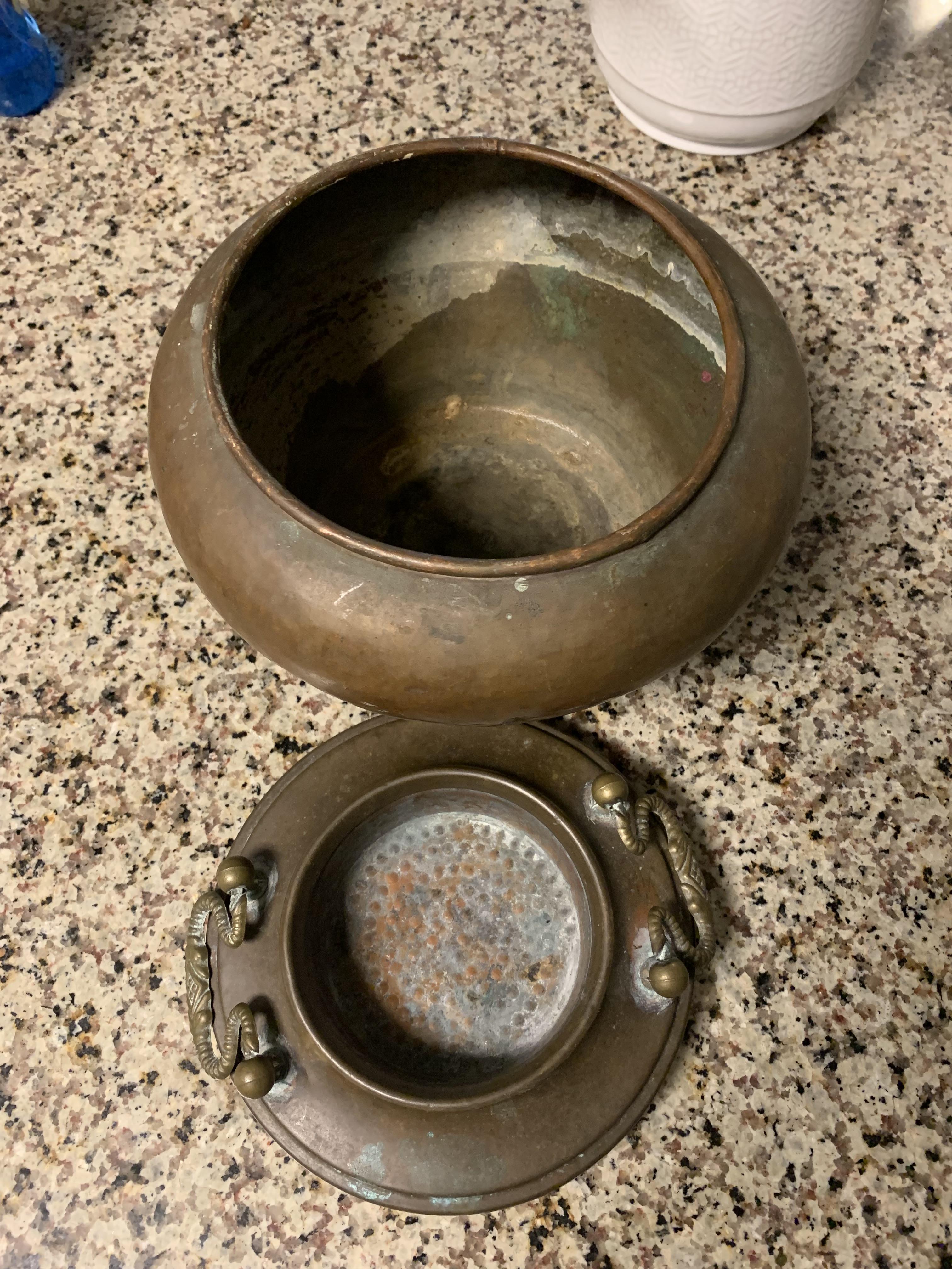 My grandparents have had this for 50+ years and I recently acquired it. It is brass and copper with a removable center. We are not sure what it exactly is and can not find any info on the hallmark.