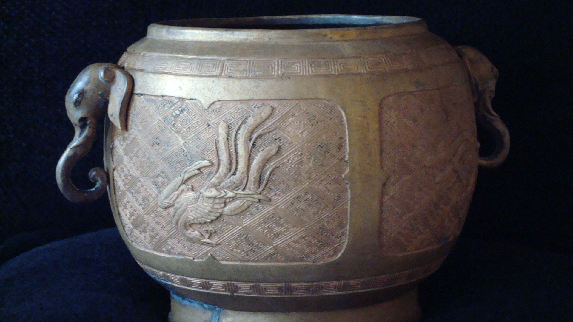 I have looked everywhere and cannot find this item anywhere. It has some of the same markings as the Chinese Censer. I think at one time there must have been a bottom to it but this is all it has with it. It is old and seems asian. It has some remarkable markings on it and what appears to be phoenix in each section, totalling 4 of the phoenix. The handles are elephants and it has some unique etchings on it.
