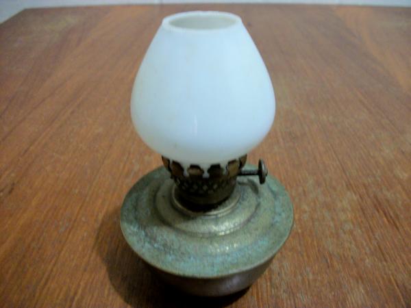 The small glass shade looks like an egg, the brass base feels heavy for its' size, it has a small wick adjustment wheel.