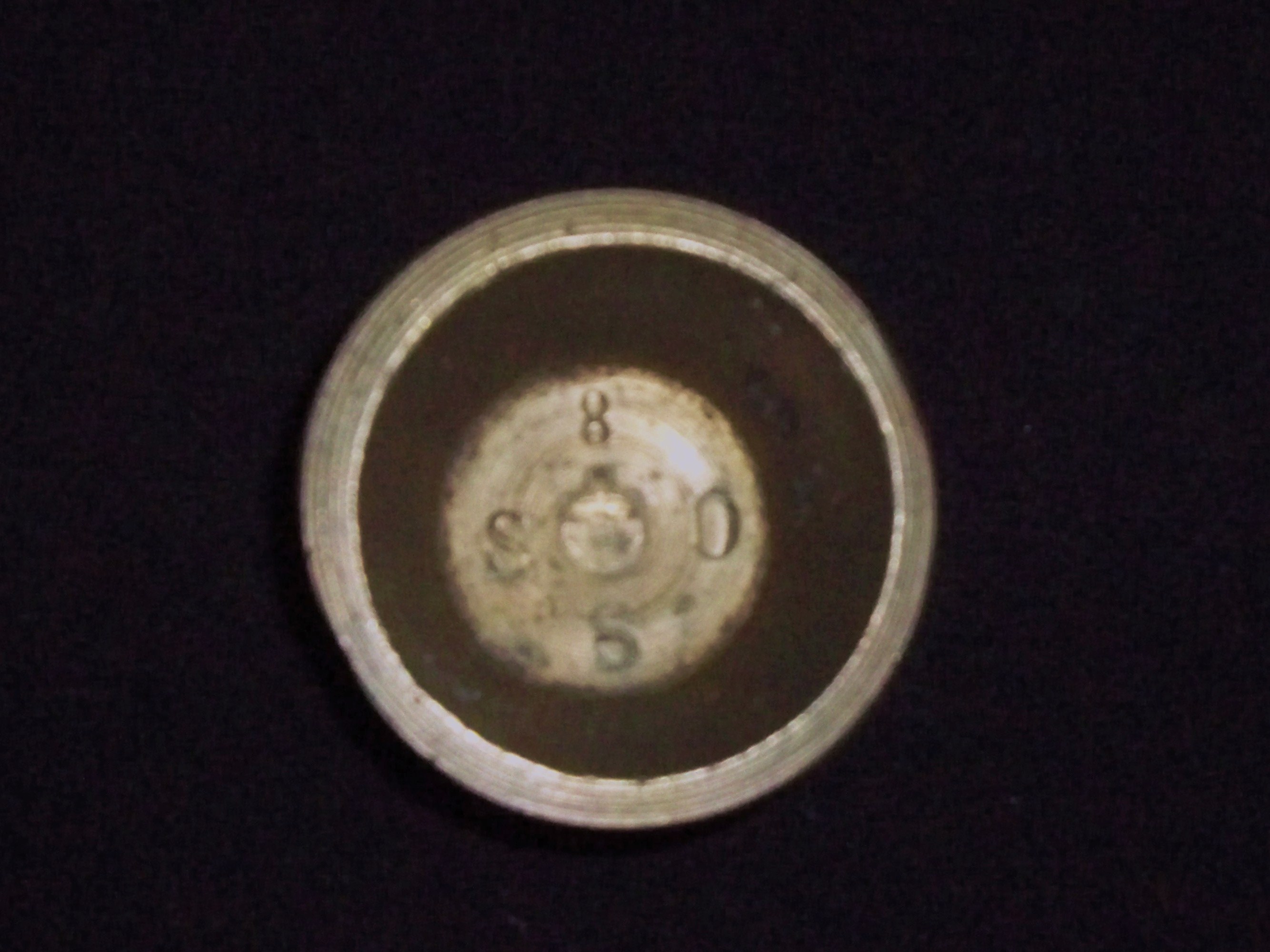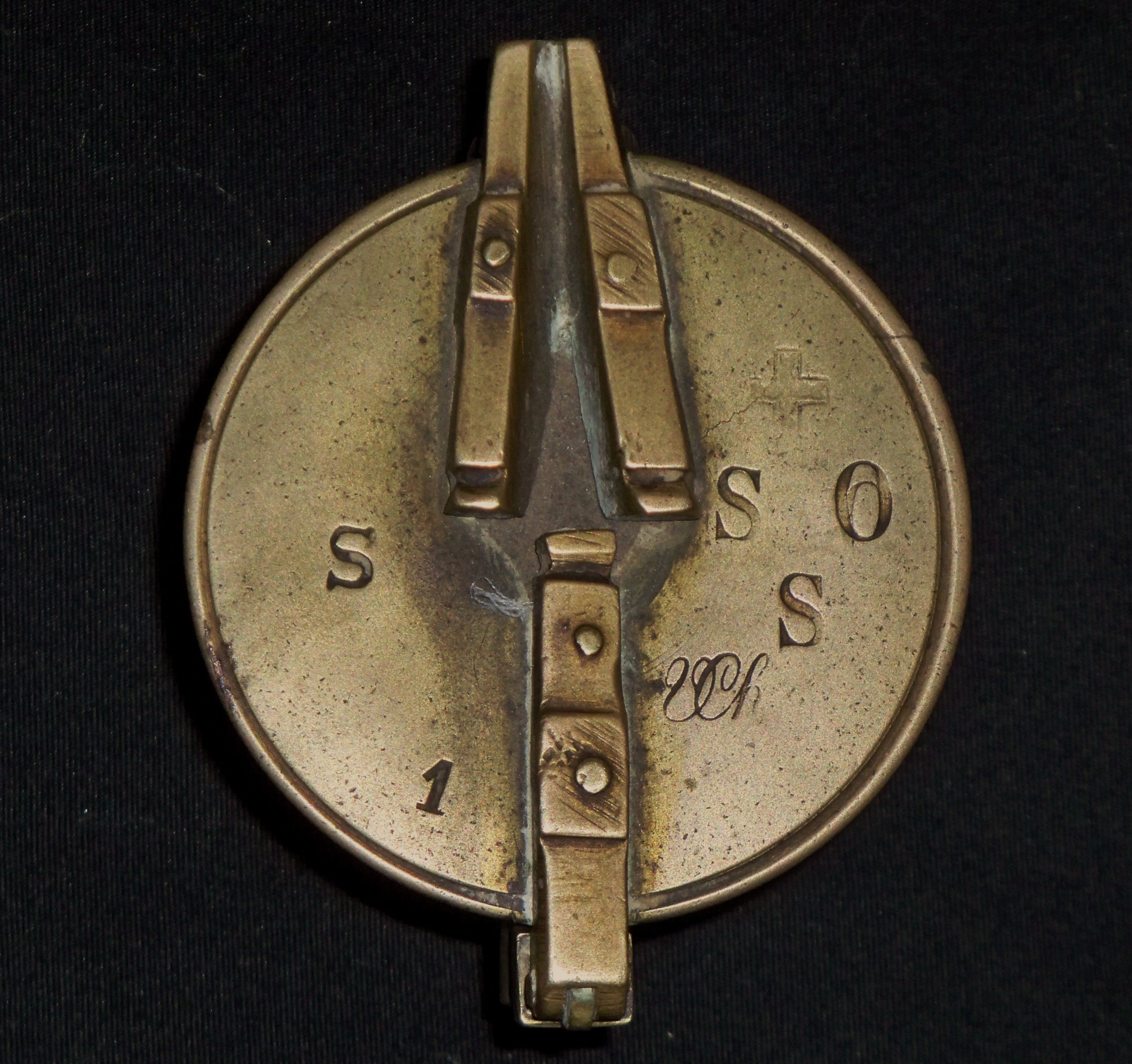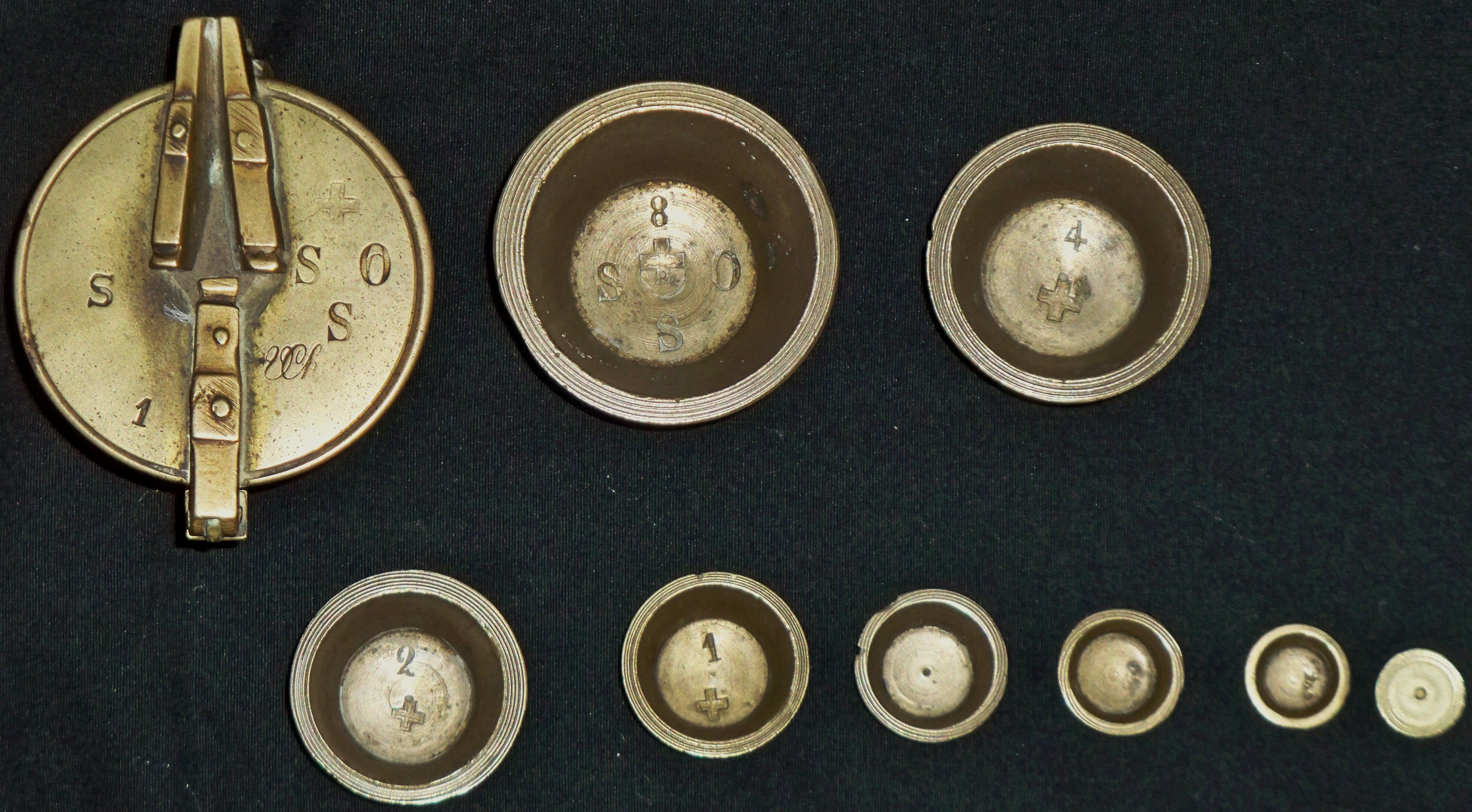 This is an apothecary nesting weight, where the weights stack inside each other for easier storage. It is made of brass, and several interesting marks and symbols on it, and I believe it to be from the 1800's. There are several crosses stamped into the brass as well as an S, an O and another S, several numbers, and an etching that looks like it was signed by the creator on the lid.