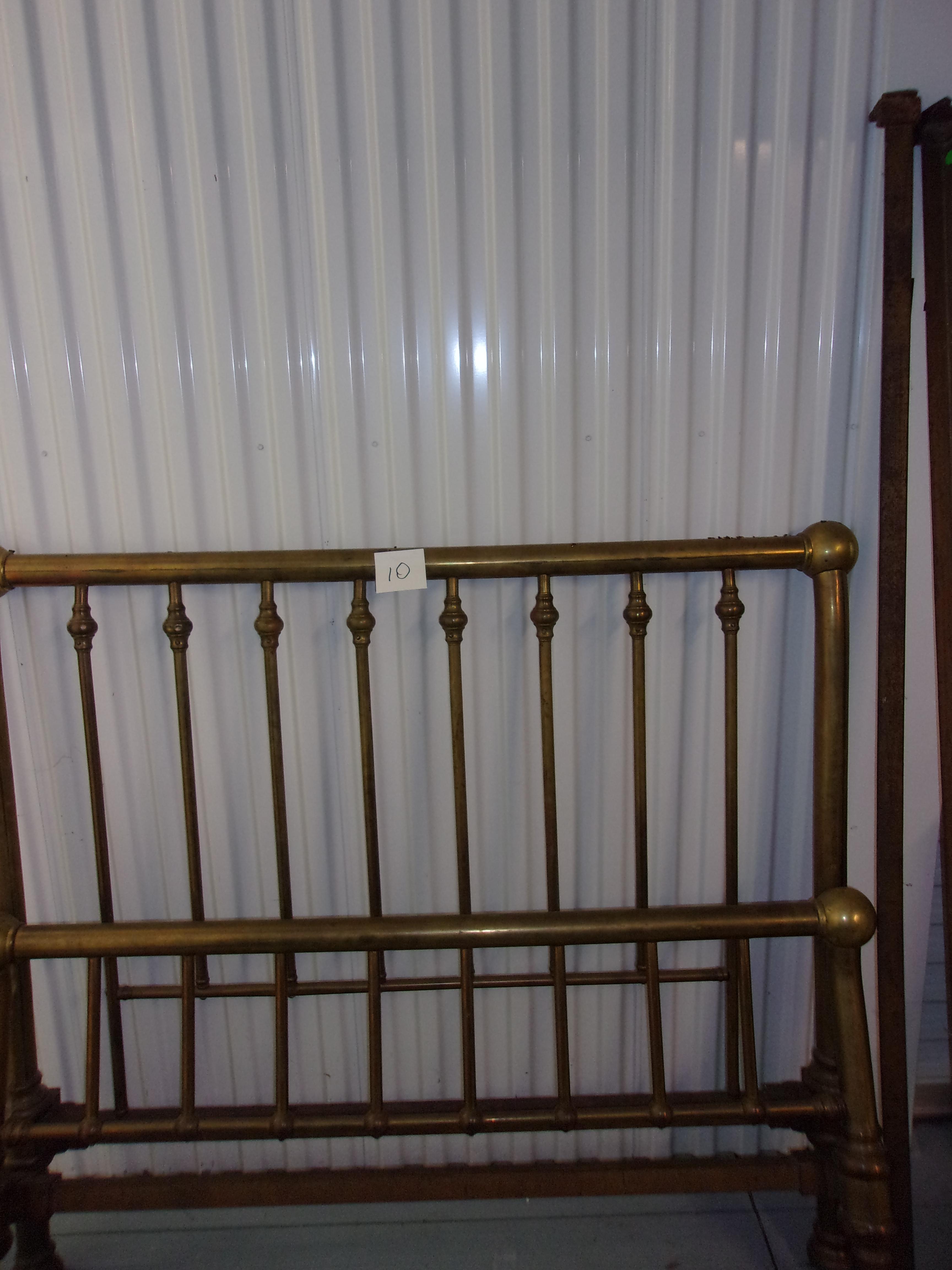 Twin sized brass bed with headboard, footboard, and rails. No markings found.