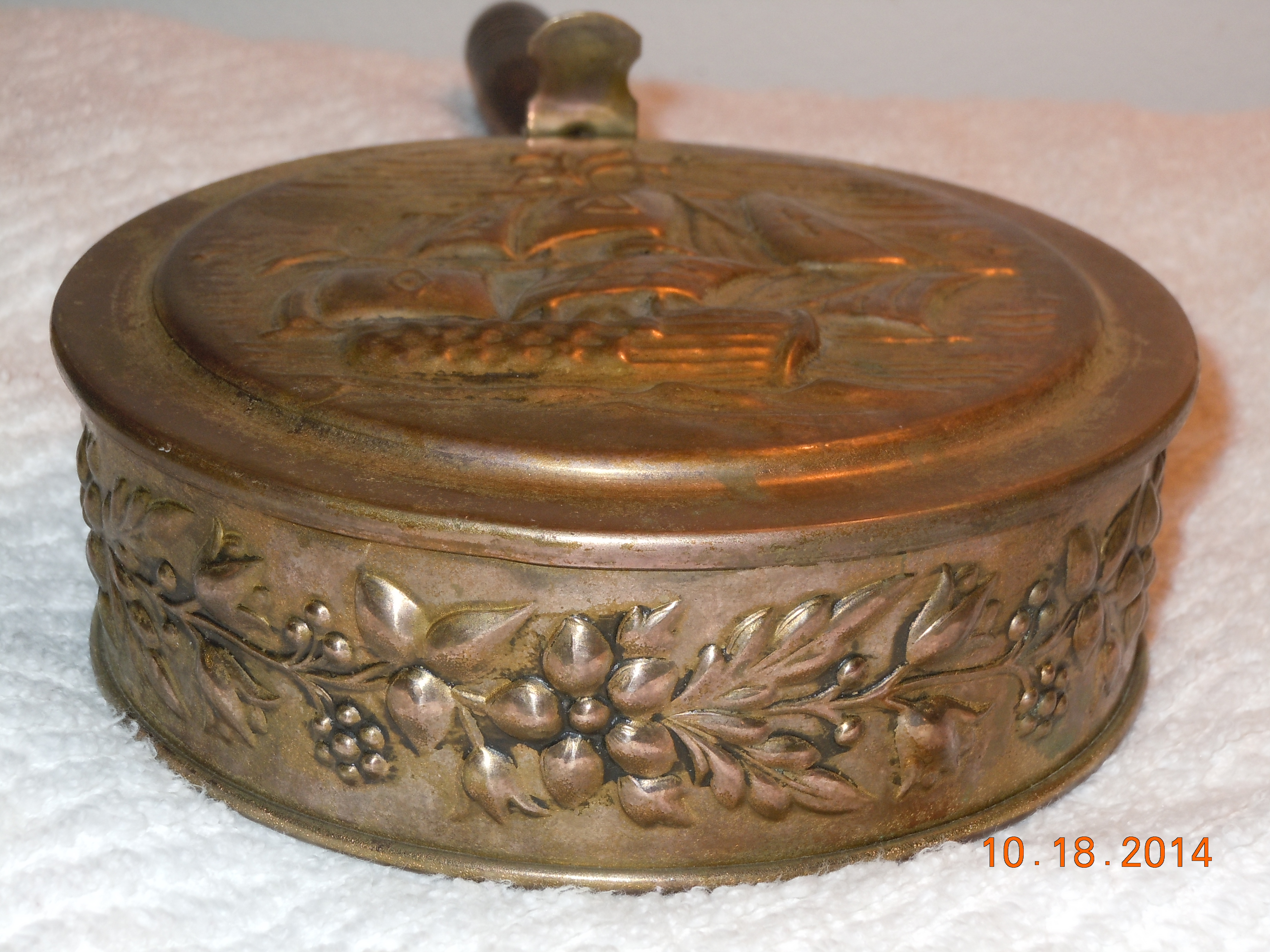5" diameter and 1.25" deep brass pot. Hinged top w/5" wooden handle, hinge is apart but is easily fixable. On the bottom of pot it is stamped "Peerag madeinengla". The exterior of the pot is embossed floral arrangement and the top is an embossed "Galleon".