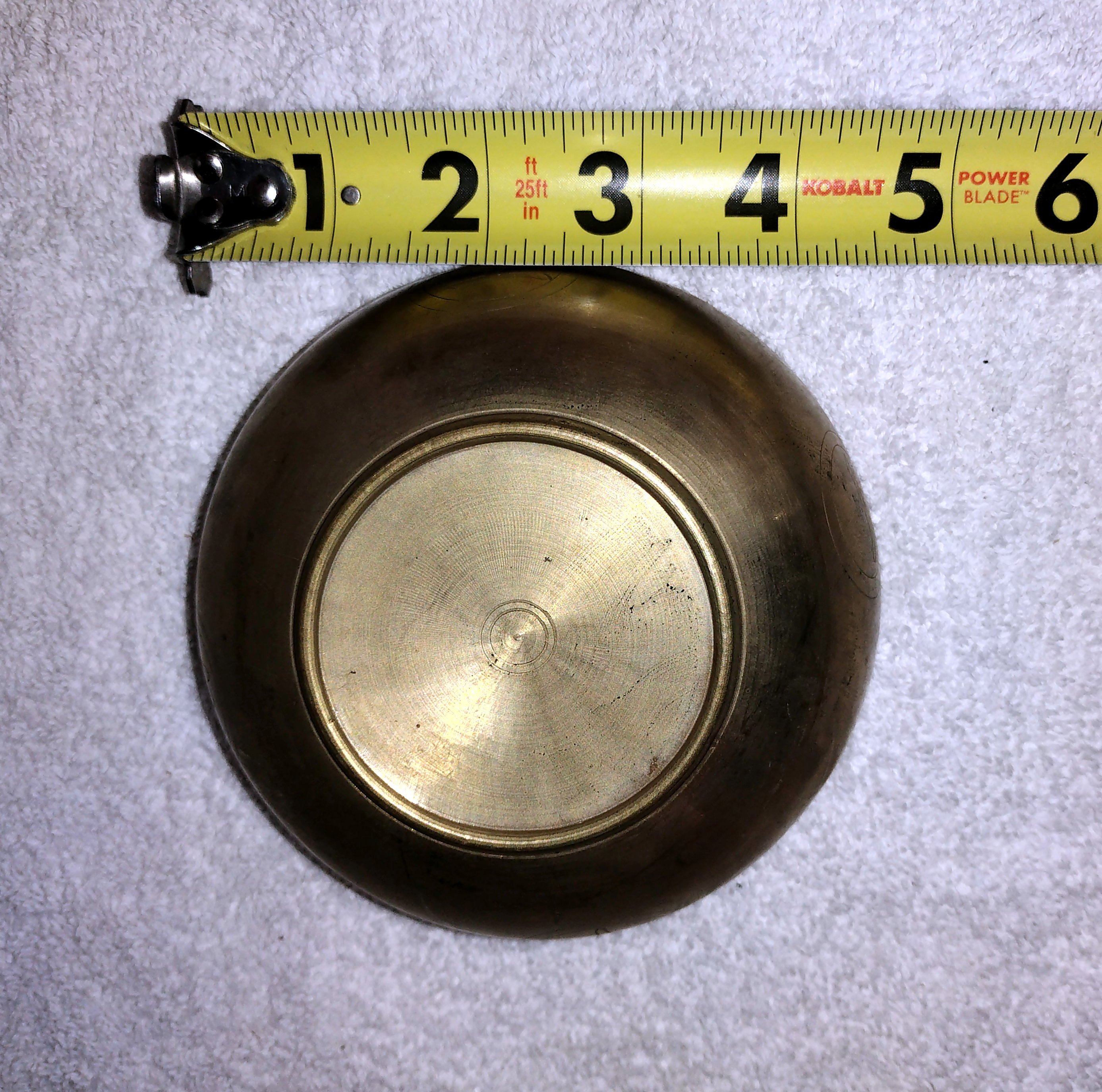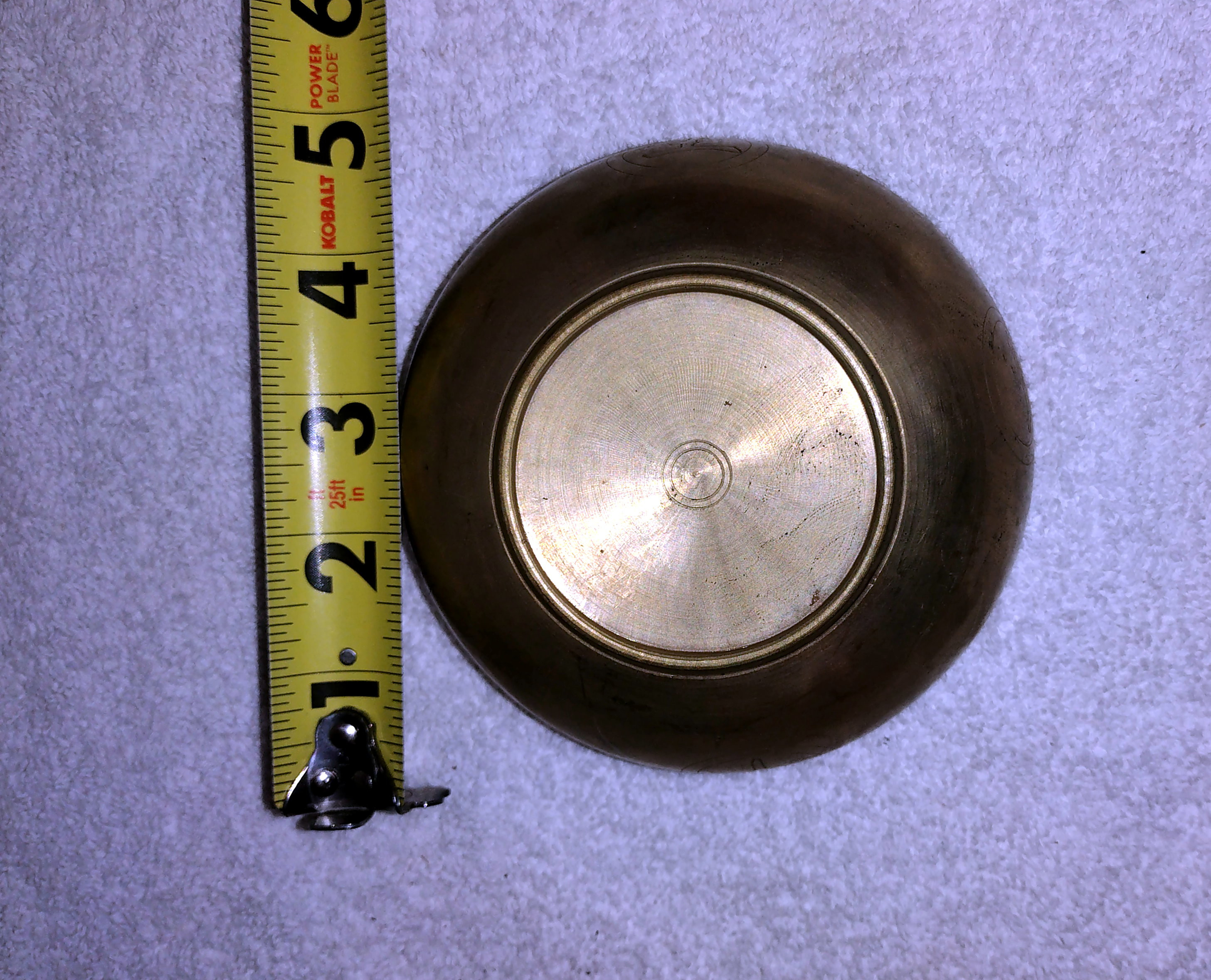 This is a small brass bowl, approximately 4.5 inches in diameter and 2 inches tall, featuring engraved symbols on its exterior. Based on your description and the accompanying historical context, the bowl may have origins linked to Japan, potentially crafted as a sake bowl or ceremonial item. The craftsmanship and markings suggest it could date to the 1946–1948 post-WWII period, coinciding with your father’s service in Japan, New Guinea, and the Philippines.