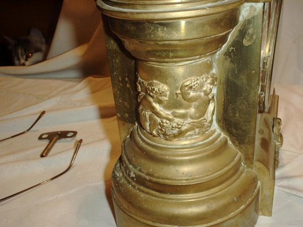 beautiful clock with wind up key, not currently working no signature or maker noted, on the inside on the back of the clock are numbers/letter