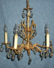 It has 4 brass leaves on top tier (where 4 large crystals hang from), then it has 6 arms with small flowers in the middle from top tier to middle tier where 6 middle sized teardrop crystals hang (although 1 is missing and 2 have slight damage), then comes middle tier where 18 round crystals are inlain in the brass that forms a circle from which the 18 icicle crystals hang in a circle.
