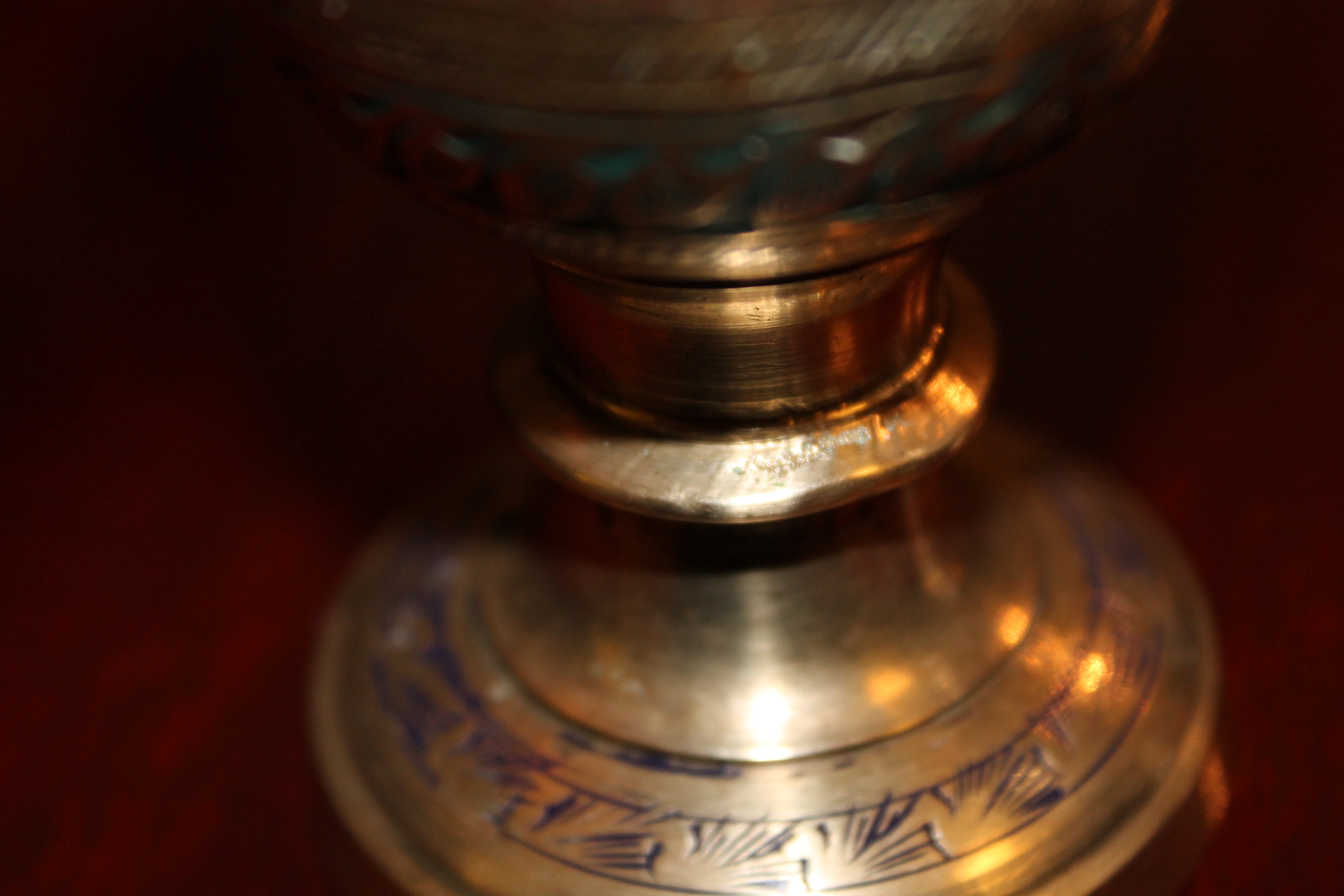 5 inchs tall brass vases. Heaving etching and painted. The only thing that looks like a signature is on the small rim near the bottom. It is barely visible and may just be an error in making it.