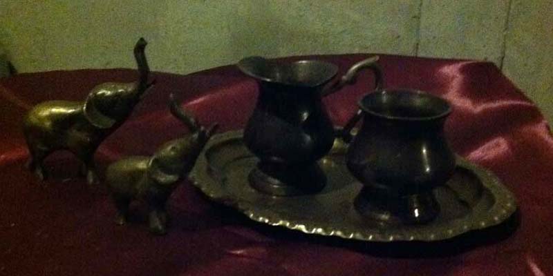 Two piece brass elephant set and three piece brass creamer / sugar bowl / tray. Deep patina on all pieces, but will clean if patina reduces value.