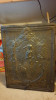 Brass fireplace found in remodel job made in 1897 fine art work of lady covered in robes and warming hands over fire with an angel on the other side of the fire. Wood Burning with a gas insert that can be easily removed.