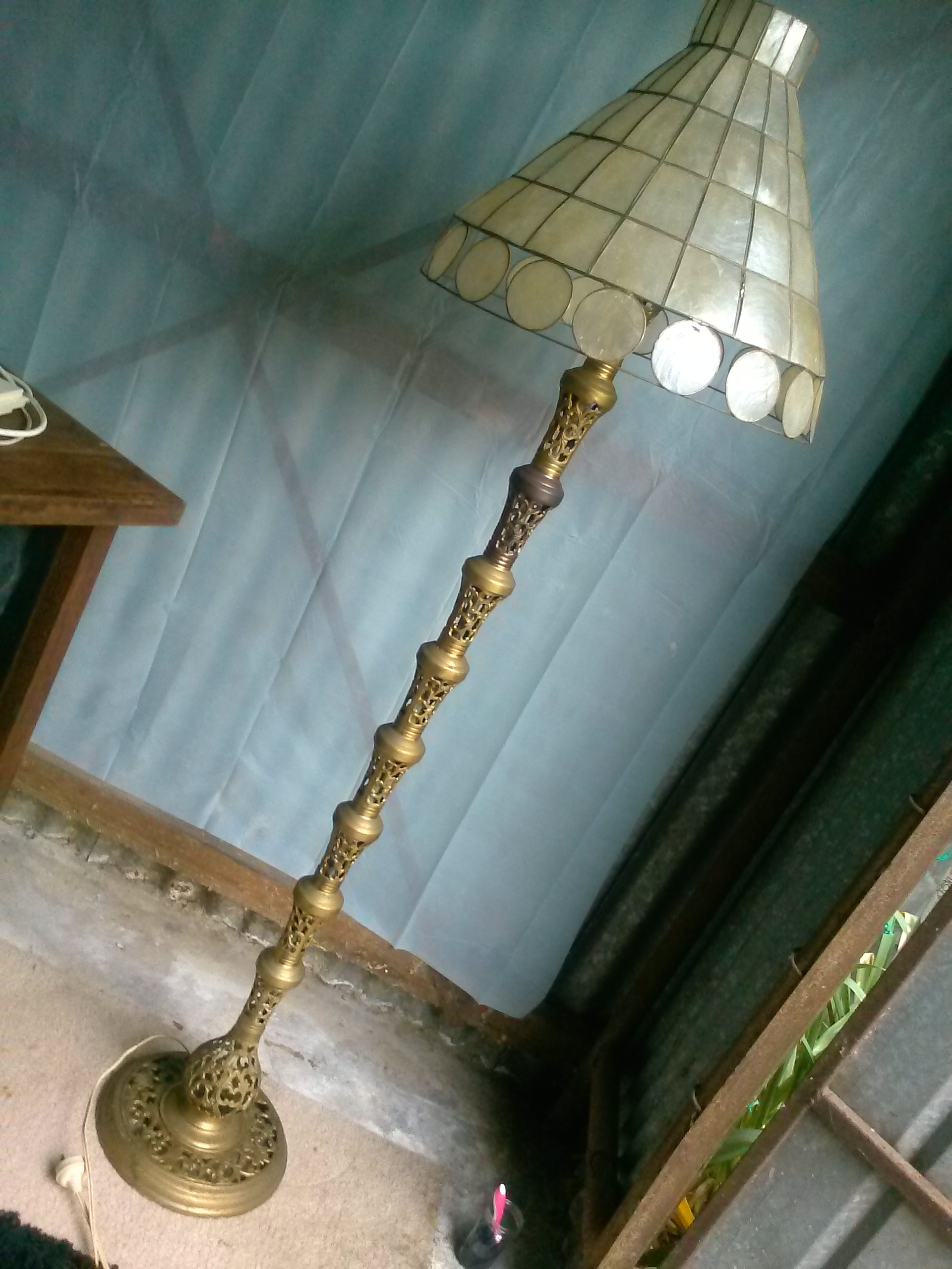 Standard lamp base with shell?? Shade, working order and in fairly good condition, any information would be appreciated, year, what material the shade is, how to clean base, price estimate, would there be a makers mark, etc. (I'm clueless!) Thanks in advance.