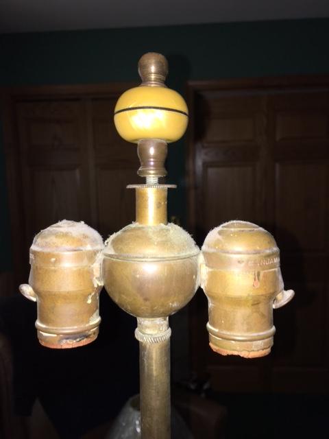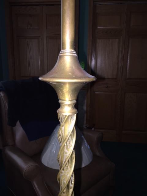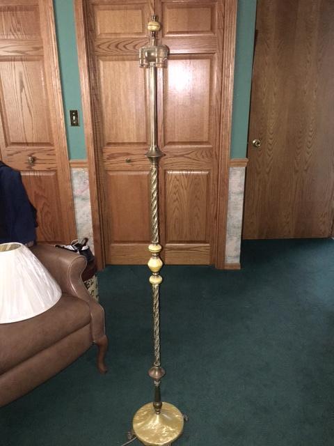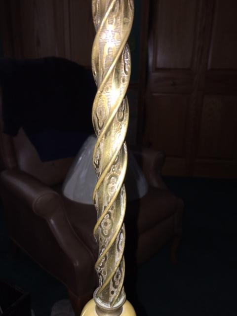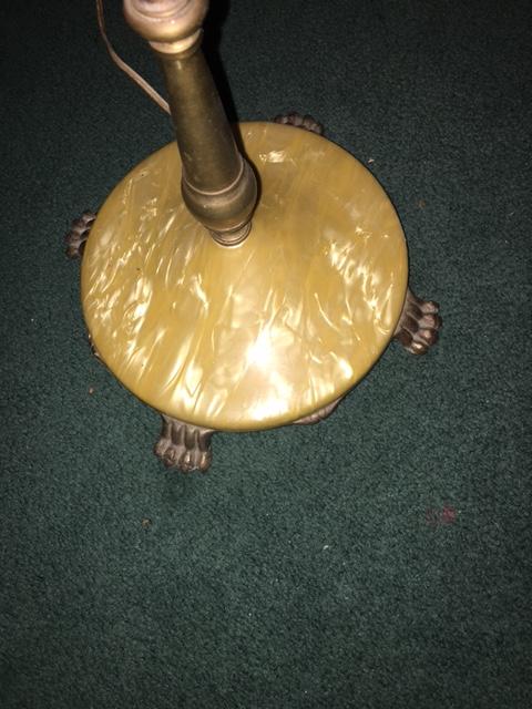 Spiral Shaft with Mother of Pearl Base with 4 Brass Claw Feet. The Shaft has "Three" Mother of Pearl knobs on center of shaft and one Mother of Pearl knob at Top to hold shade.