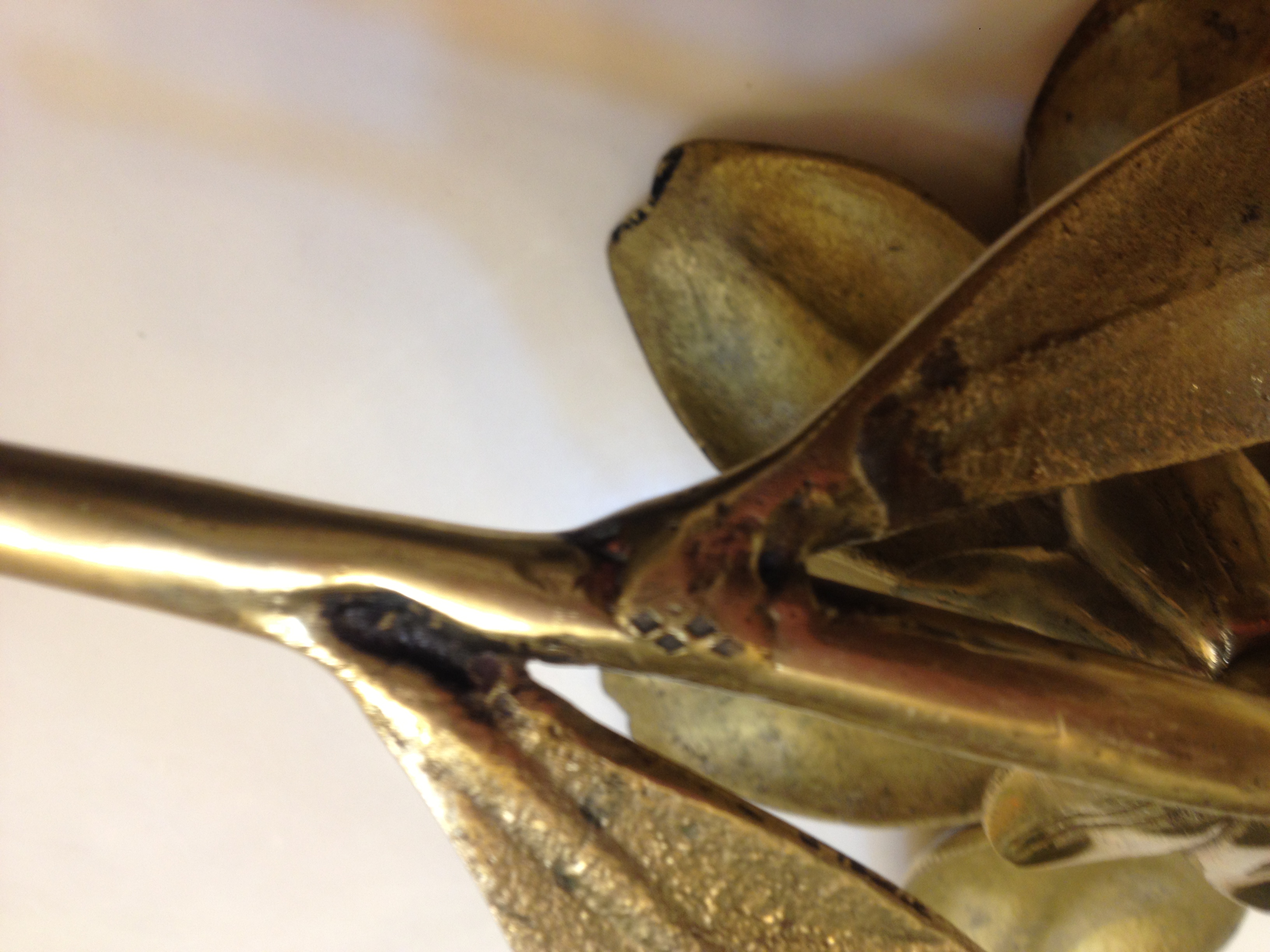 Also there are other markings such as a tiny pin hole on one of the petals and another pin whole marking on the stem. The item is Brass I beleive and each petal is carved with line indentions for the detail of the flower.
