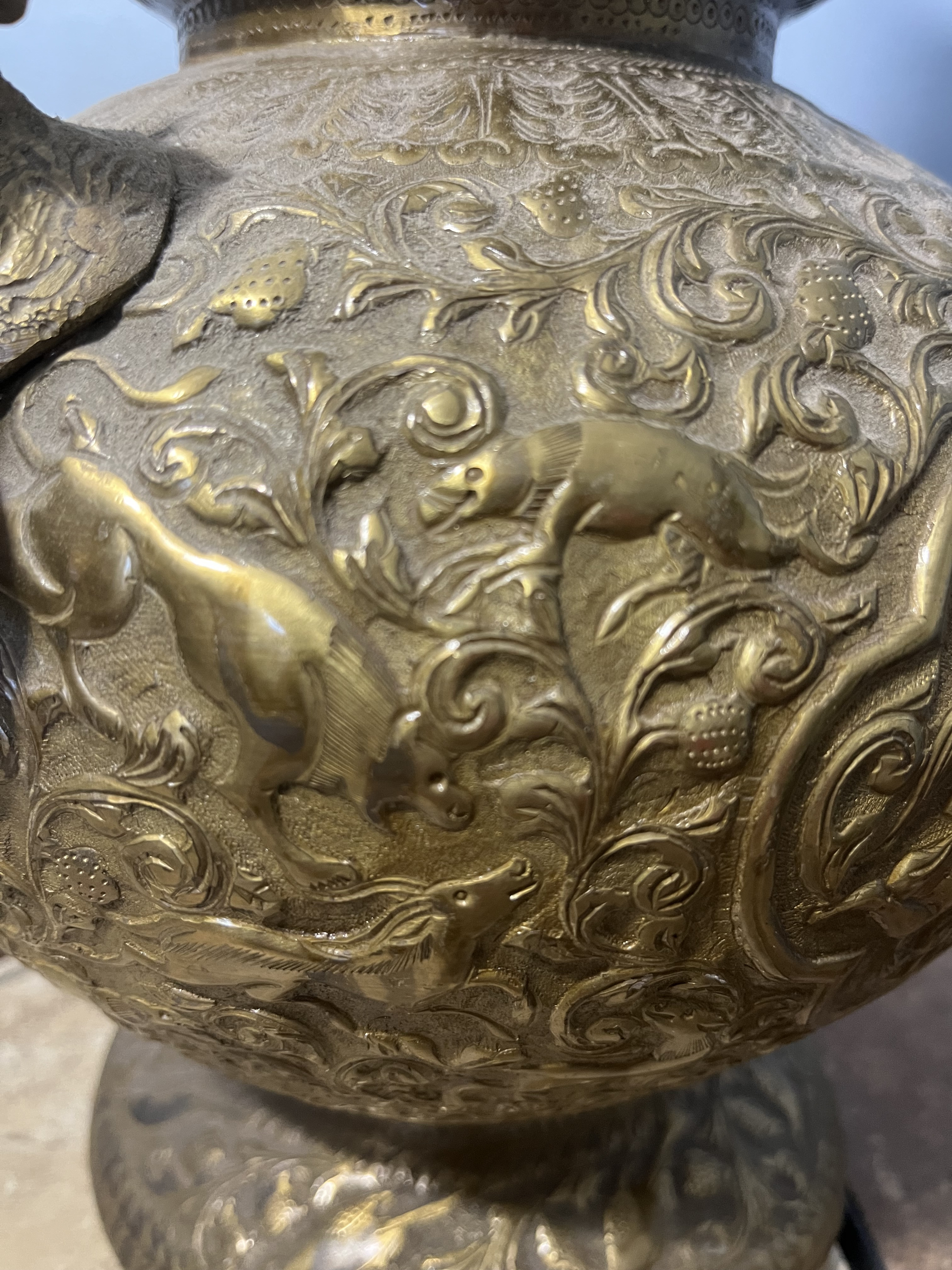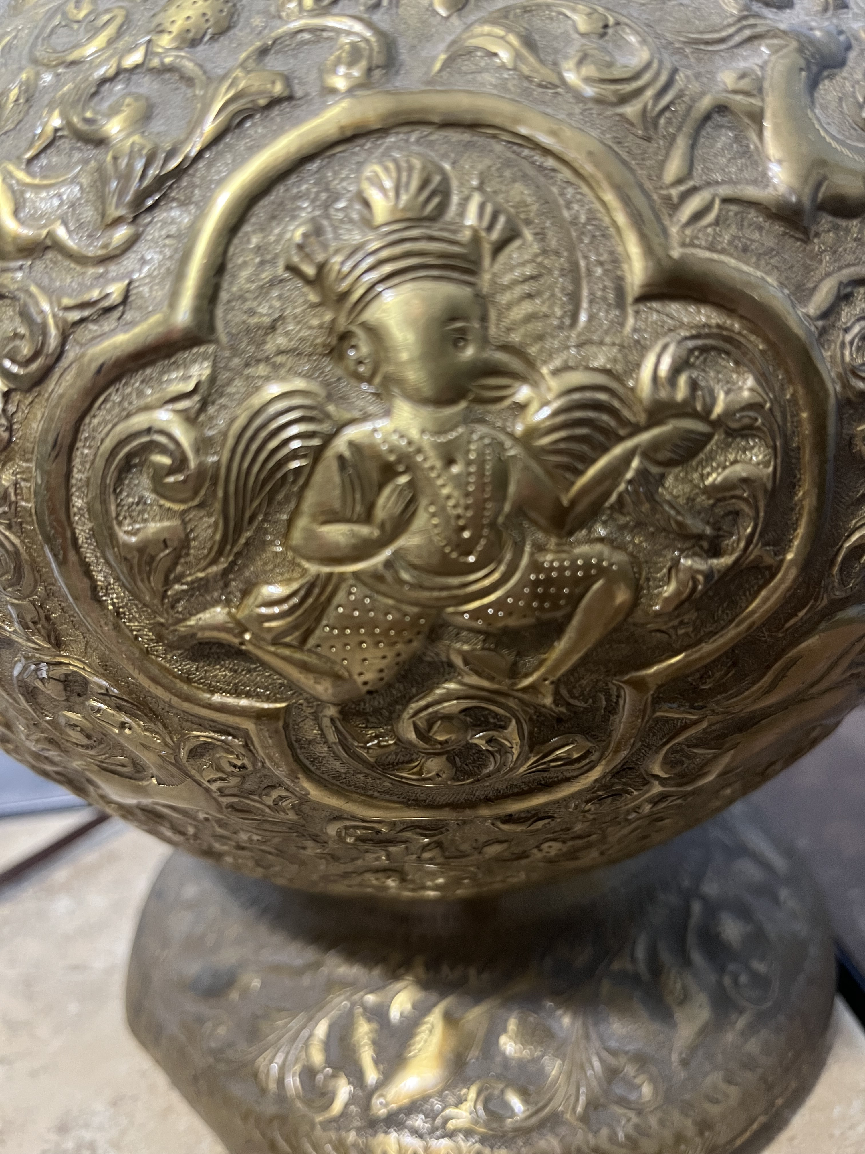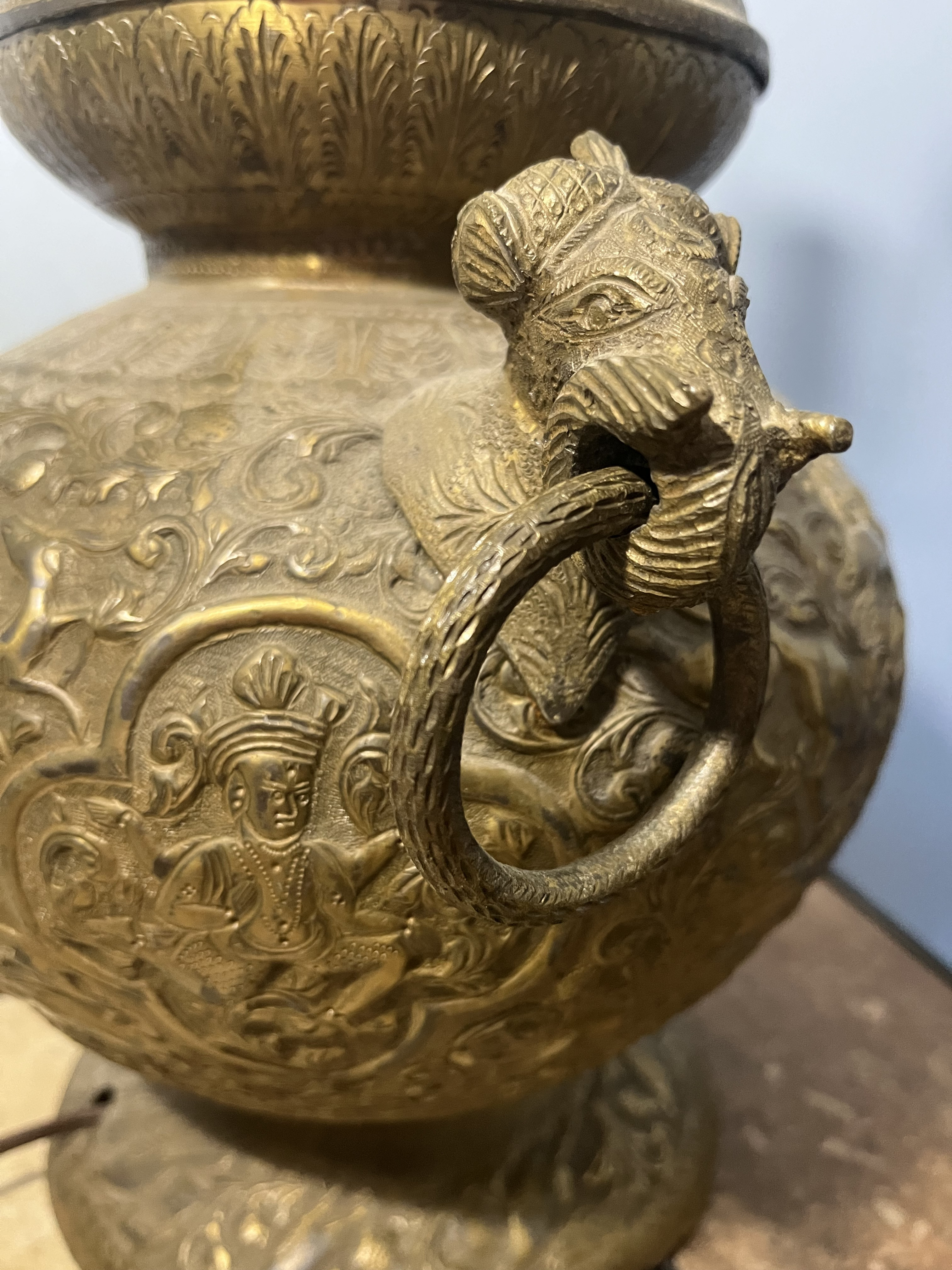 Brass lamp completely covered with carvings of the Hindu deities (including Garuda running), surrounded by animals and vines and dotted fruit. Two handles on the lamp are shaped like the Hindu deity Ganesha with free-moving rings in their trunks. The lamp was purchased in approximately 1920.