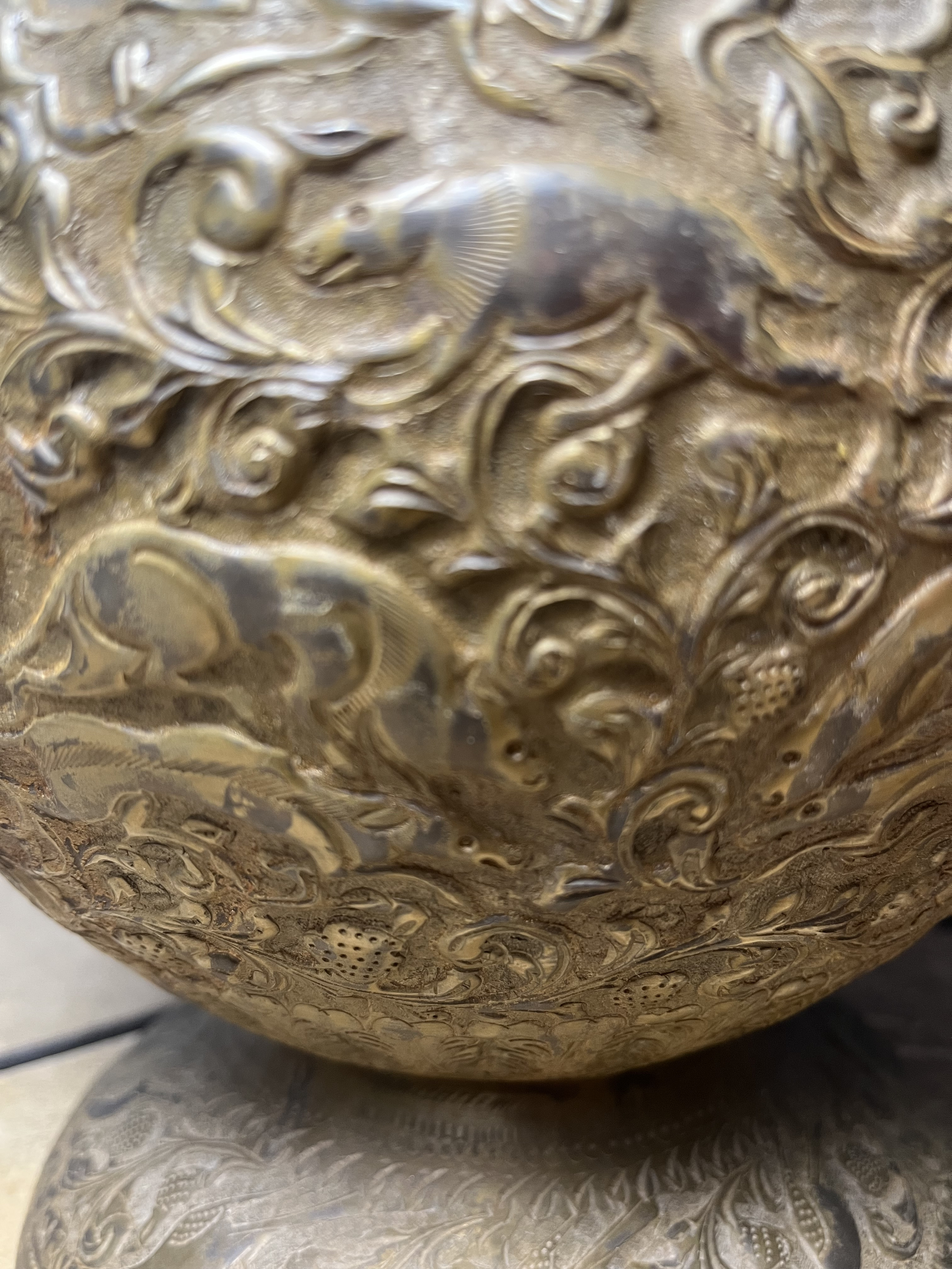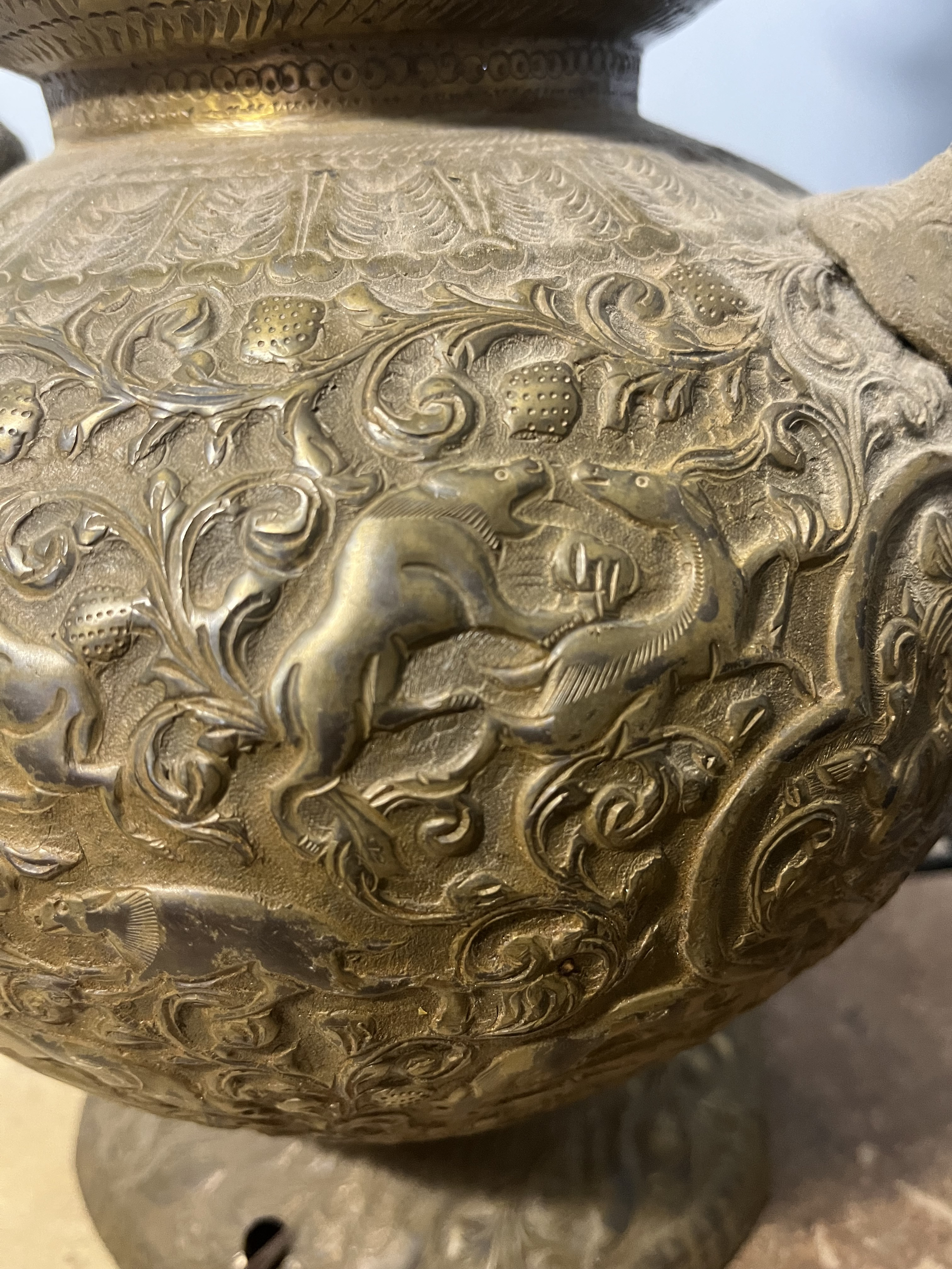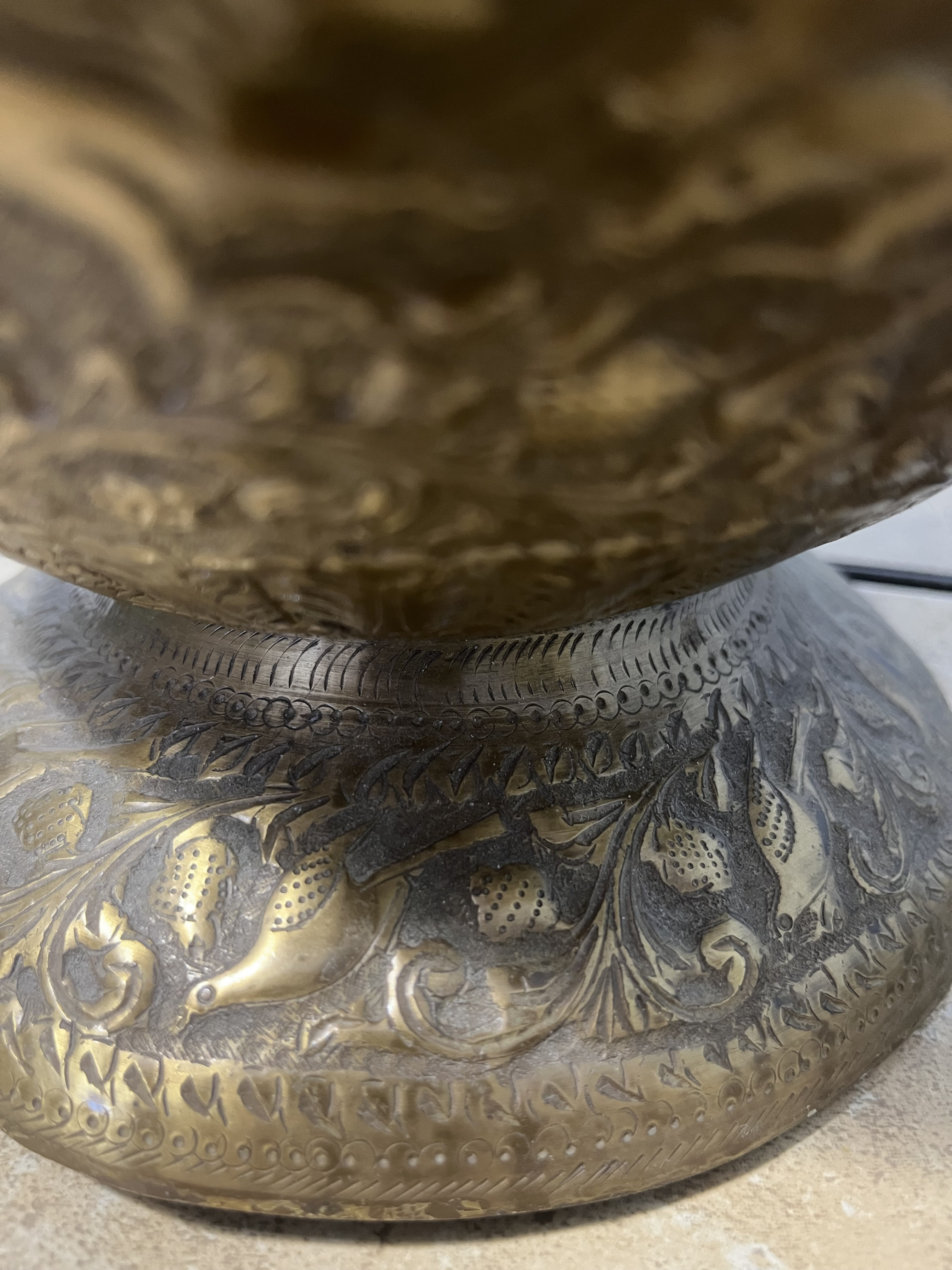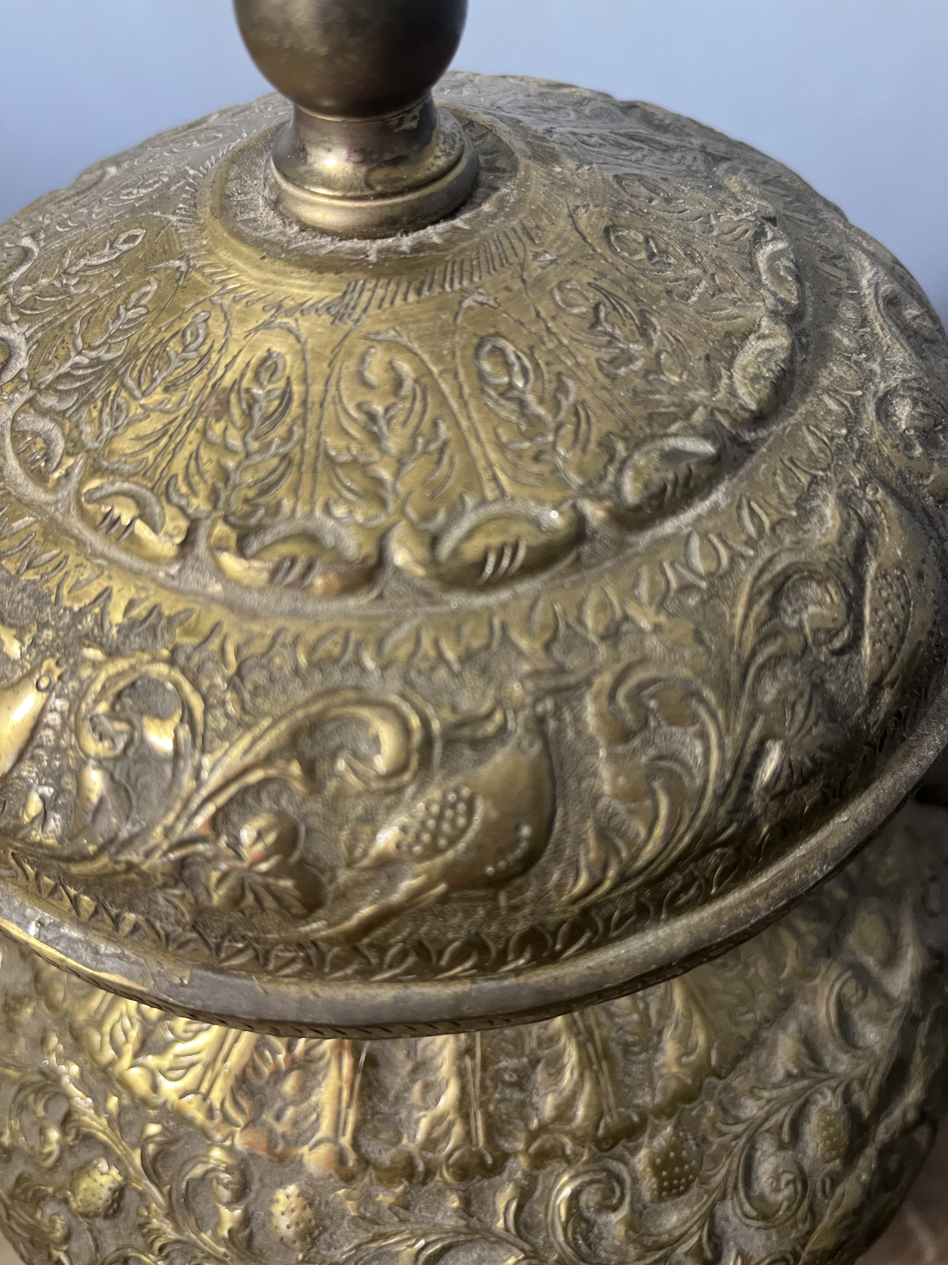 The maker of this lamp is not explicitly identified, but it likely originates from India, where such decorative brass work is prevalent. The intricate carvings suggest a skilled artisan, possibly from the late 19th to early 20th century.