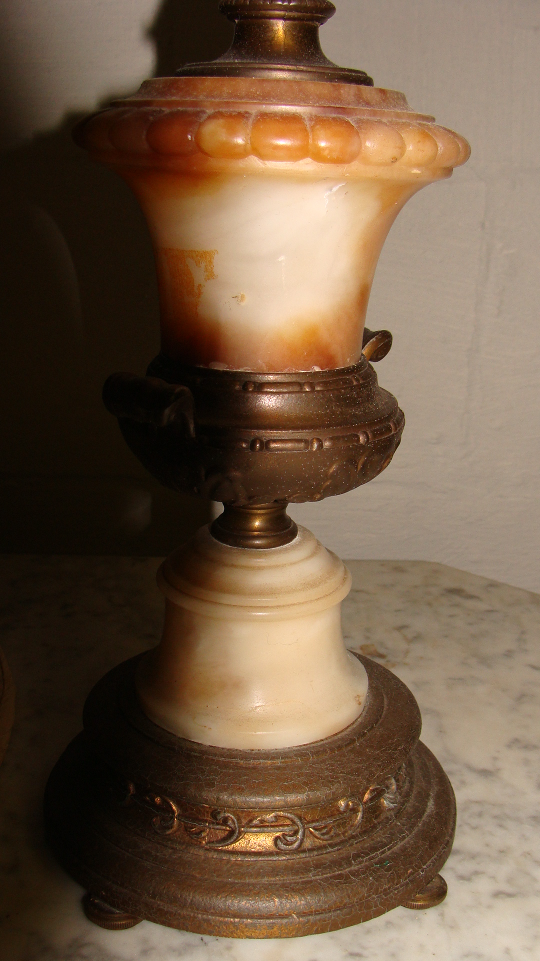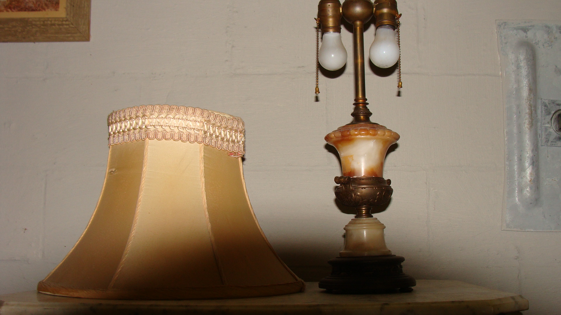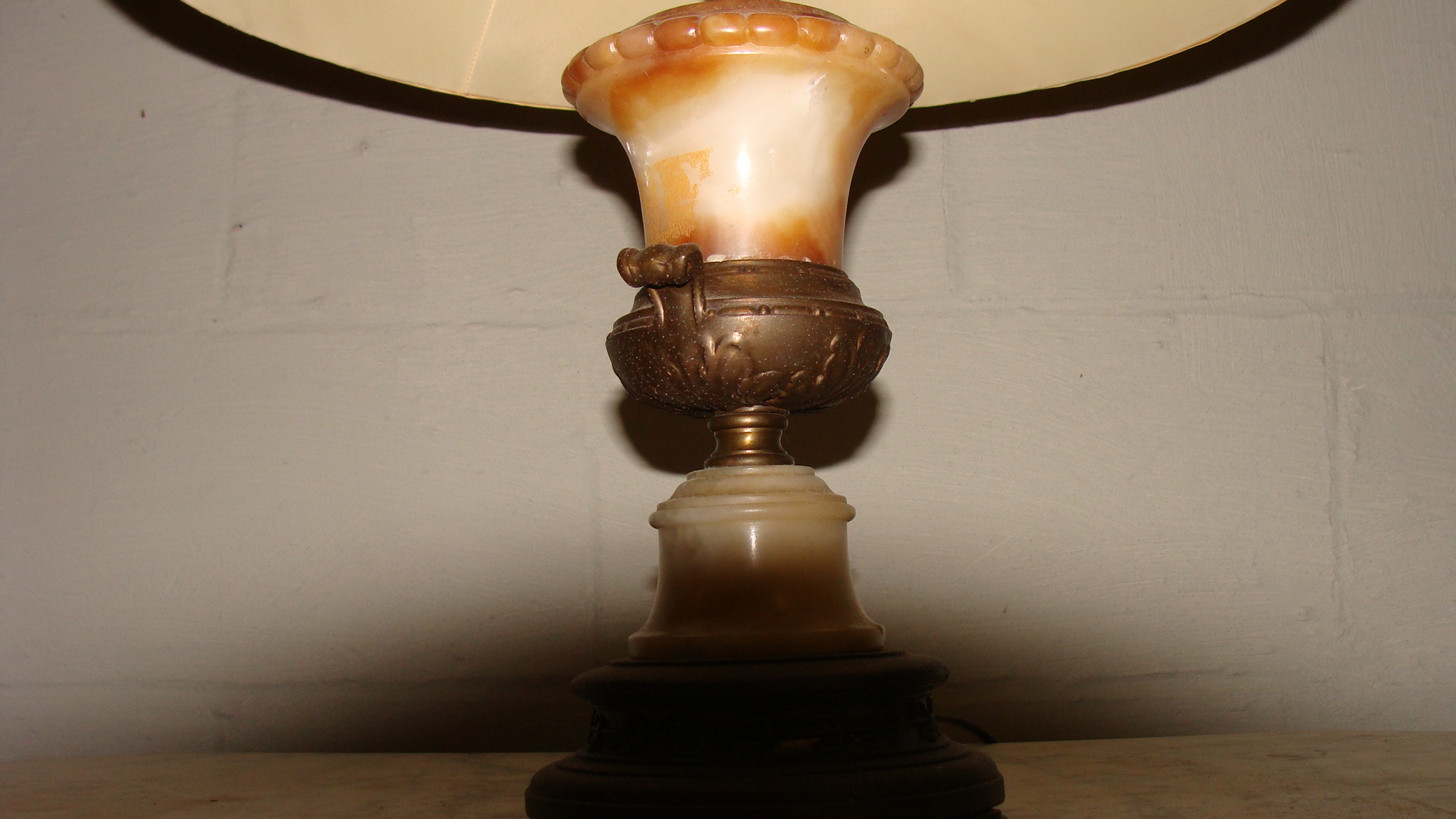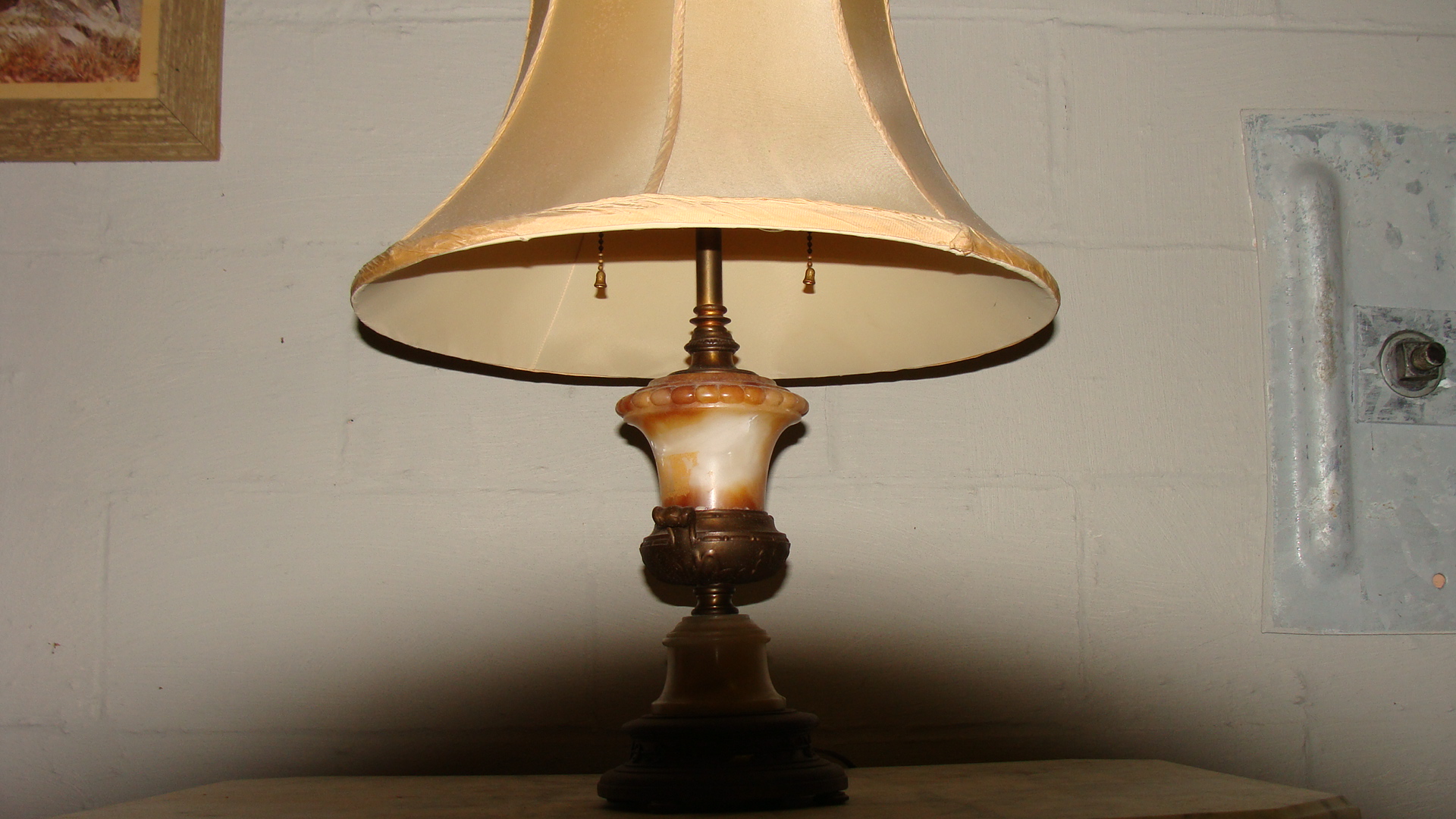 Lamp is in working order.It has two bulb with seperate switches both work.Lamp itself appears to be Brass and I think Ivory.It weighs approxamately 15 to 20 lbs maybe more.It's about 21 " tall and the shade is also in excellent shape.