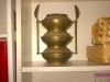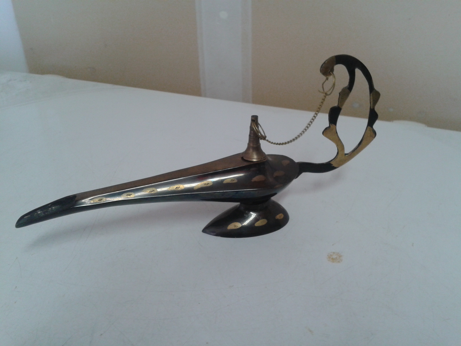 This oil lamp (suspected brass) was obtained in 2007 in the Middle East. The metal appears to be painted with a black coloring, though the metal shines through the paint. There are no recognizable manufacturing markings, although decorative scratches appear along the sides. Not solely decorative, used for its intended purpose. Residue cleaned off. Slight green tarnish where oil is filled.