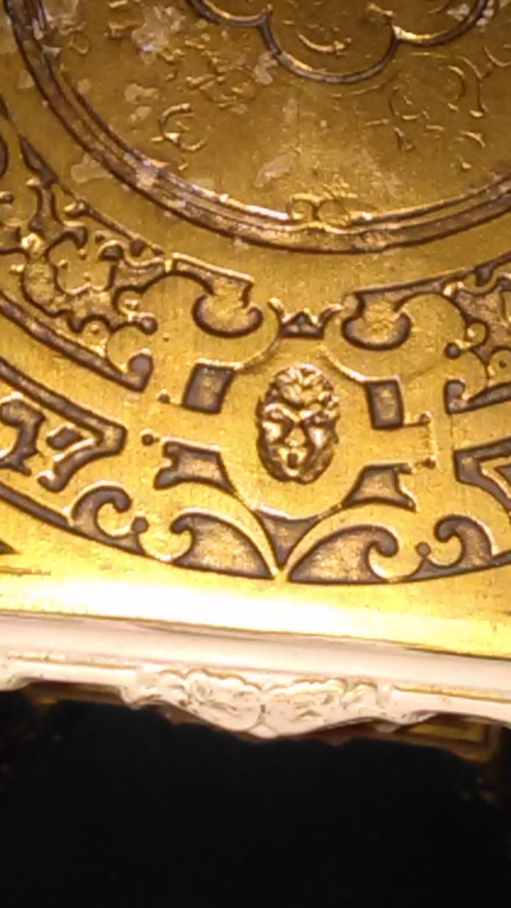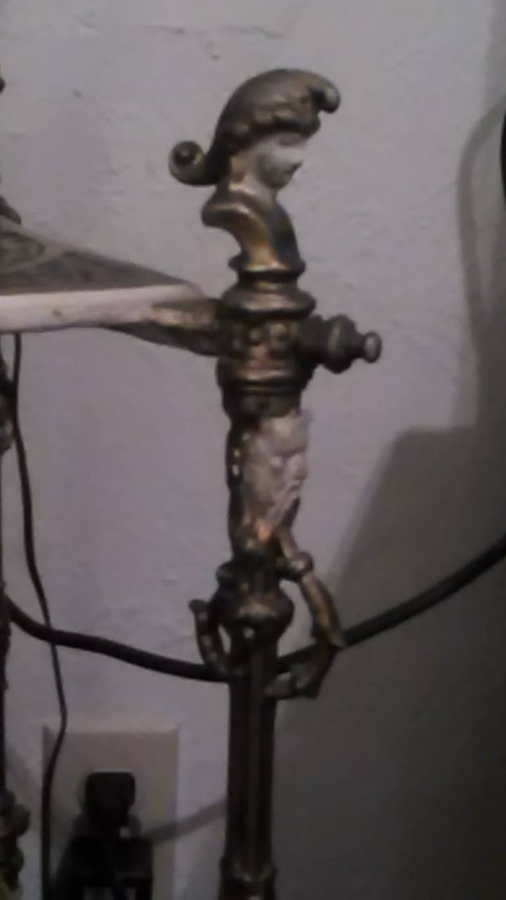 The top tier legs have the head of a women the second tier looks to be a man and the bottom legs are either a serpentine or a dragon, the table itself is 3 tier square made of either brass or bronze