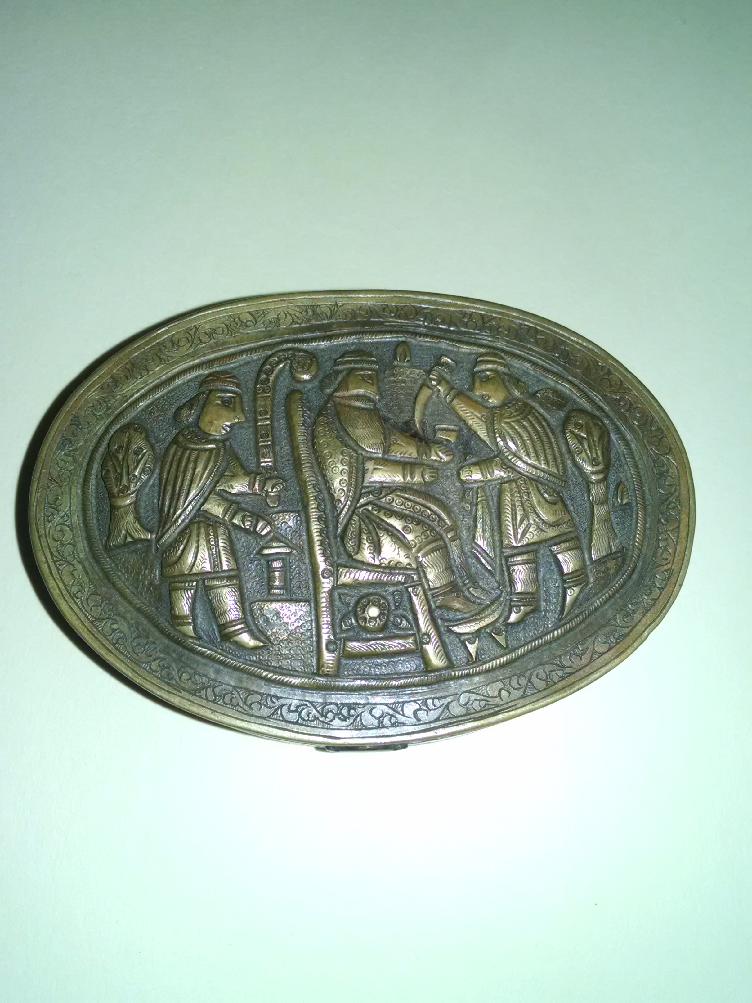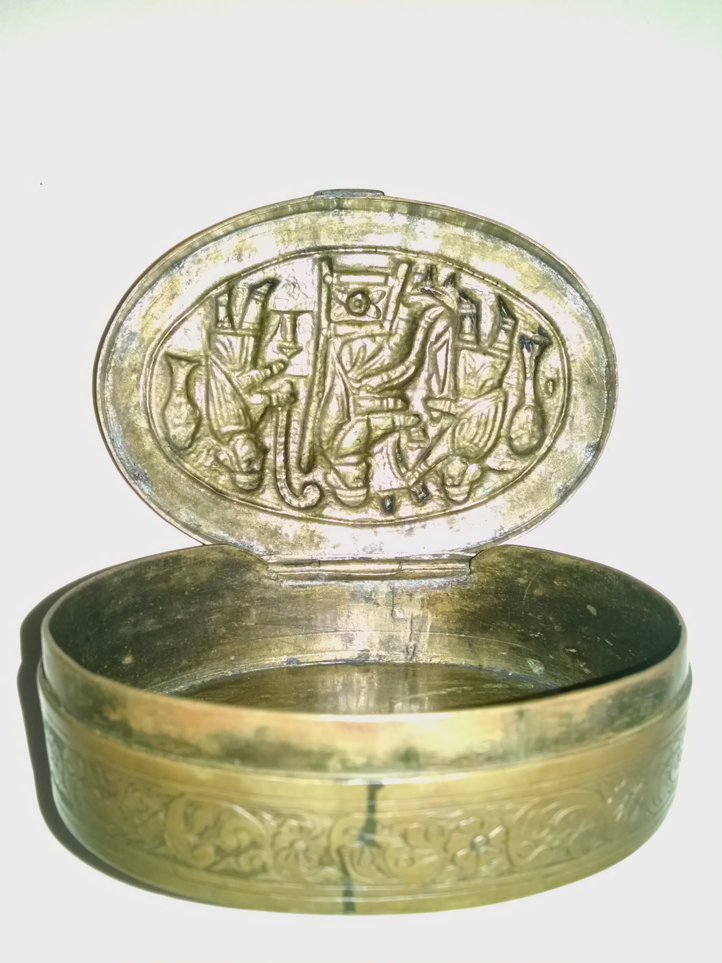 I have a hand engranved snuff box with a large relief depicting some kind of sacrificial image on the lid. No dates or wording can be found (by me) any where on the box. It was passed down to me by an uncle a few years ago and I would like to find more information about it. Ive seen some similar to this going for over $500 but they are no where as detailed as this on is so Im curious what this is and where it may have came from. It is about 3.5 inchs long and 2.5 inchs wide and about 1.25 inches tall. The bottom peice smells like copper (like a penny) and the rest smells different. There also seems to be either wording or tooling marks on front inside of the box. Any info would be greatly appreciated. I can add more pictures if needed. My camera only took these ones under the allowed size of 2mb per picture. Thank you.