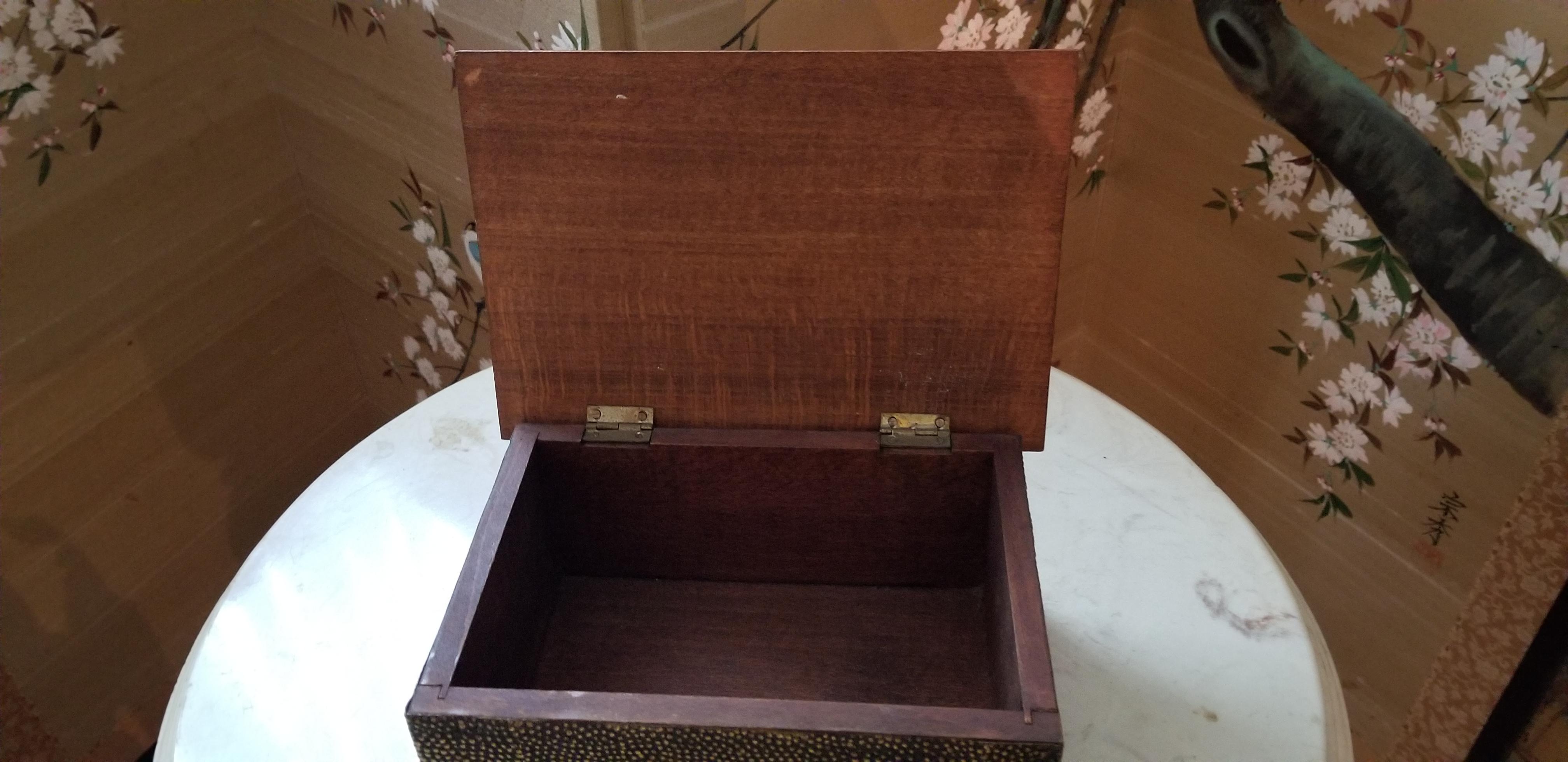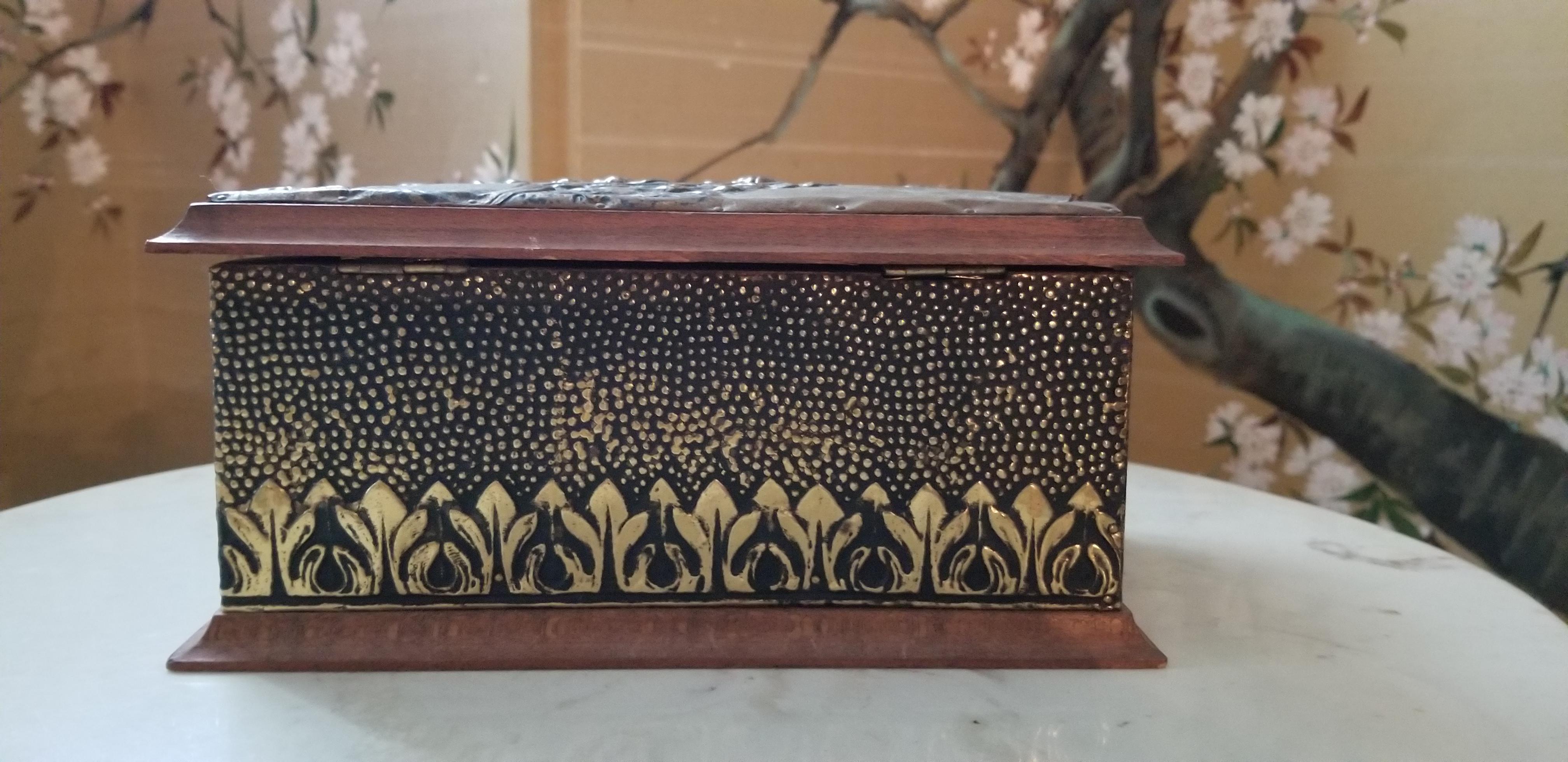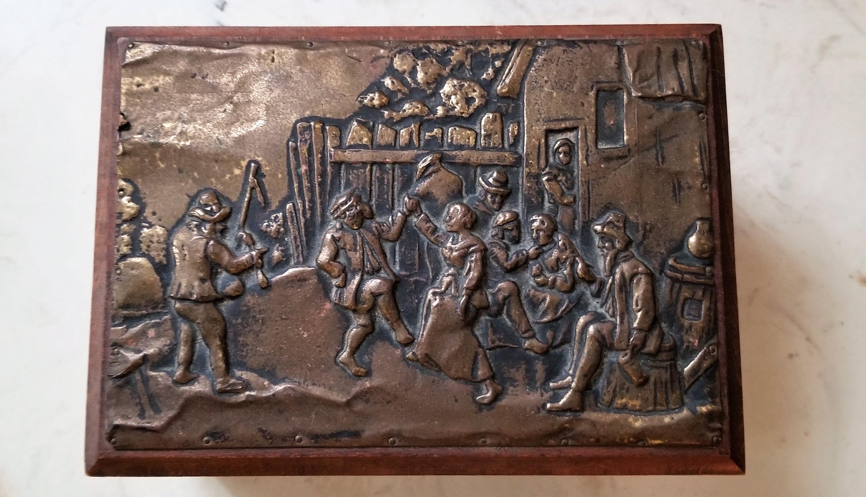 I believe this to be a cherry wood box panelled on all sides and top with brass. The top dipicts a scene of people dancing. The sides appear to be hammered brass with a decorative border. The box was obtained from an estate sale. I think it may have been a tobacco or cigar box, but I haven't been able to confirm a purpose for the box. Any information is greatly appreciated.