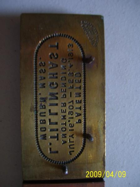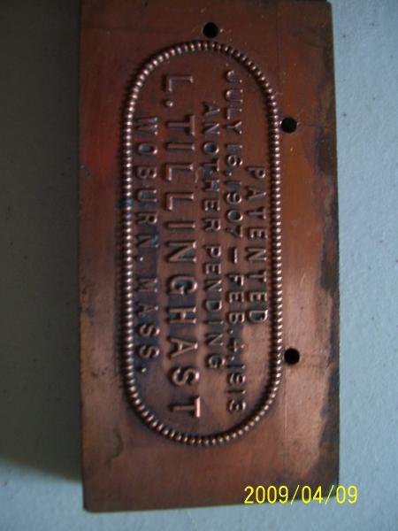The actual patent die says- "Patented, July 16,1907-Feb. 4,1913, Another Pending, L. Tillinghast, Woburn,Mass."