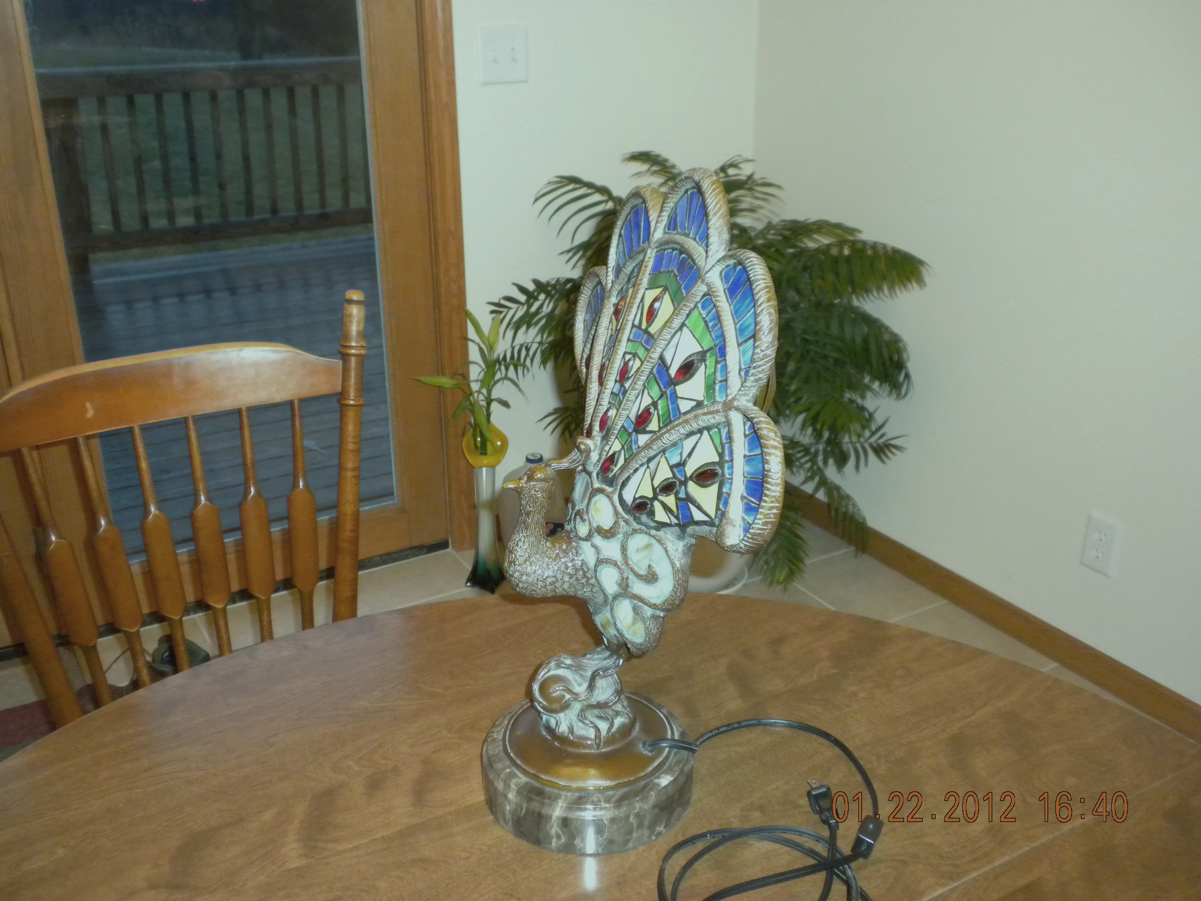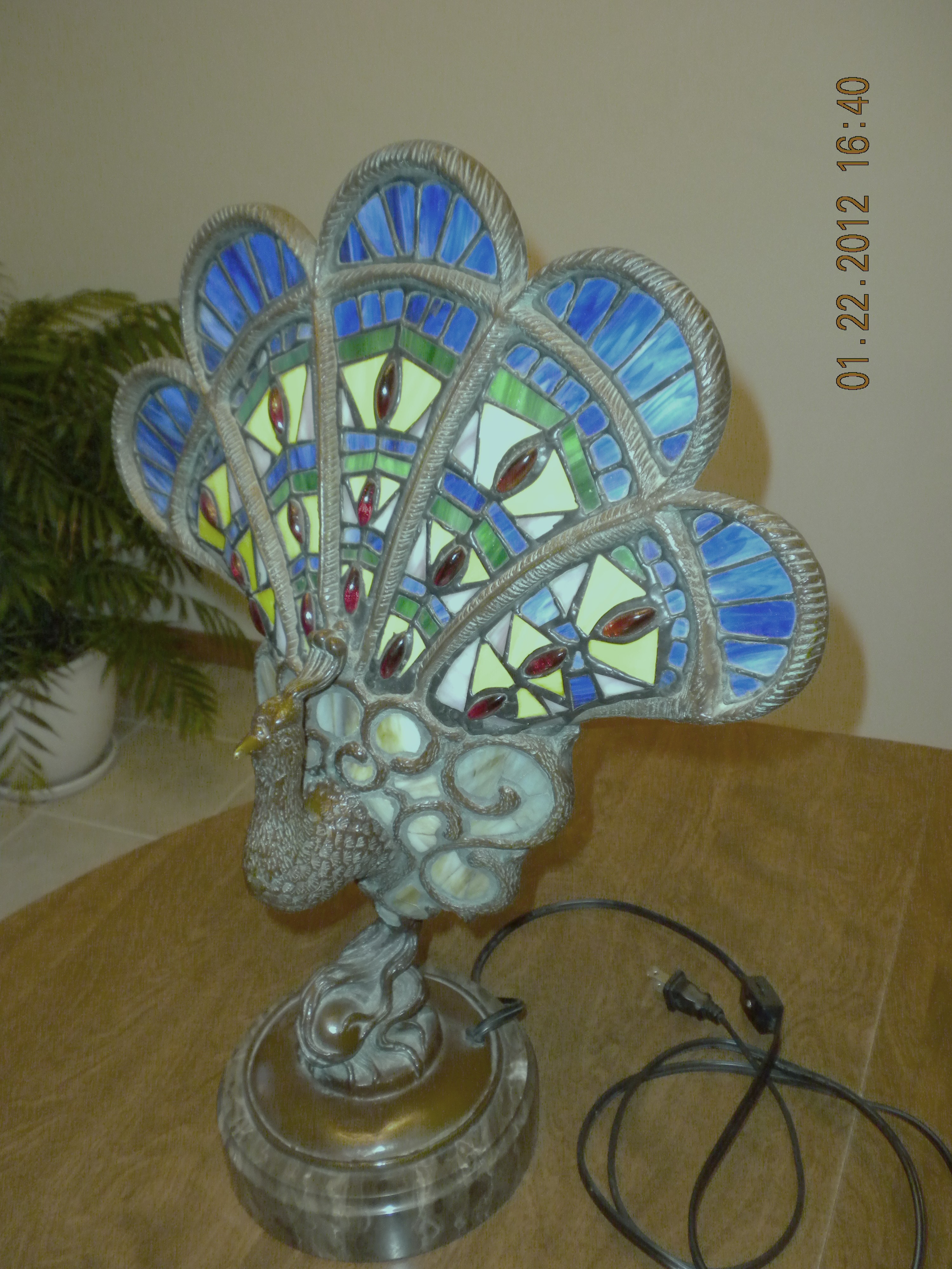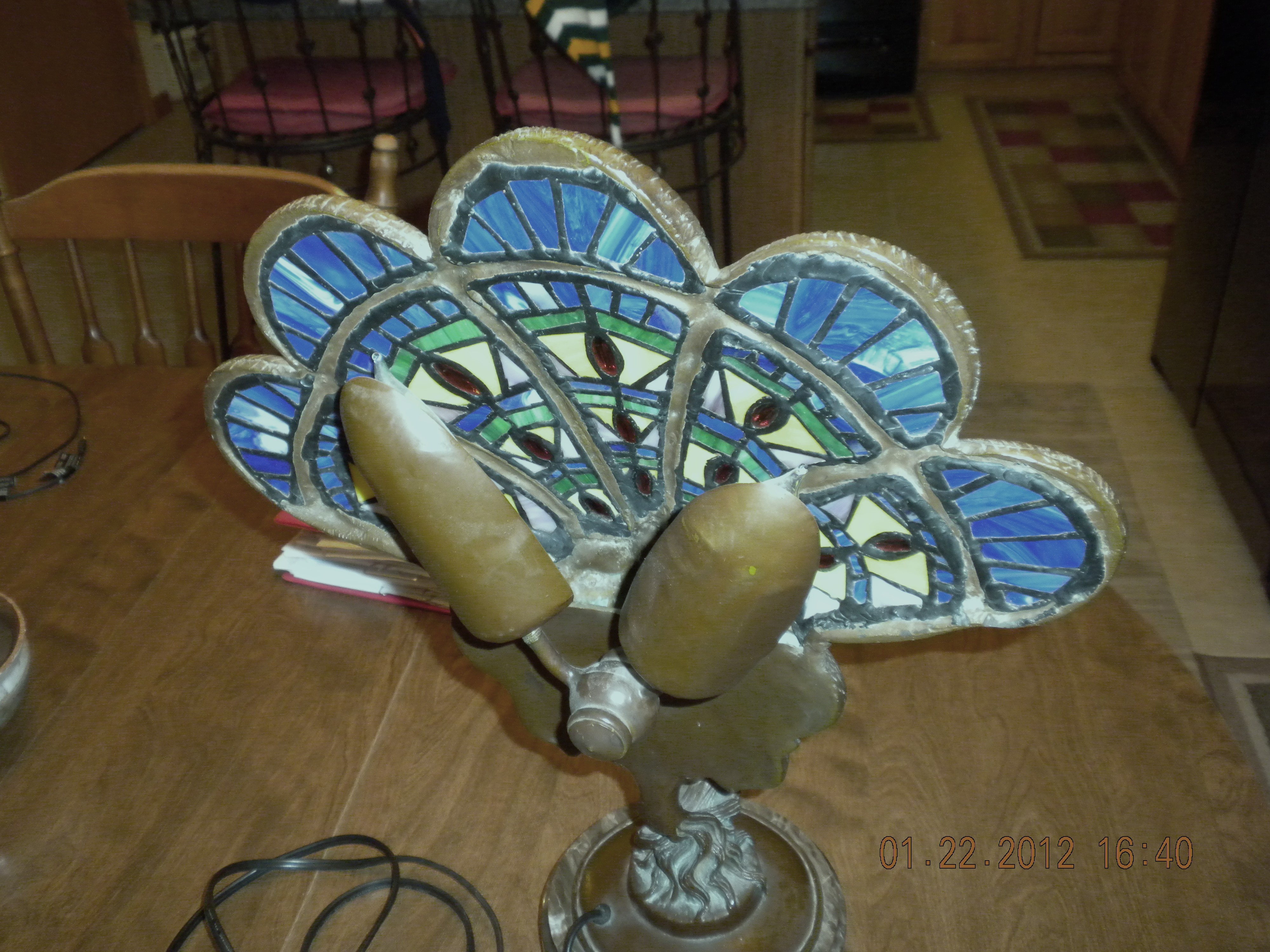 This has 2 small light bulbs shrouded in brass so it reflects through the stained glass feathers.