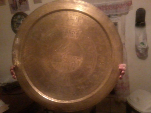 Hello, I too have a large very heavy brass platter. Have you had any other feed back yours? I was told that if the back of it is not perfectly flat that it means it was original( not mass produced) and therefore could be worth something. Mine has a really intricate Islamic calligraphy in the middle , with pyramids, camels and Egyptian people figures. It's looks to be the same size as yours as well. I have a sister and brother n law whom live in Istanbul, turkey and they told me they bought a much smaller similar platter turned into a table for 200$ at a bazaar over there.. But that's all I've been able to gather from my own research. Just wondering if you could enlighten me further on your findings??