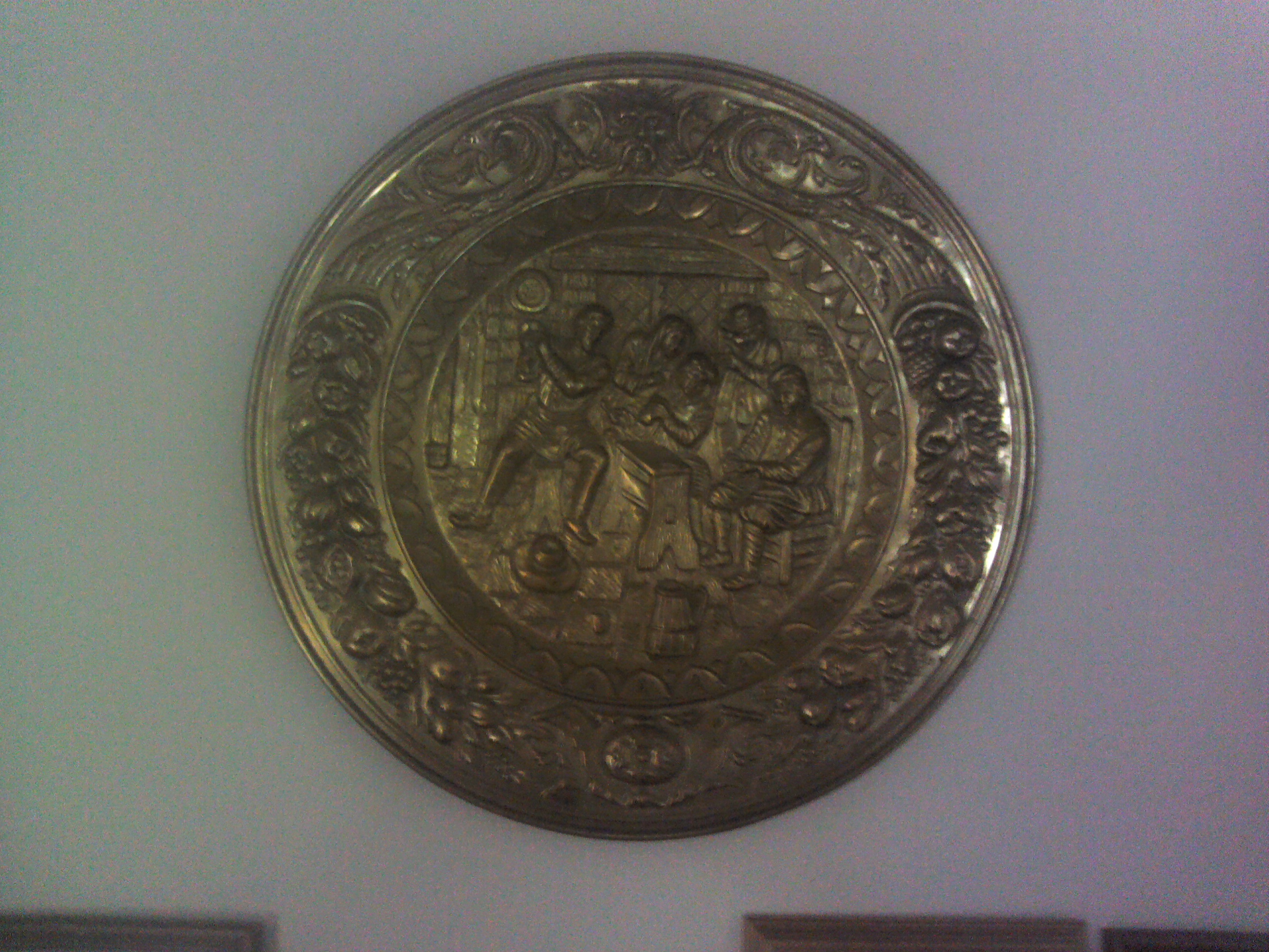 This is a brass plate, I don't think itis copper, that has a picture of men playing cards formed into it. It is about 22 inches across and the inset part is at least 1 inch deep.  It has been in my family for at least 80 years.  I have seen similar ones a few time over the years but they have always been much smaller, no larger than 15 inches. I can find no marking on it.