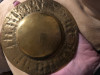 Physical Description: This brass plate measures approximately 10-12 inches in diameter. It features a polished surface with an intricate design embossed in the center, showcasing a triangular motif with decorative elements. The back of the plate has a hook for hanging, indicating it may have been intended for display rather than functional use.