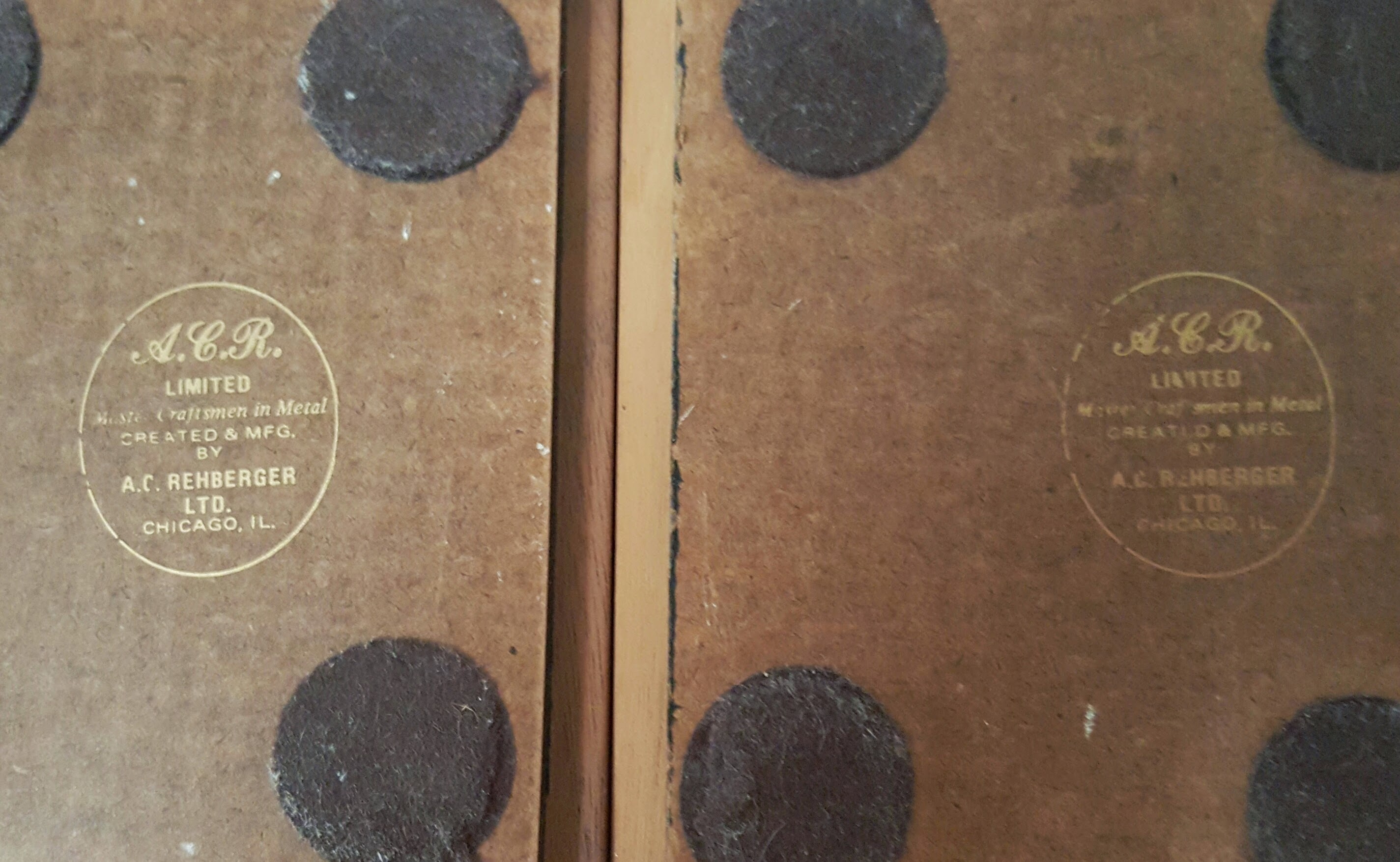 A.C.R limited master craftsmen in metal created & MFG by A.C. Rehberger LTD chicago, IL is what the gold lettered stamp on the bottom of them says. I was able to find info on the craftsmen and some other items but the ones that said "limited" were vary rare it seems because I can't locate any information on them. They've belonged to my grandmother as long as I can remember and are in perfect condition . Any info would be much appriciated . Thank you