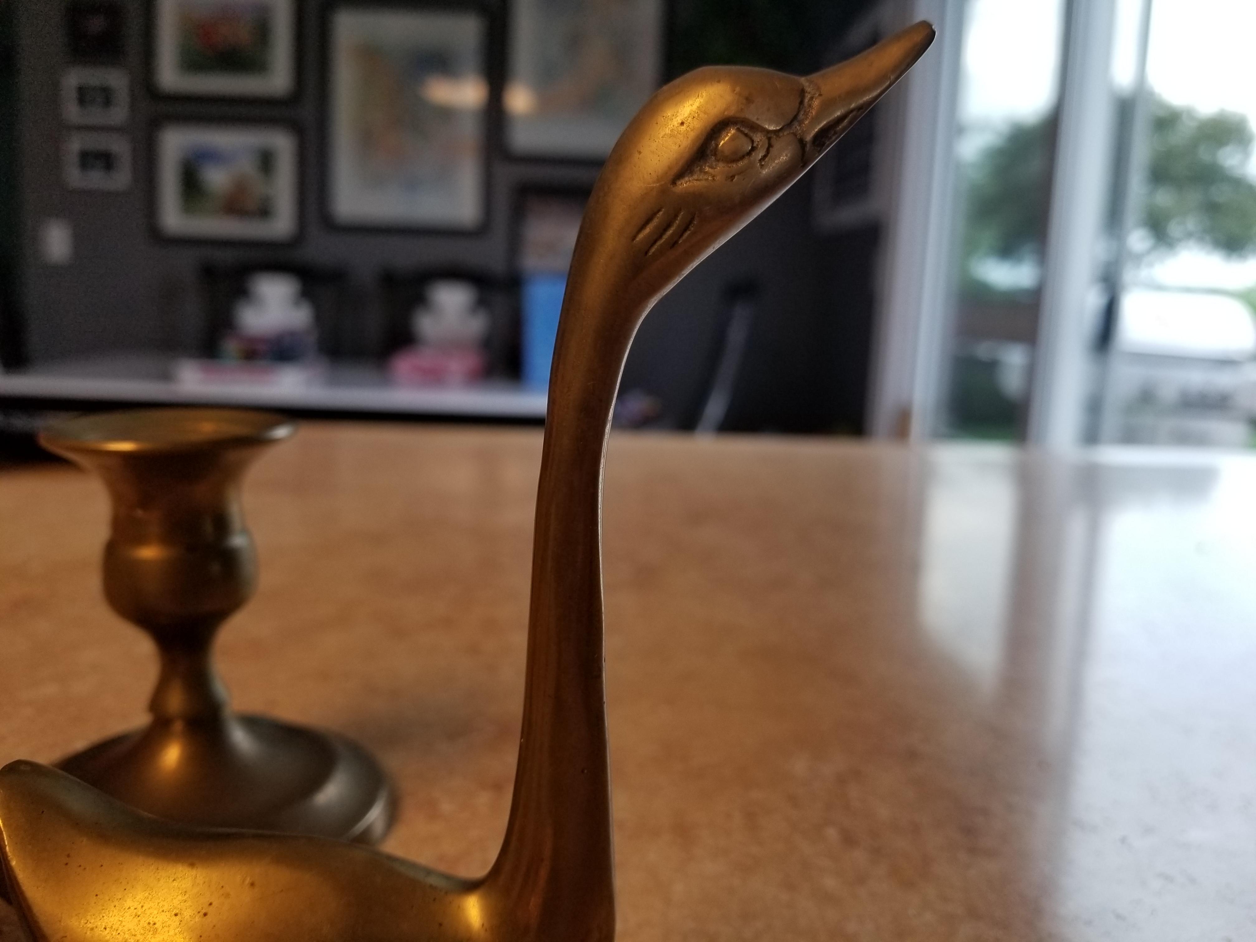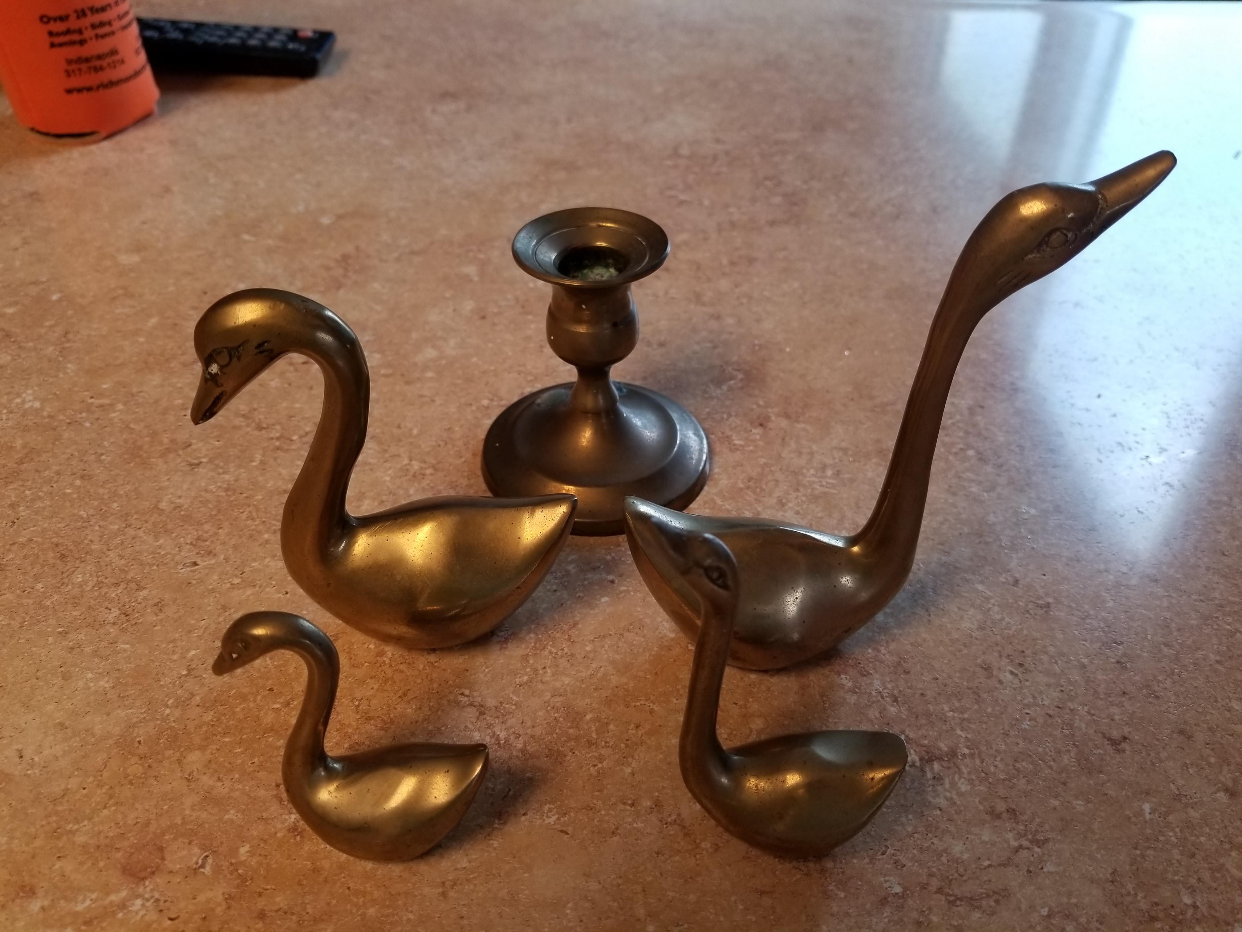 Solid brass Swans with two brass candle holders. I could only find one candle at this time. Sure i have the other one. I found no markings on the swans or candle holders. Thanks.