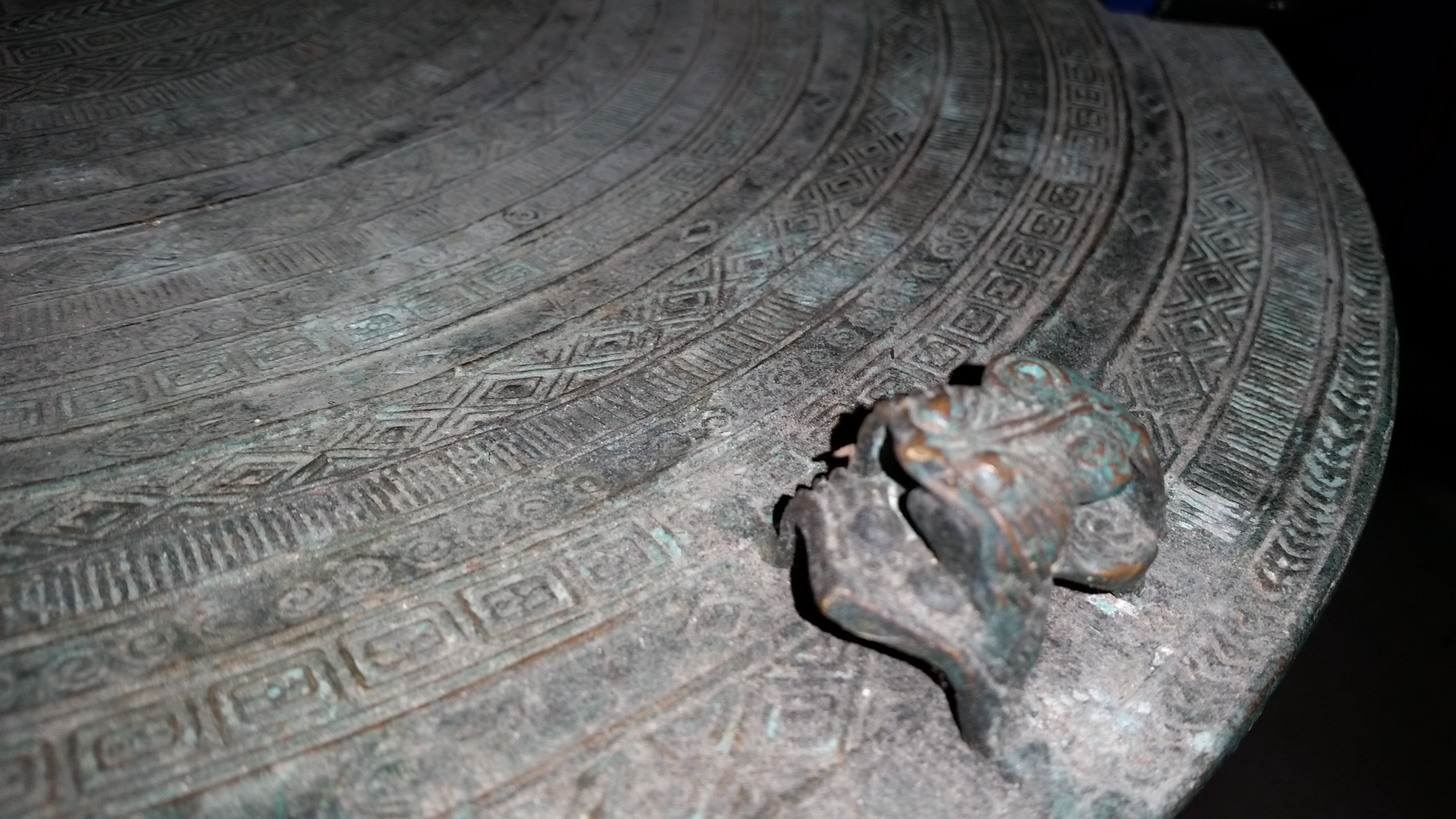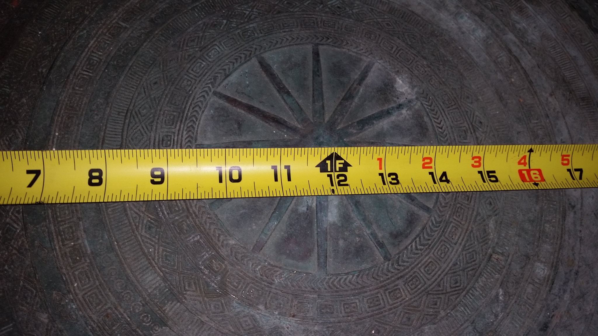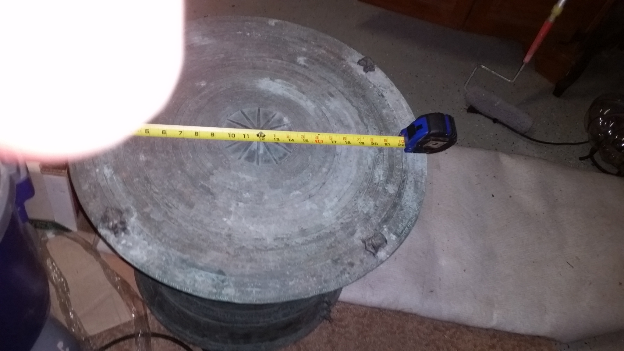 This table has a 15 inche base with a 24 inche top. It is made out of completely brass and it has some form of Asain writing on it. On top there is four raised upm frogs and on the side it as raised frogs allso. I bought it at a resale place about ten or so years ago