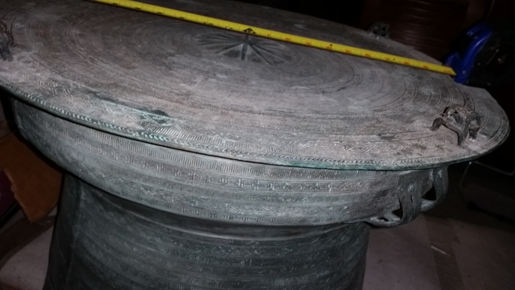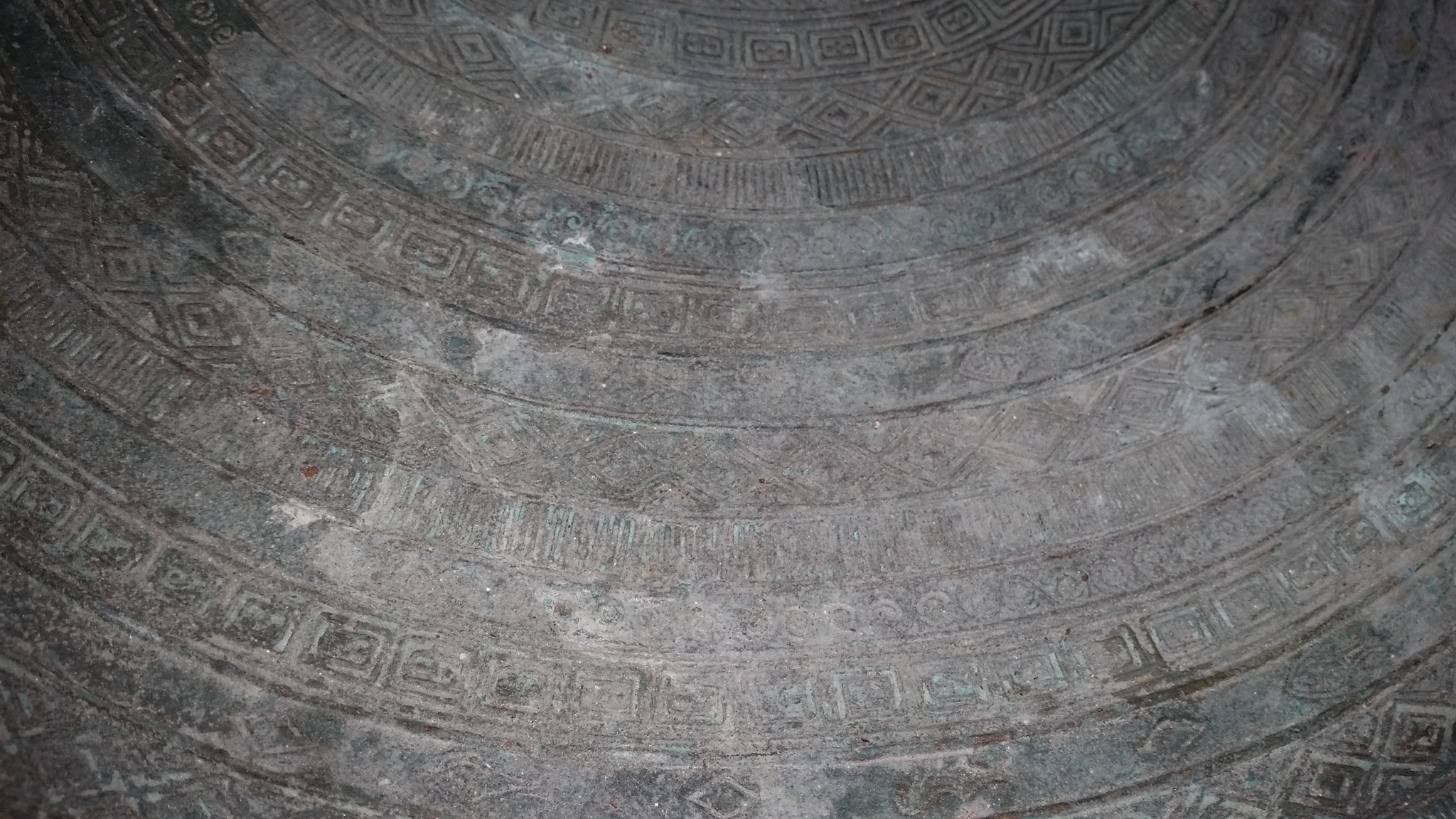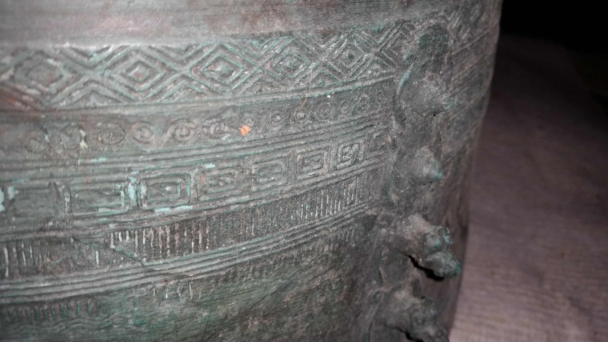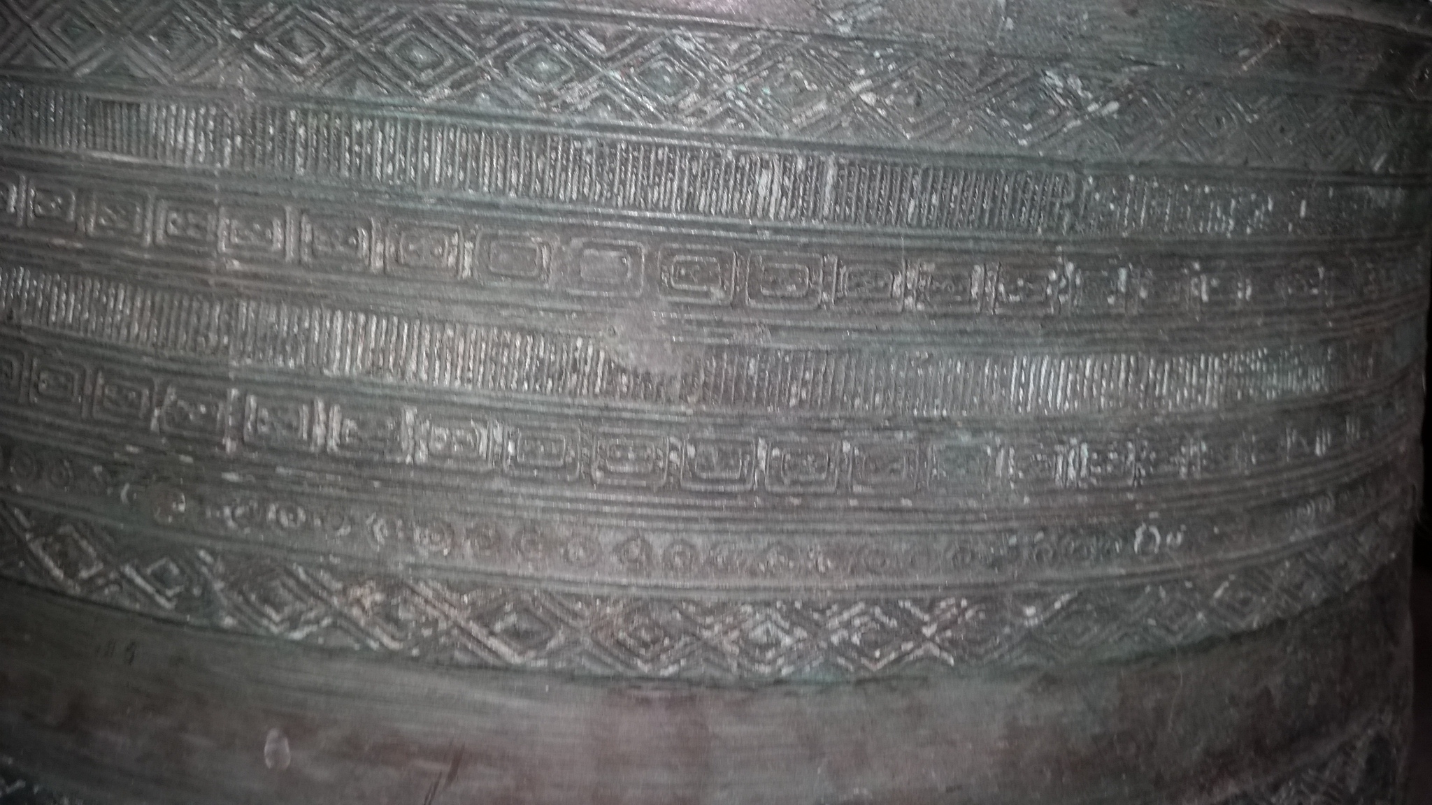 Distinguishing marks The whole piece has some form of writing on it. It has four raised frogs on top and two sets 180 degrees on side.It all so has a couple of handles on it I think
