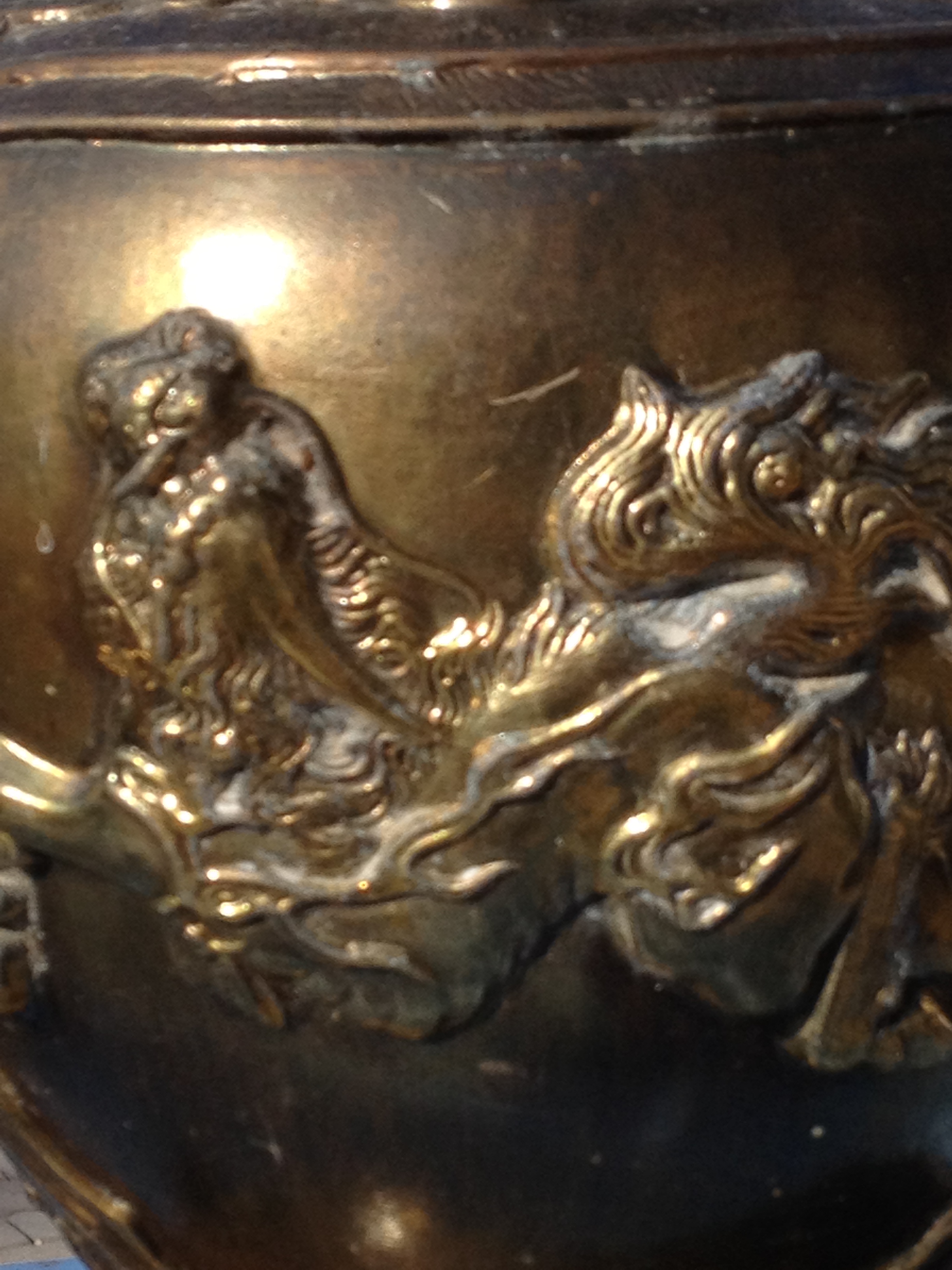 Item is a brass/bronze table lamp. It has carvings/etchings raised on the exterior surface.
