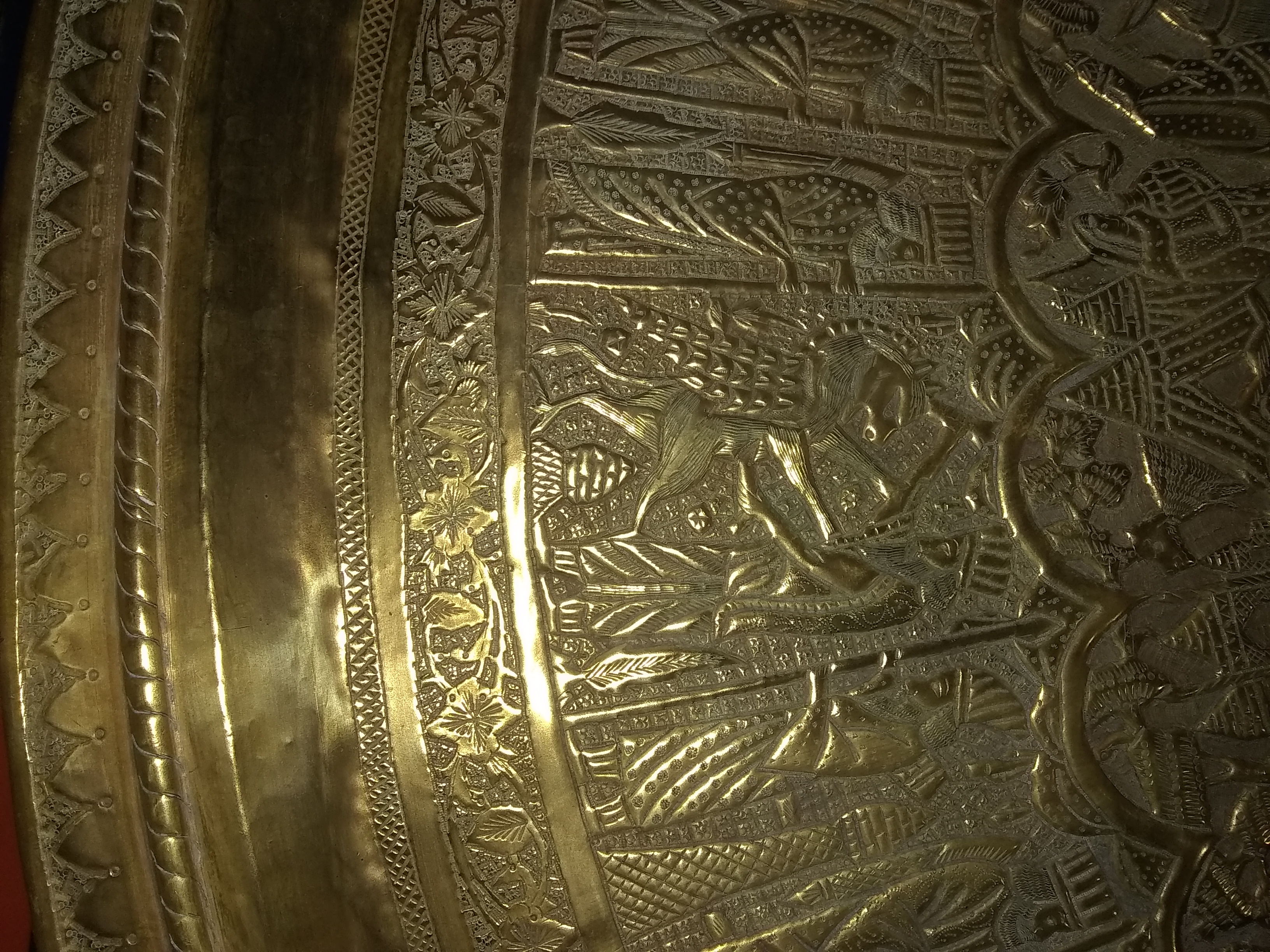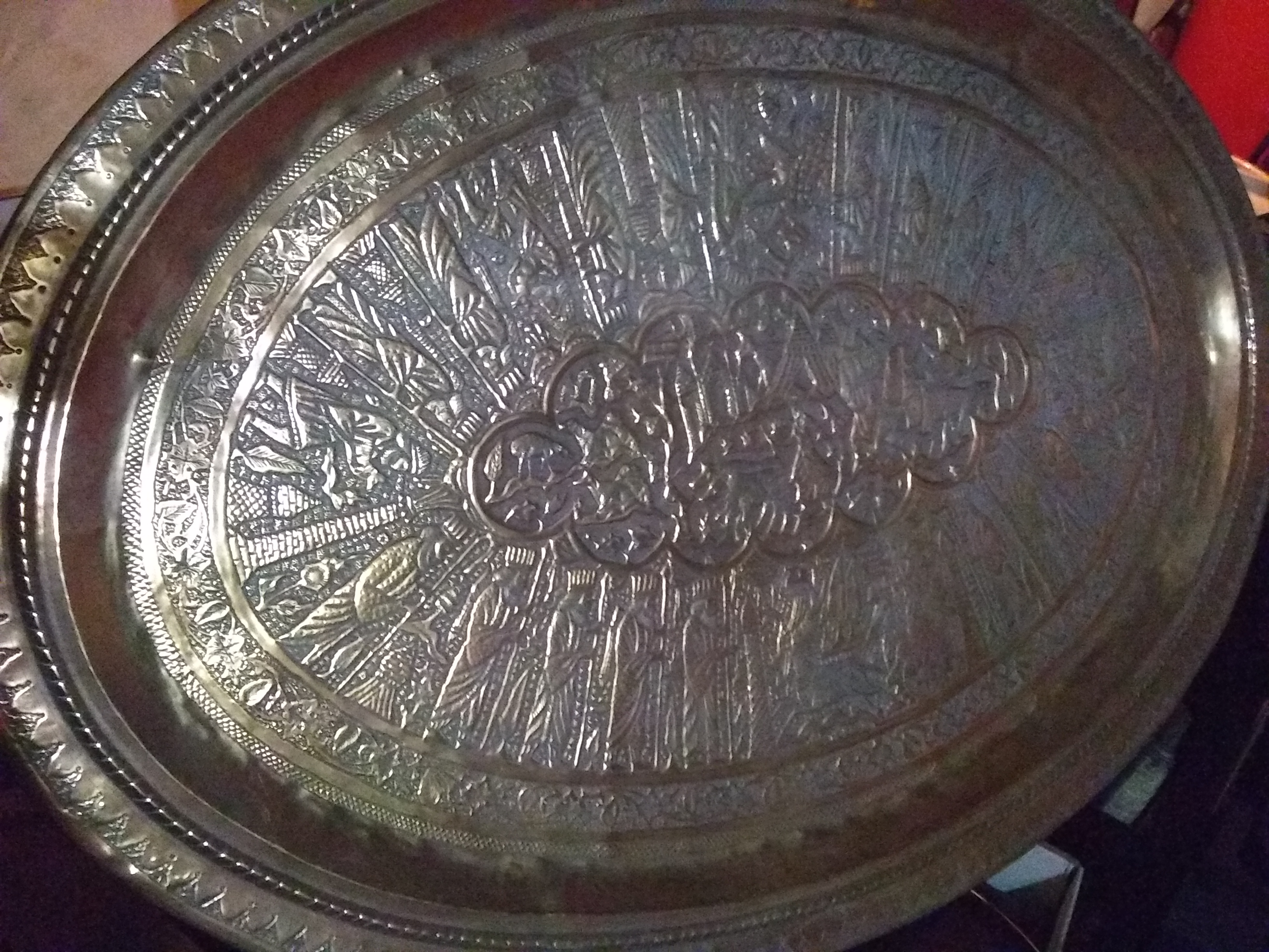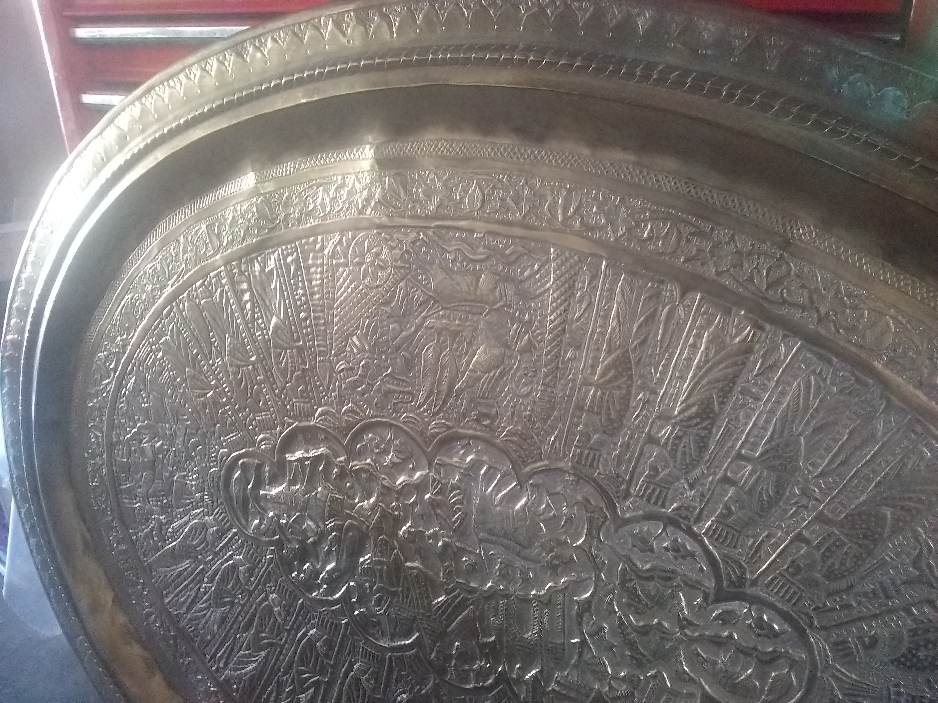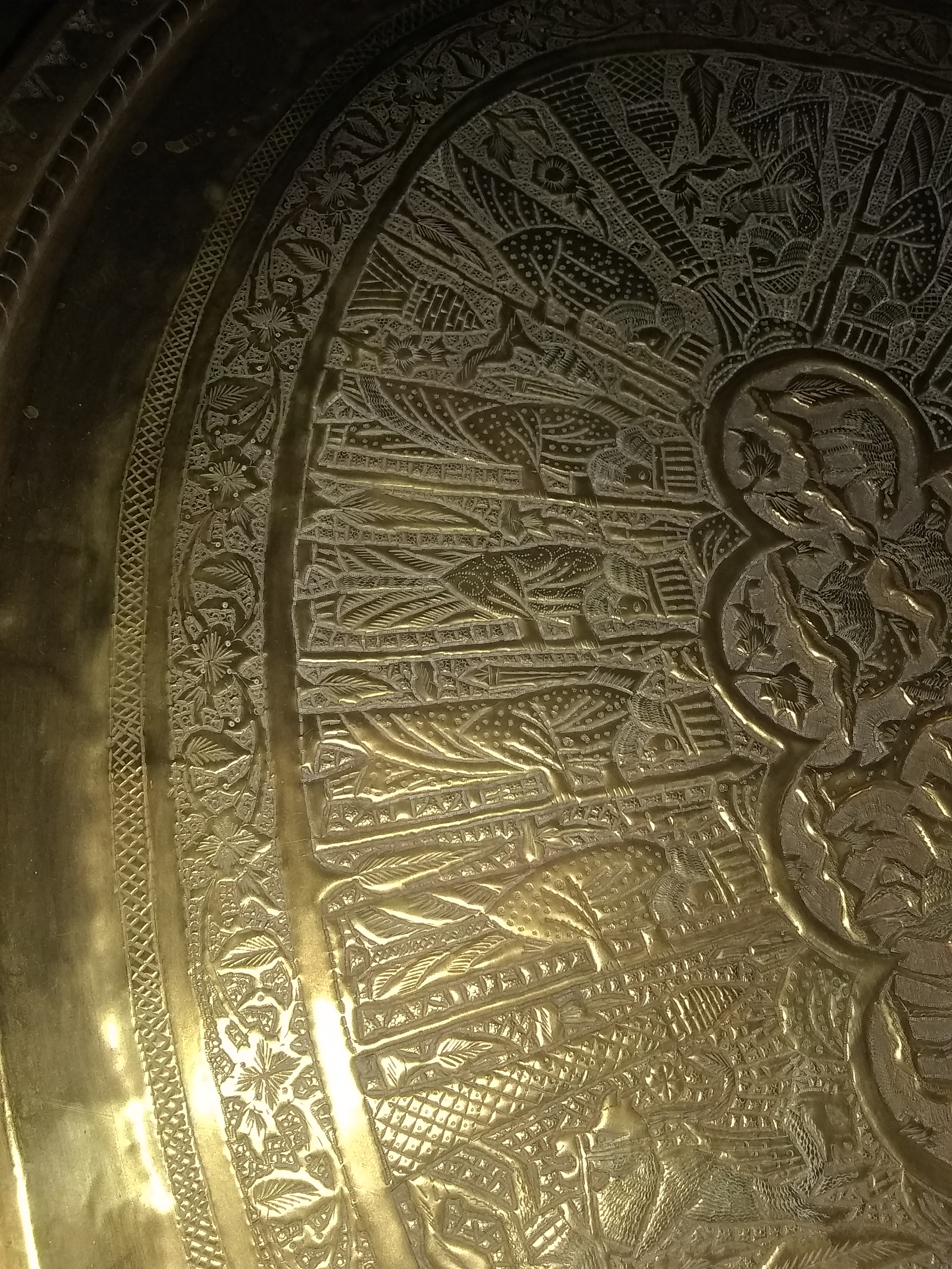 The brass tray looks hand engraved, I would guess middle eastern.it seems to tell a story going around with a Griffen type mixed animal.