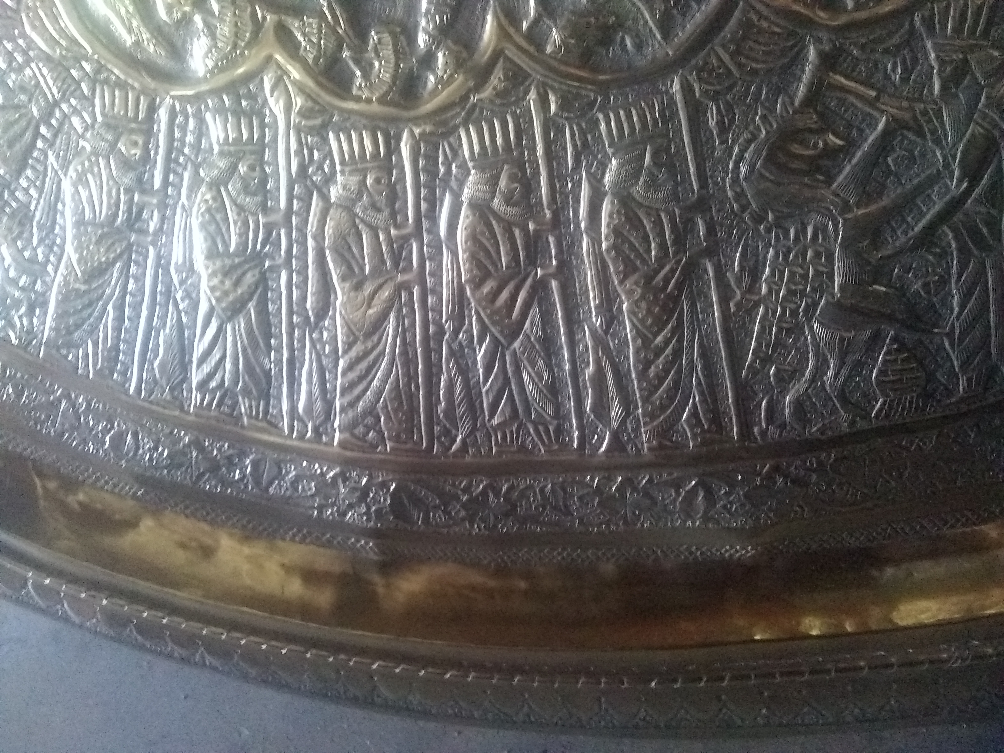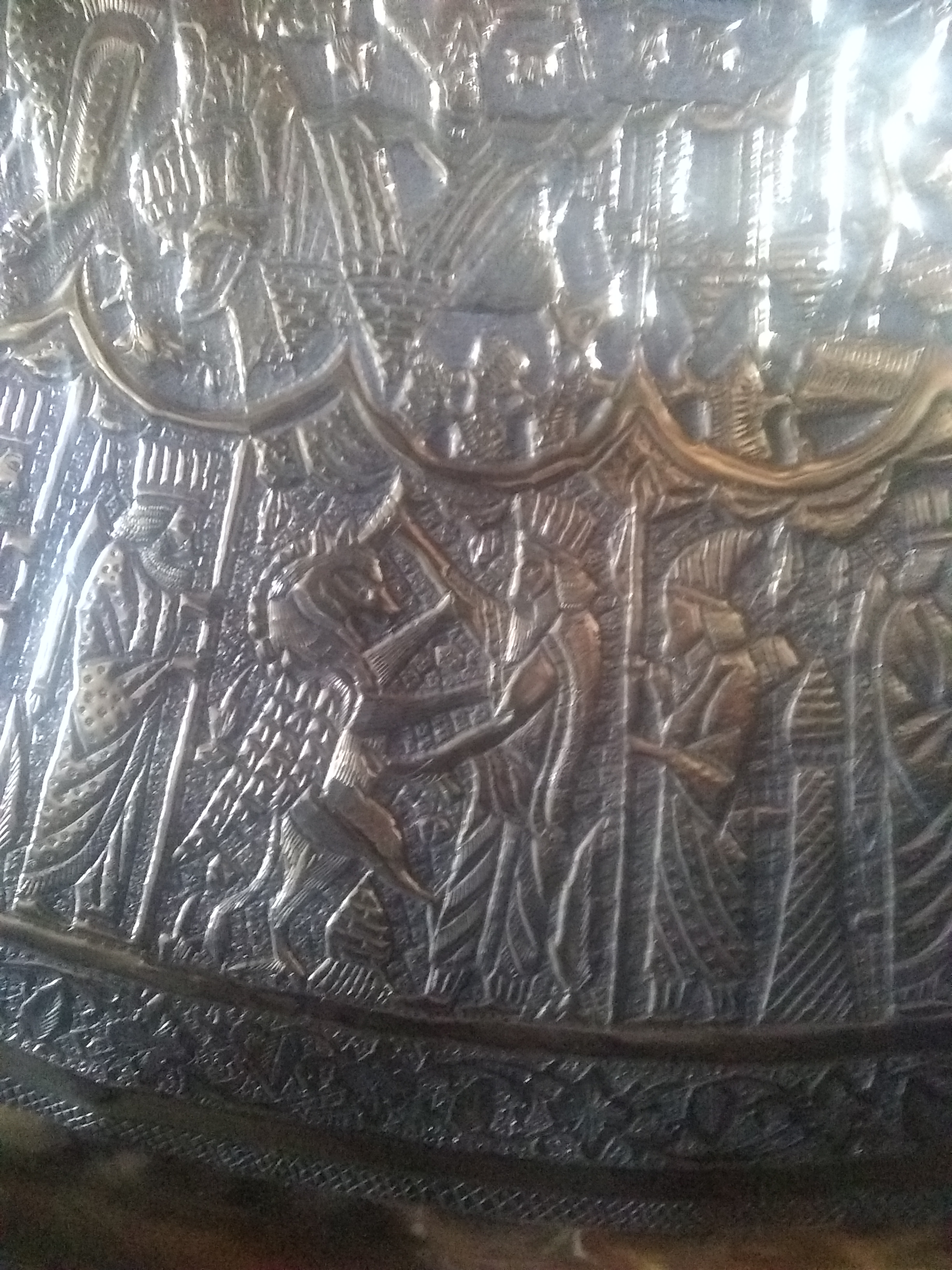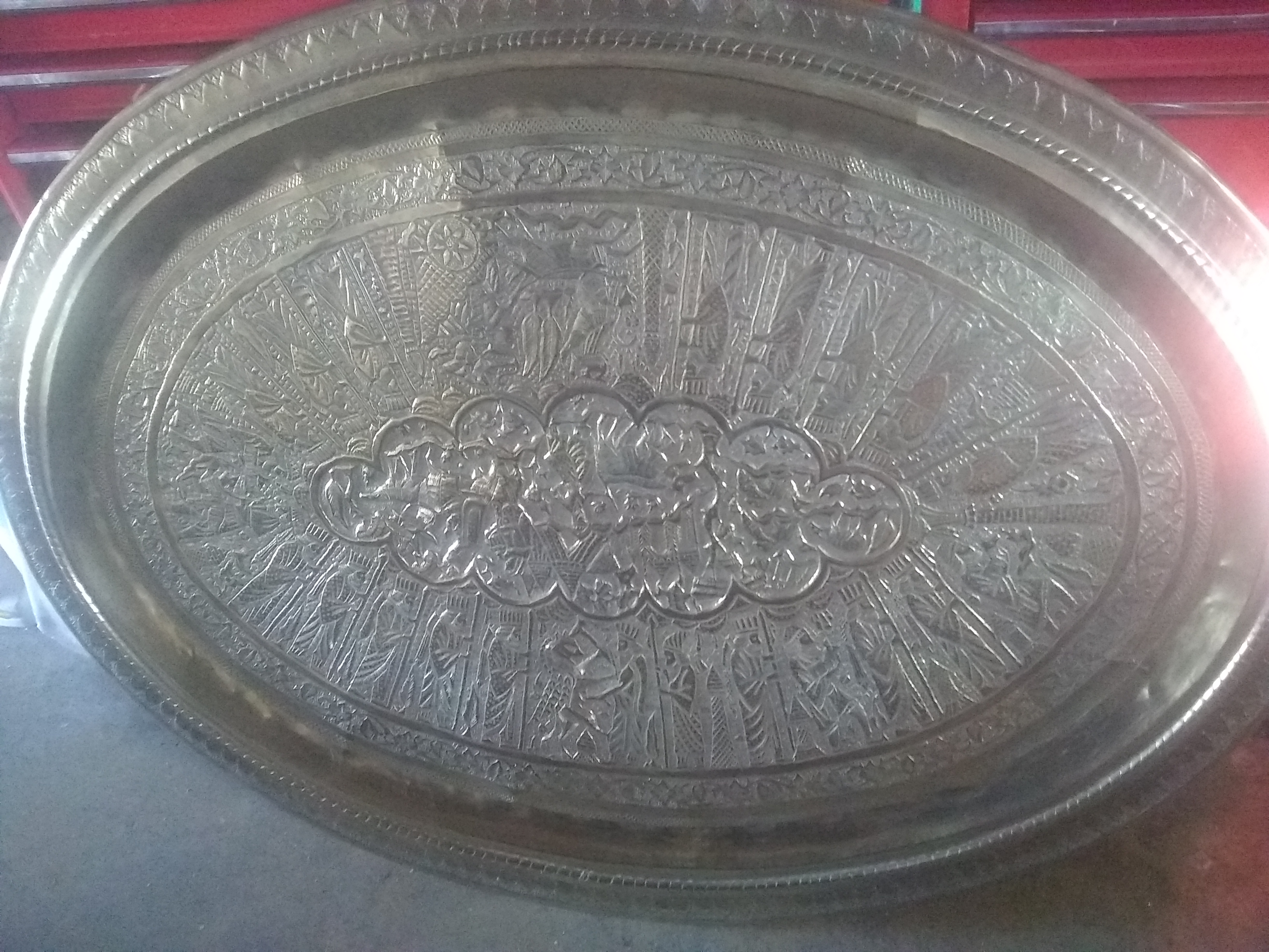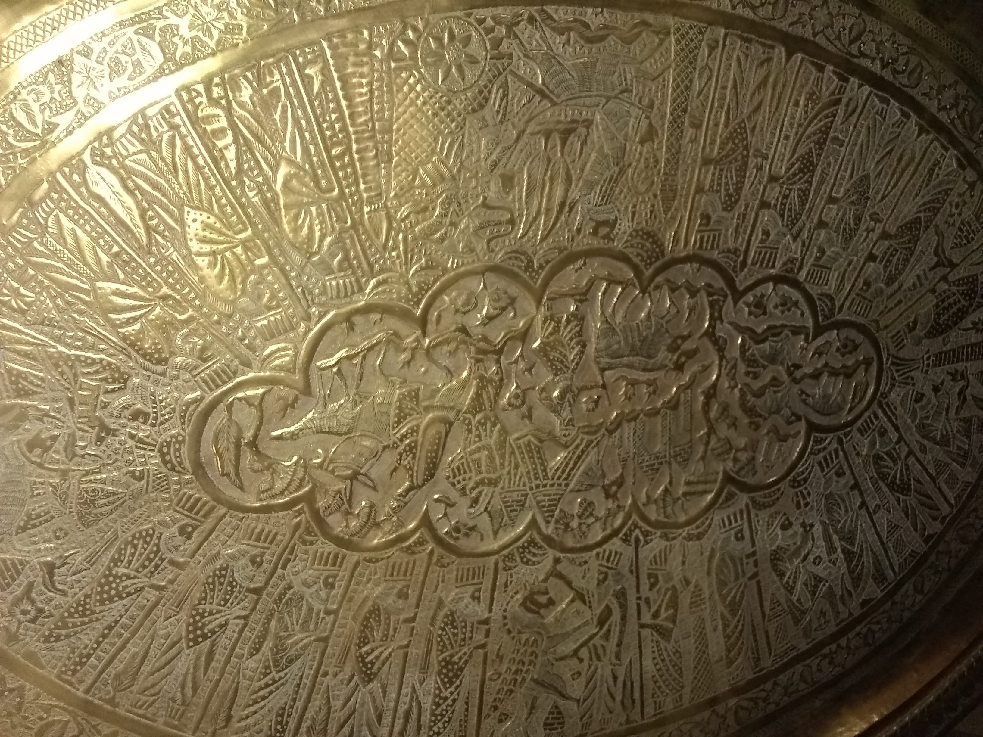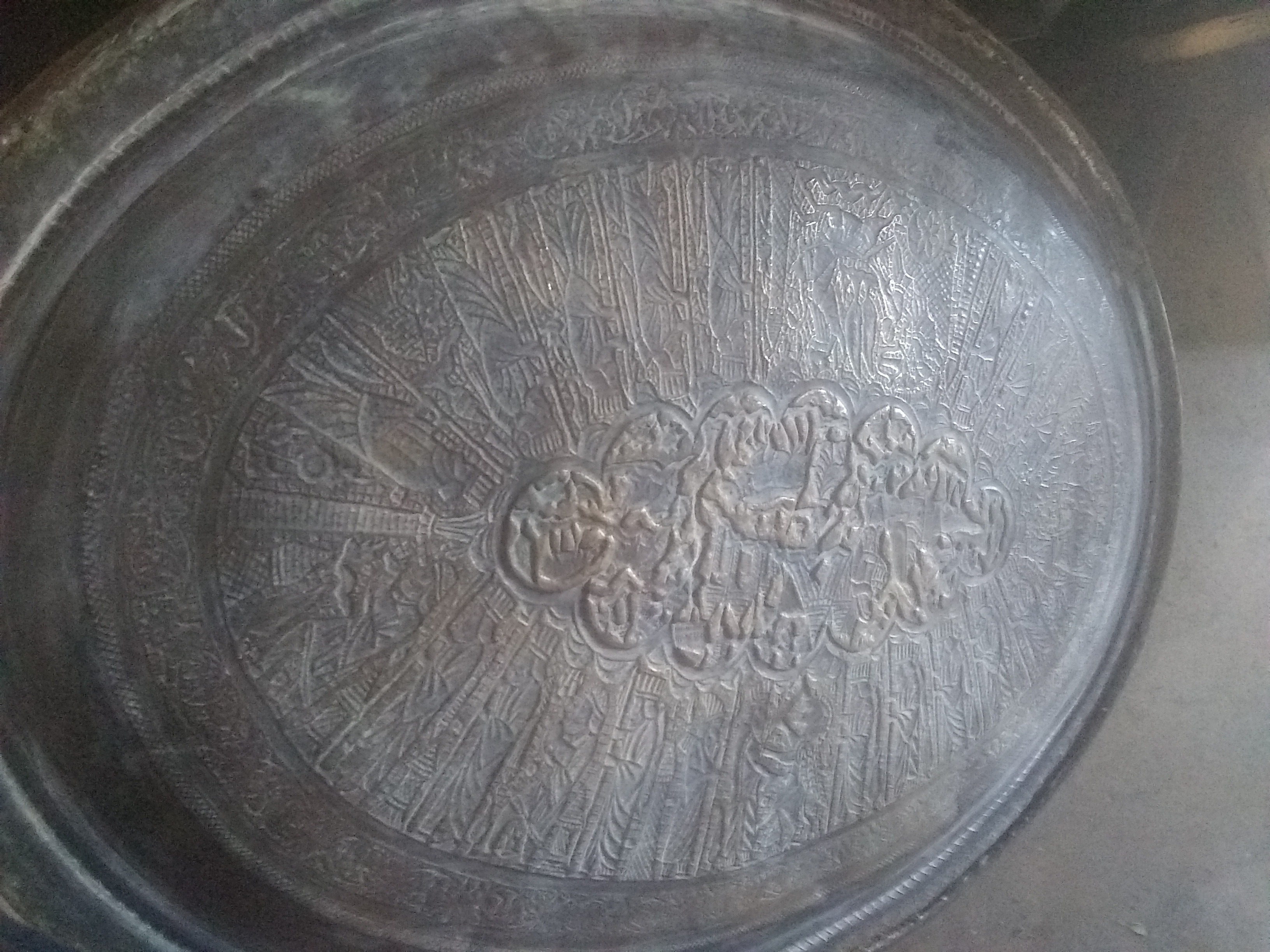 The brass tray looks hand engraved, I would guess middle eastern.it seems to tell a story going around with a Griffen type mixed animal.