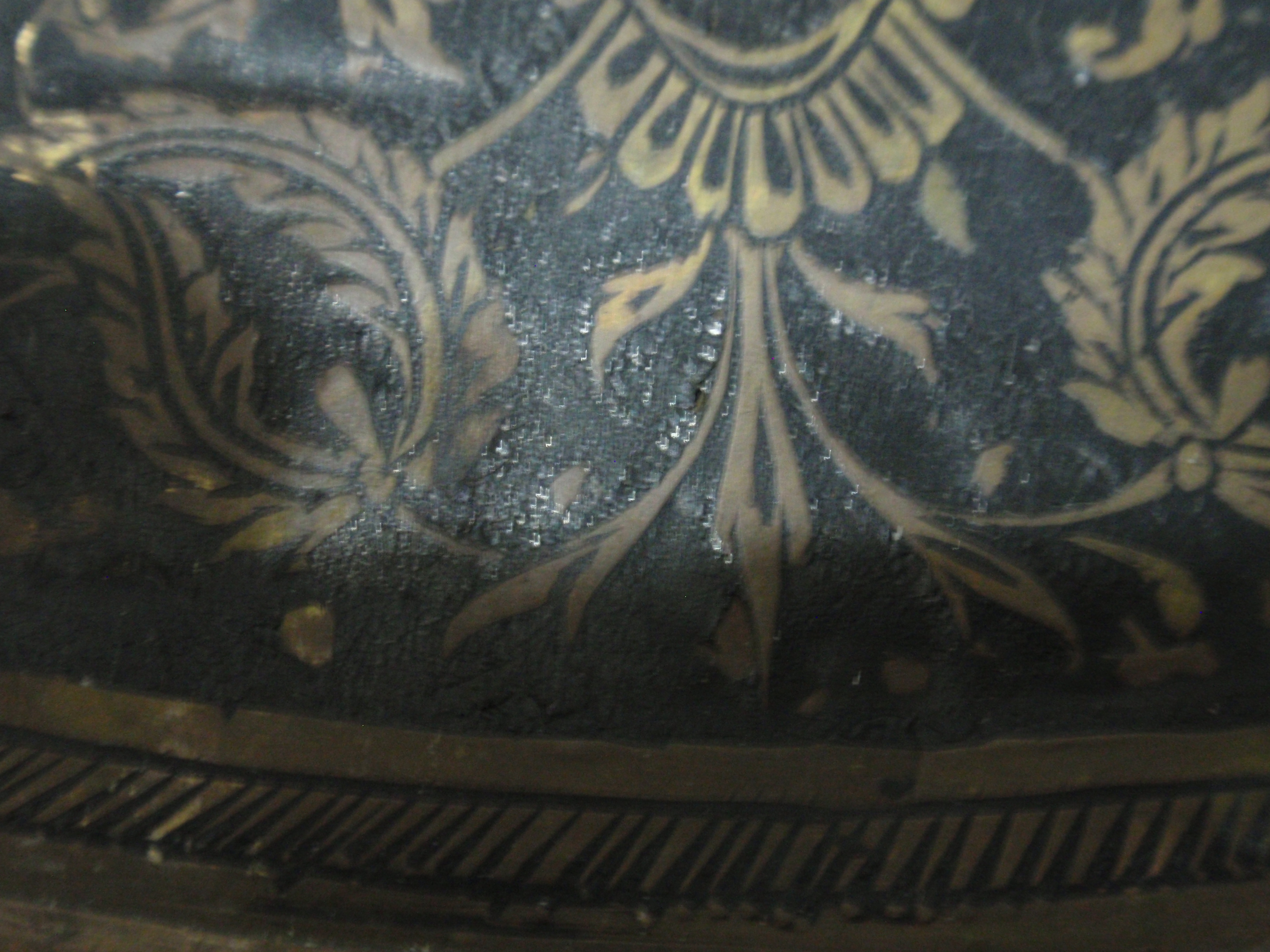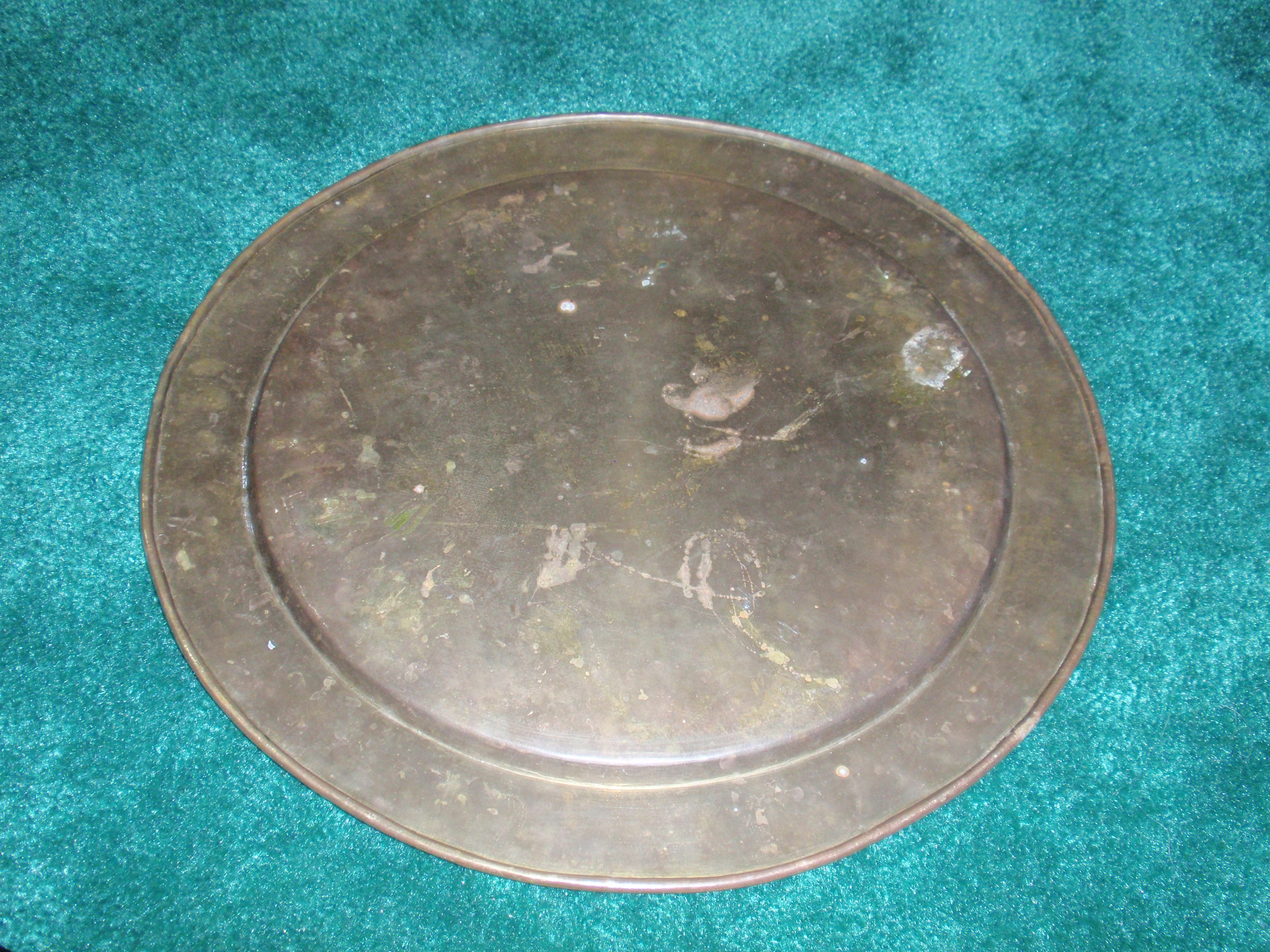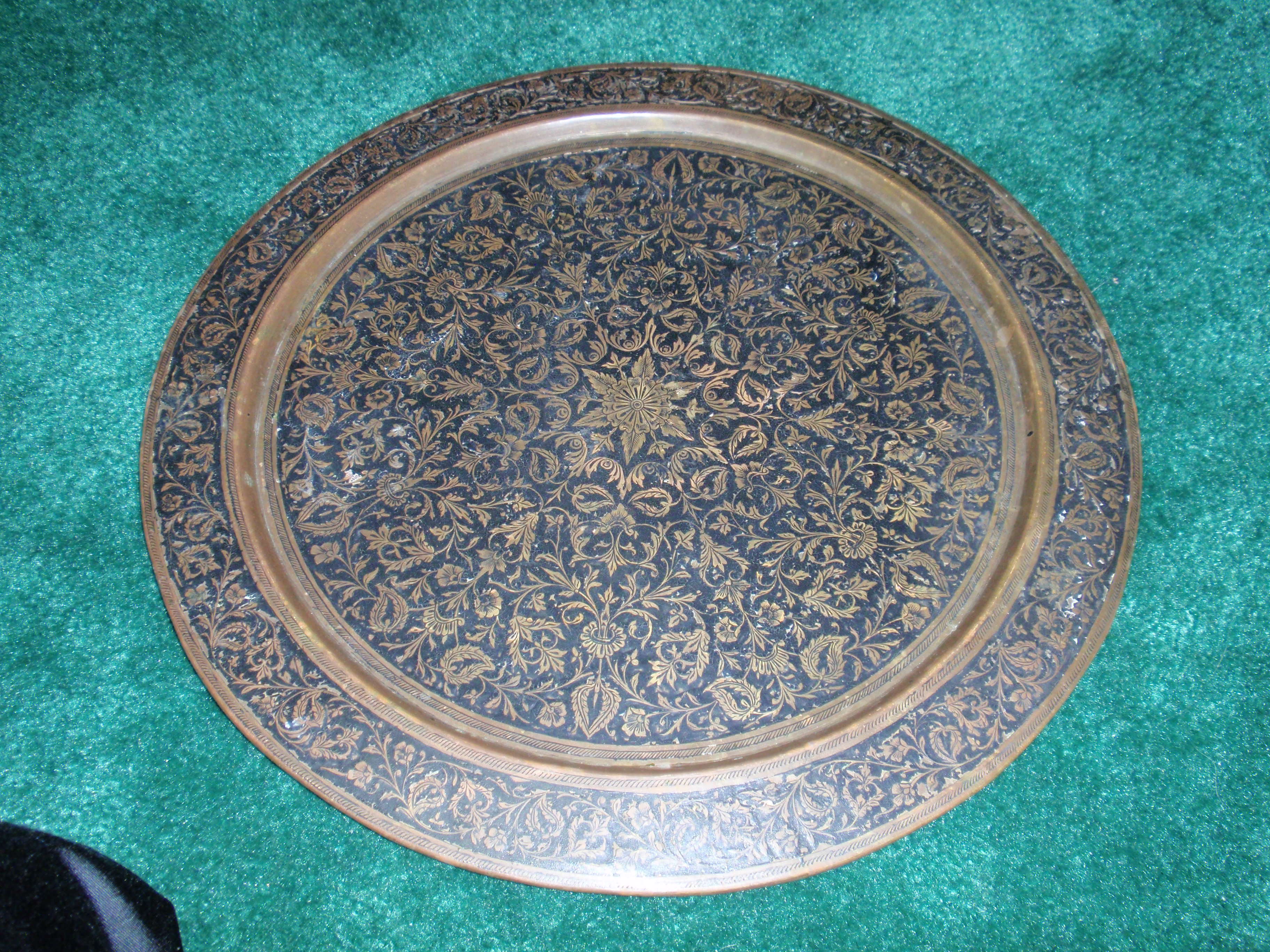 This appears to be a brass tray with carved figures mostly of flowers and between the flowers painted with black enamel or paint.
