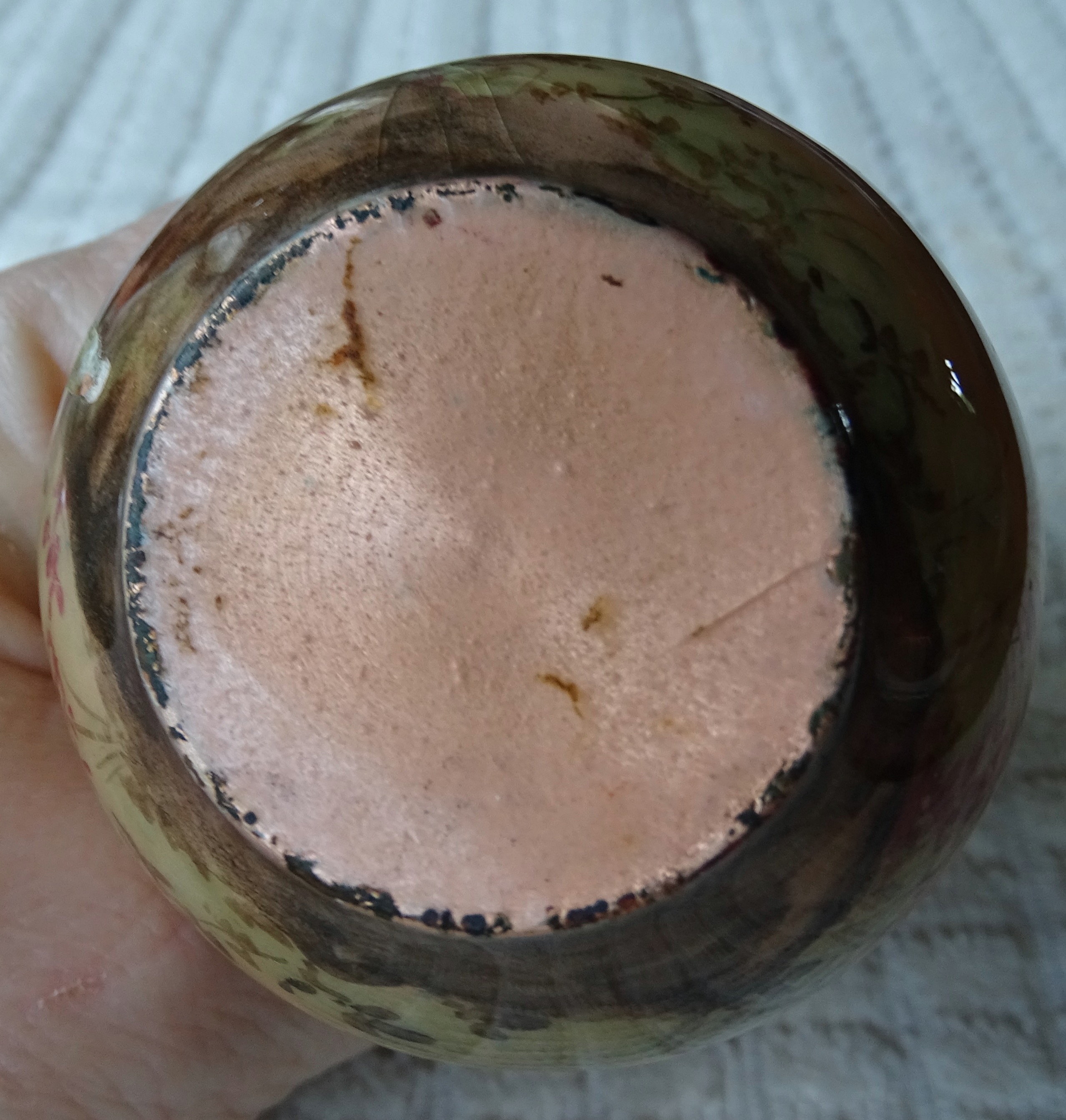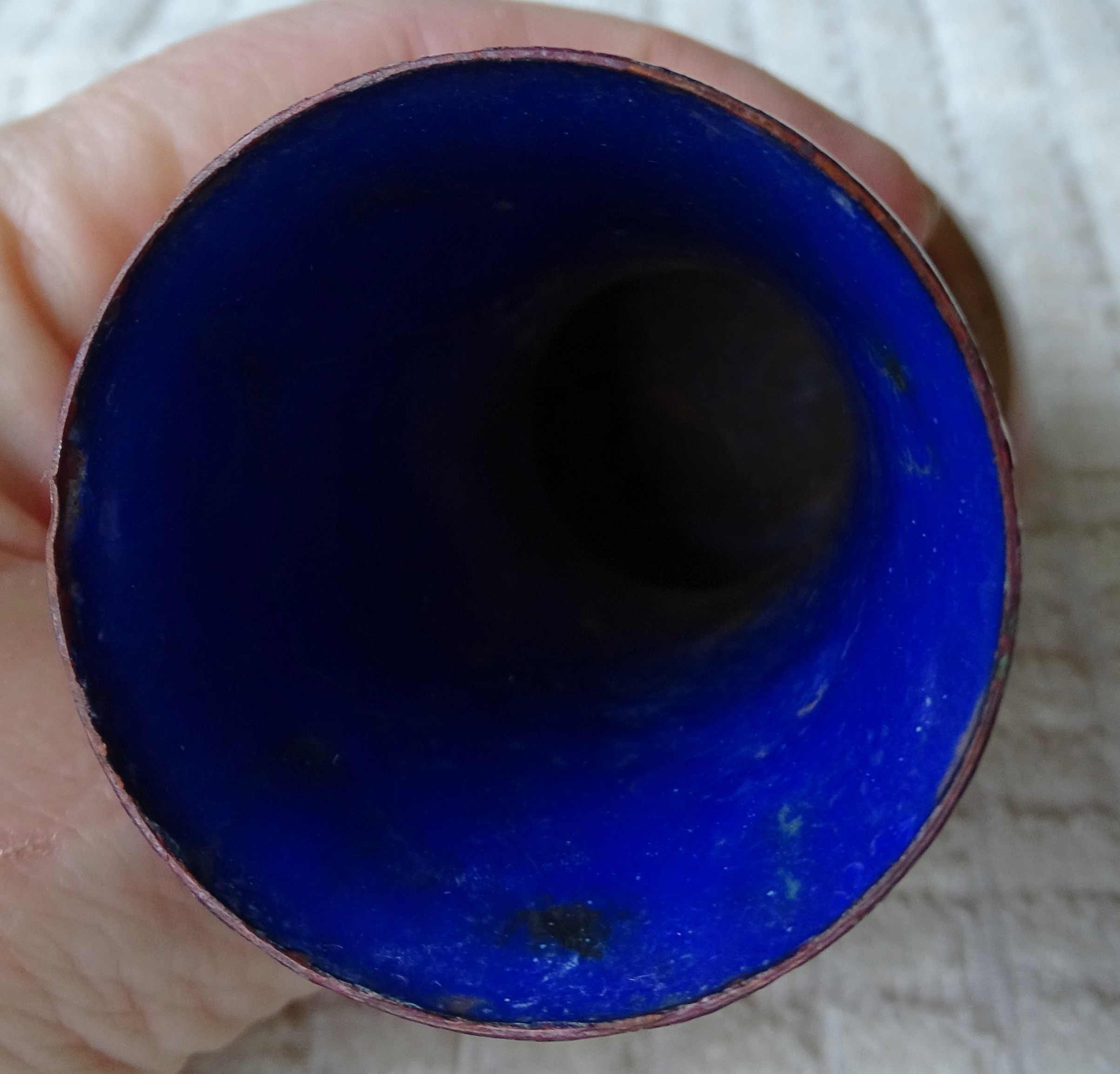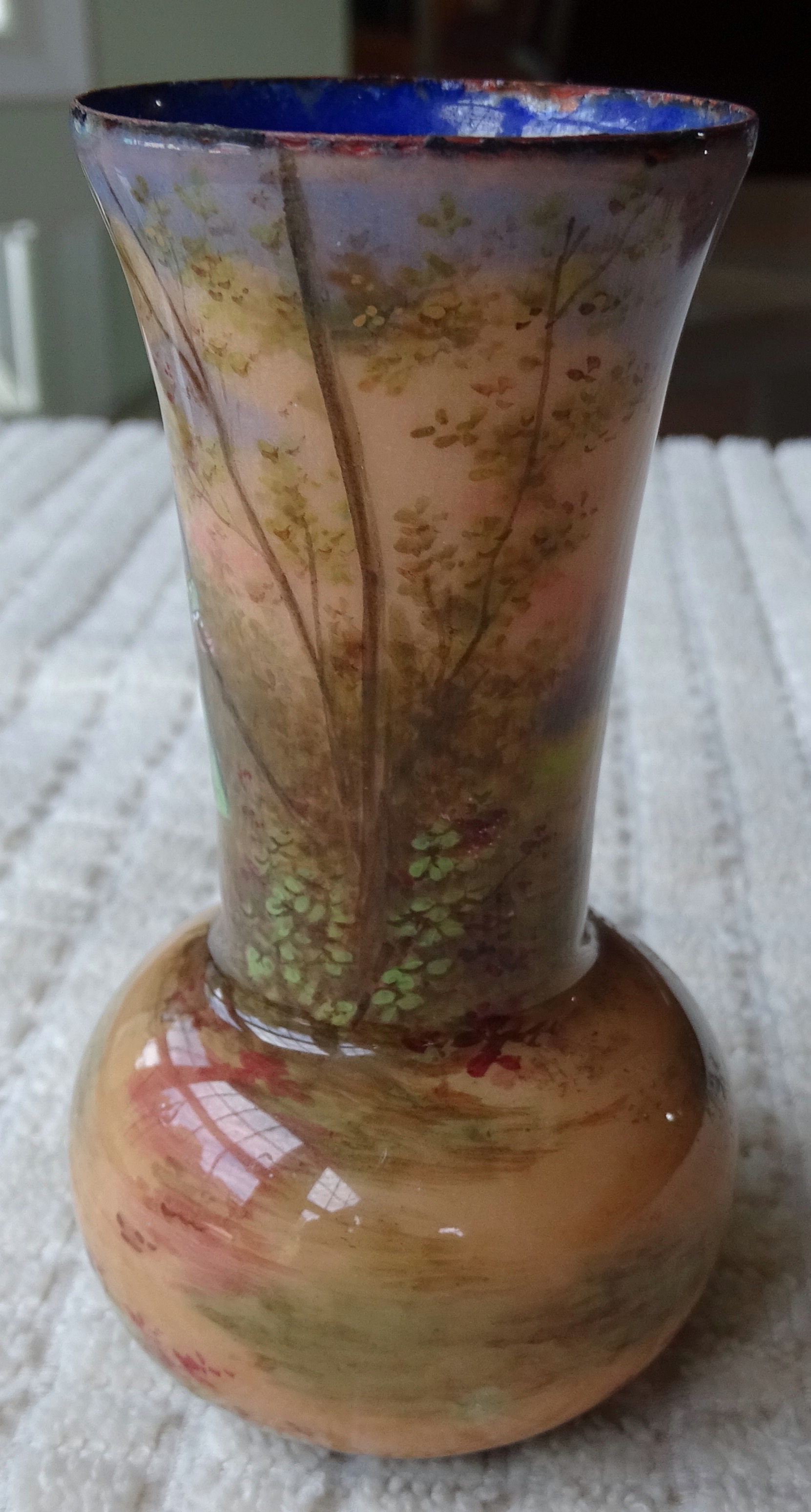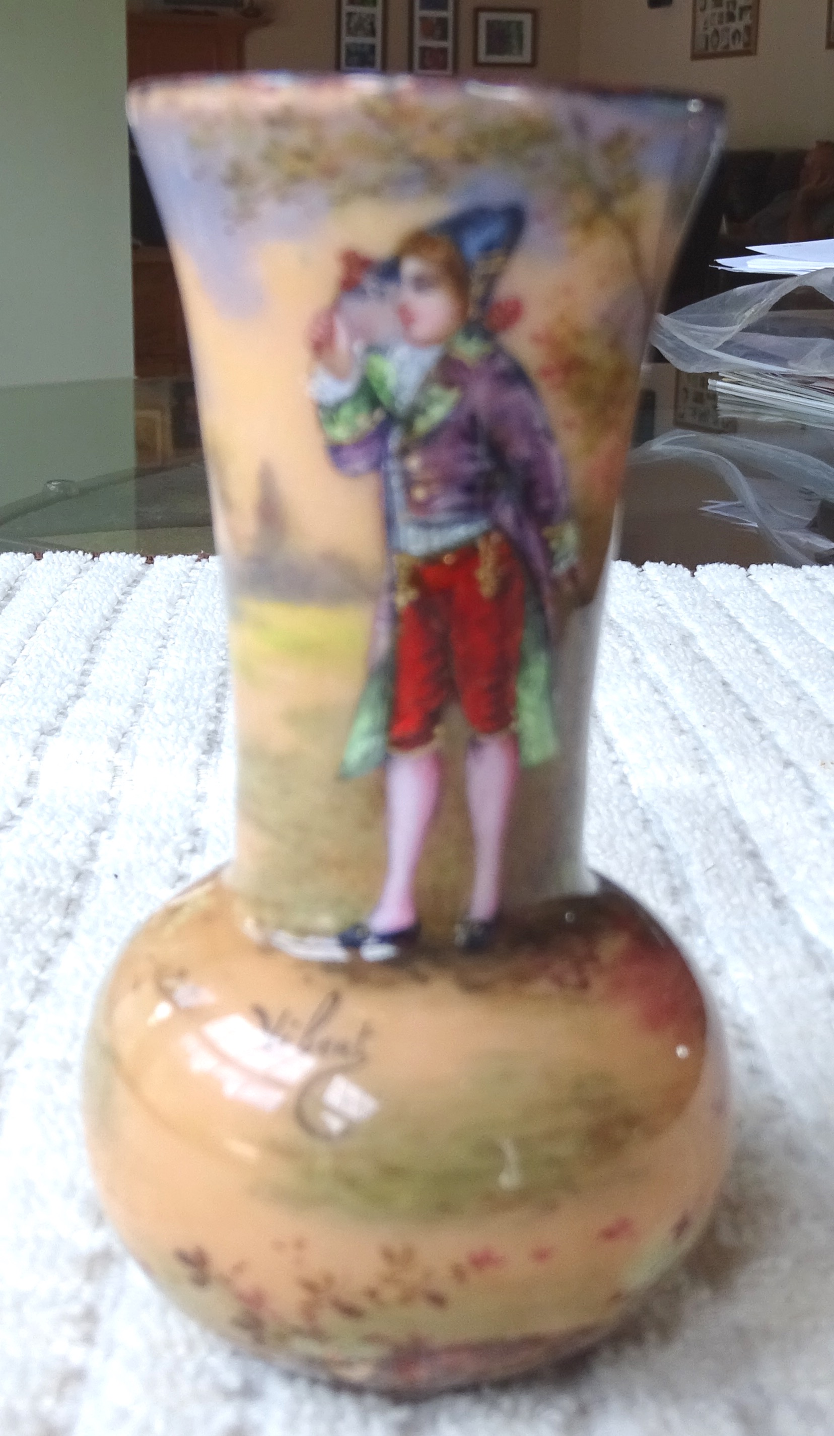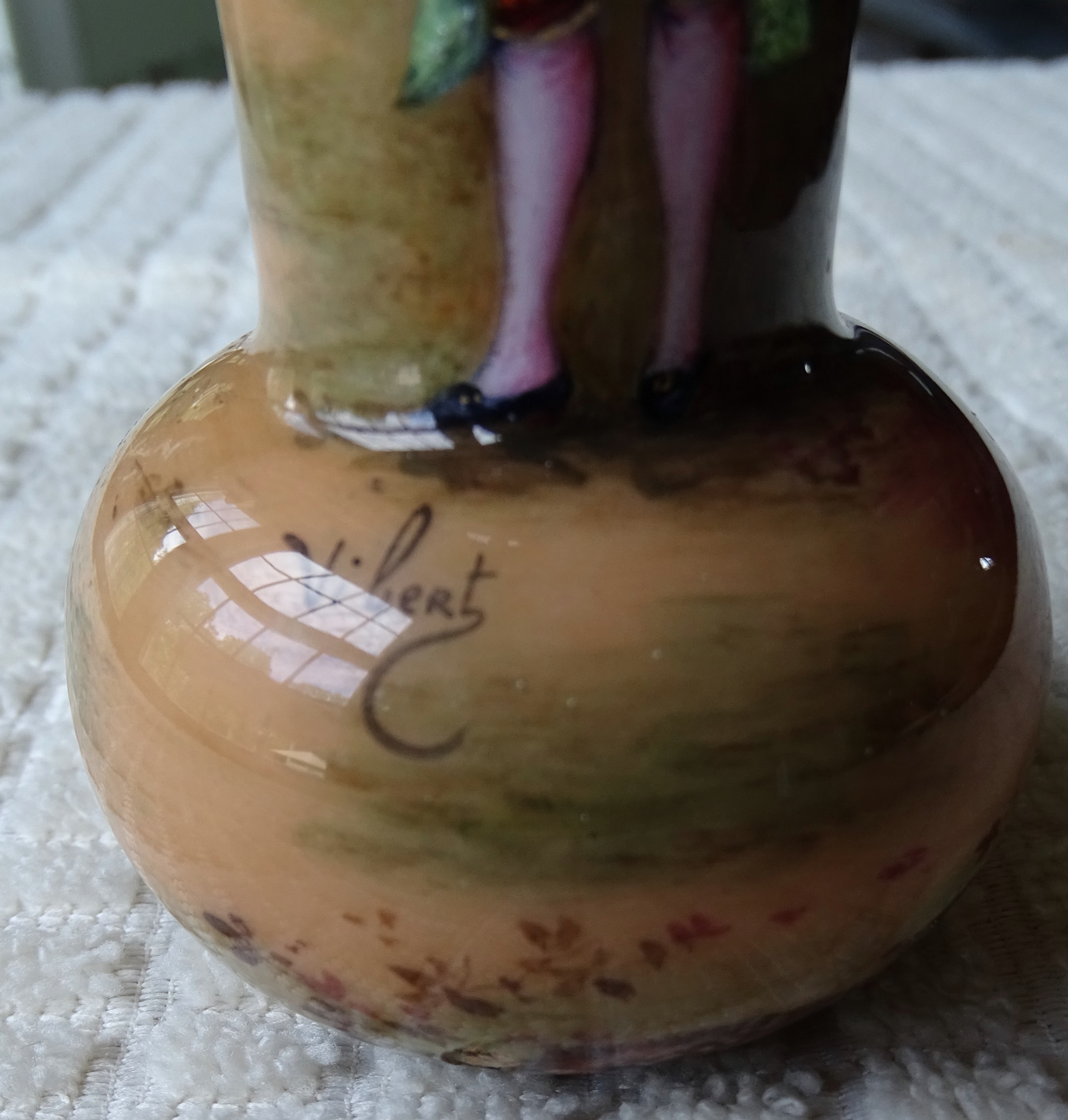 Small copper vase with painting of man appears english and signed by Vibert