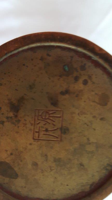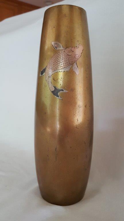 This was donated to me for church auction by people in their 90's who acquired this through their worldly travels. It weighs about a pound and a half and measures 8 and 3/8ths inches tall. The top diameter is 1 and 7/8ths inches, and the bottom is 2 and 2/8ths inches. The surface is smooth but has some slight, smooth indentations and all kinds of different colors from wear/patina. The fish has a cute look on his face and the markings on the bottom are interesting.